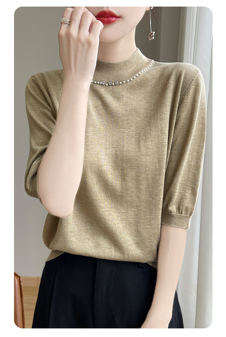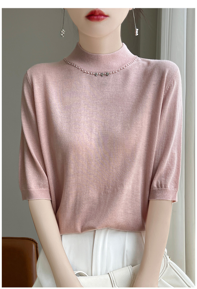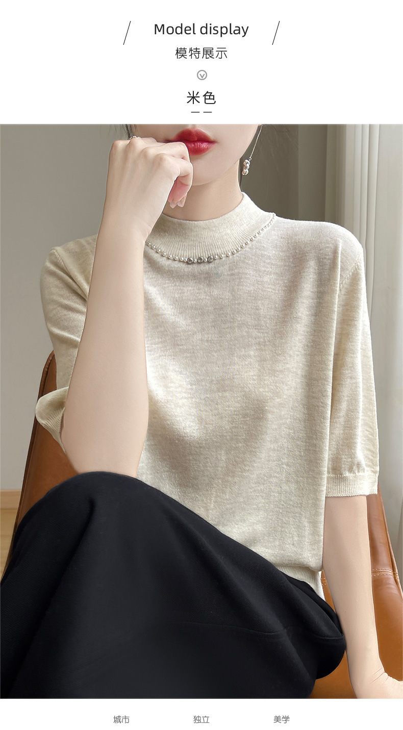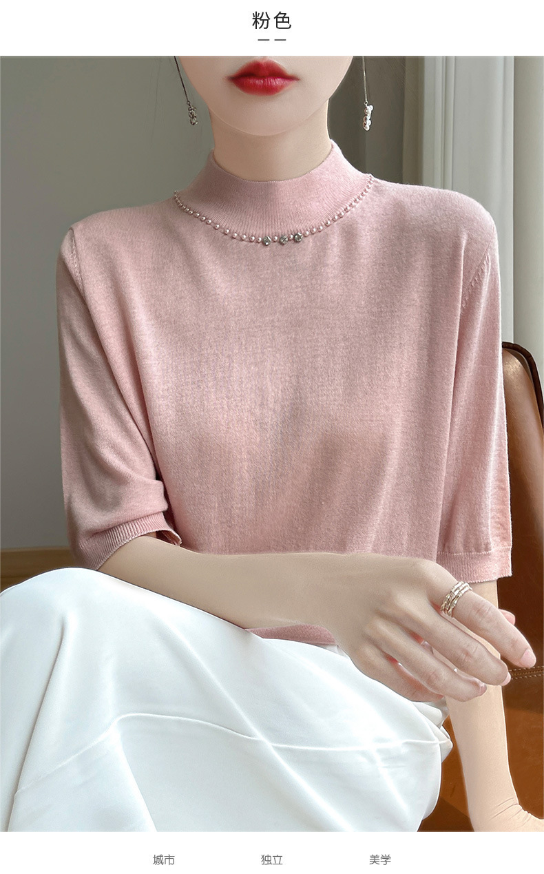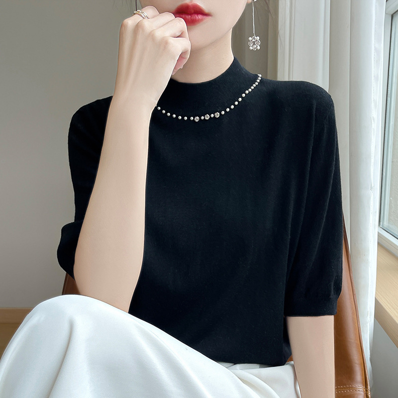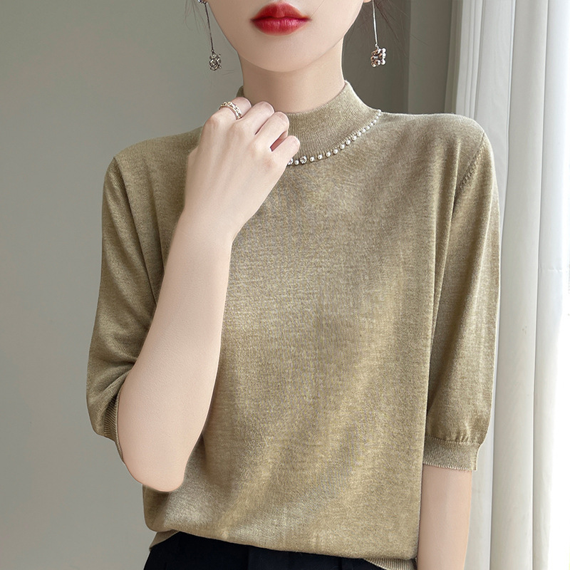 가벼운 럭셔리 니트 하프 하이 칼라 미드 슬리브 베이스 셔츠 여성의 가을 새로운 서양 스타일 내부 하프 슬리브 탑 니트 도매
