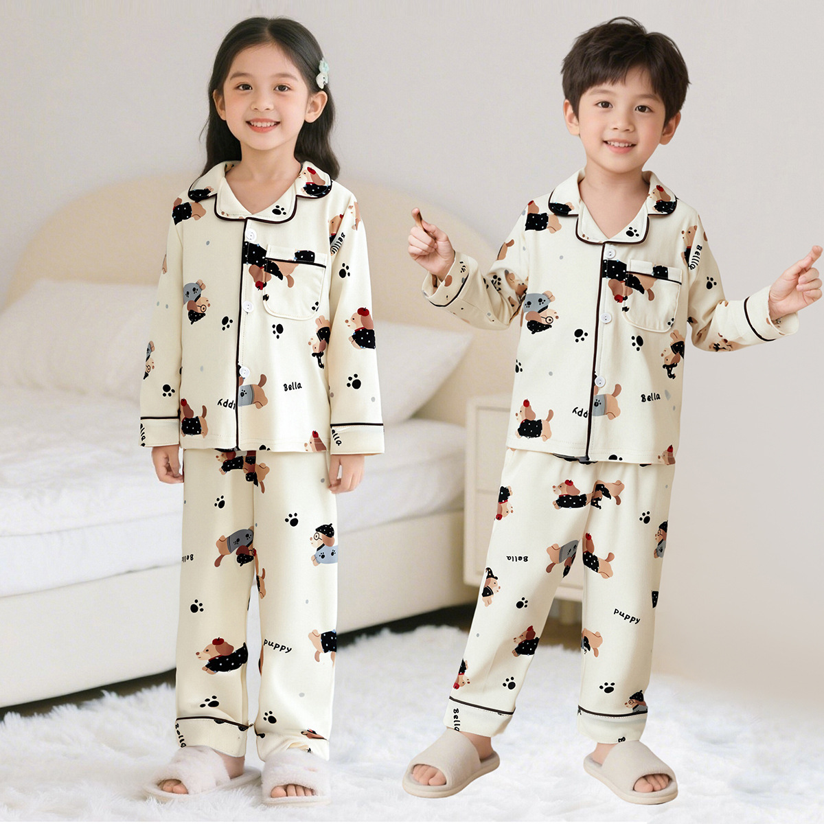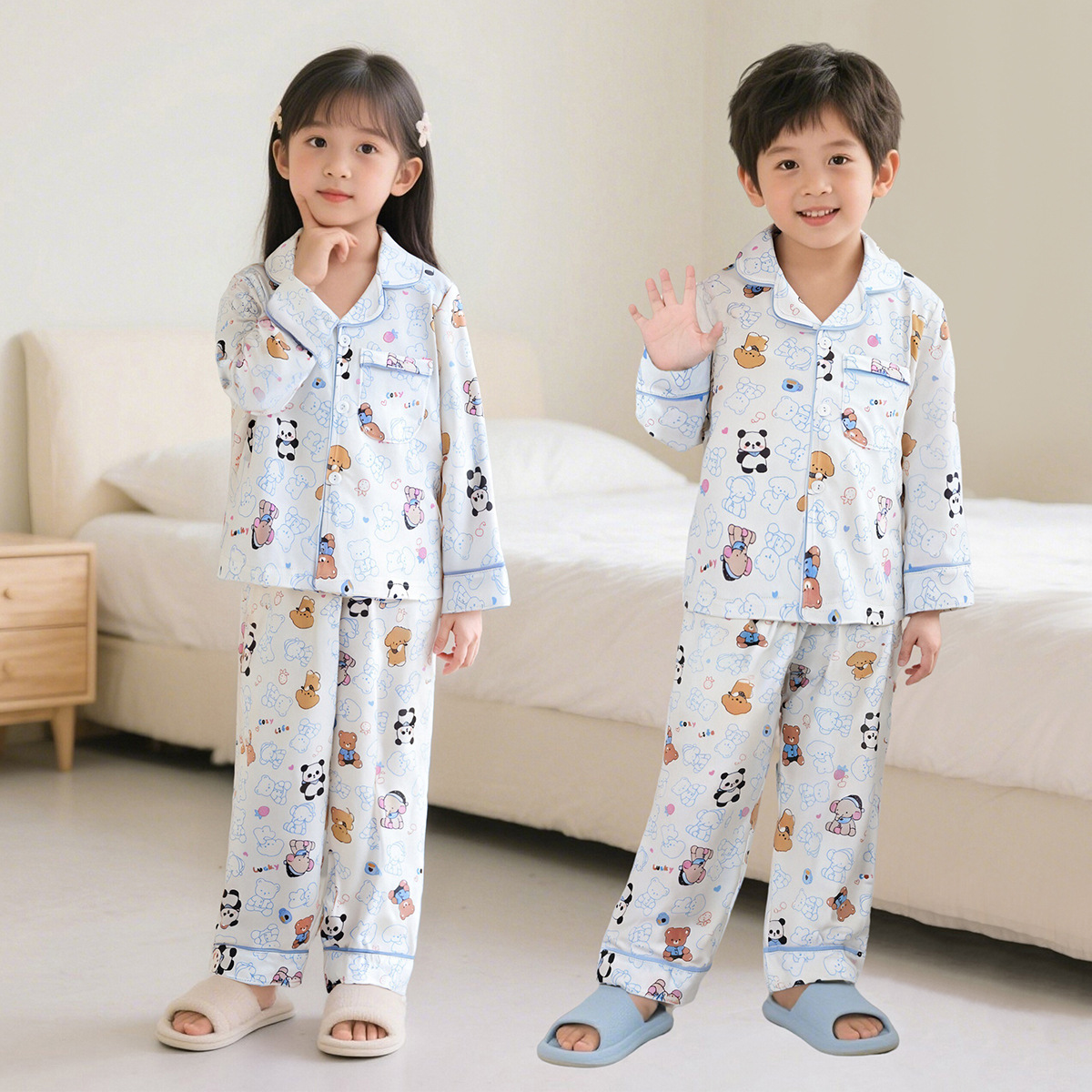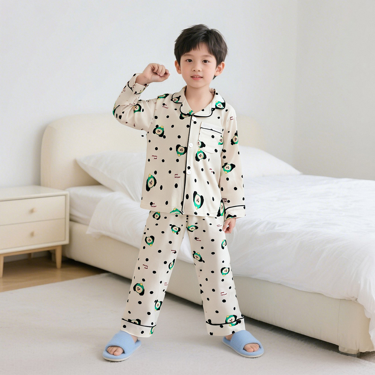 가을 겨울 신상 중대형 어린이 순면 코마사 홈웨어 카라 오픈형 카디건 어린이 잠옷 세트 단색 남녀 공용스토어 가기