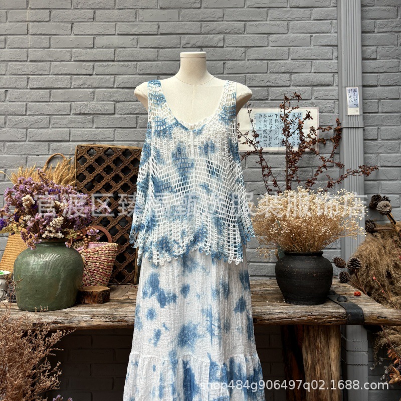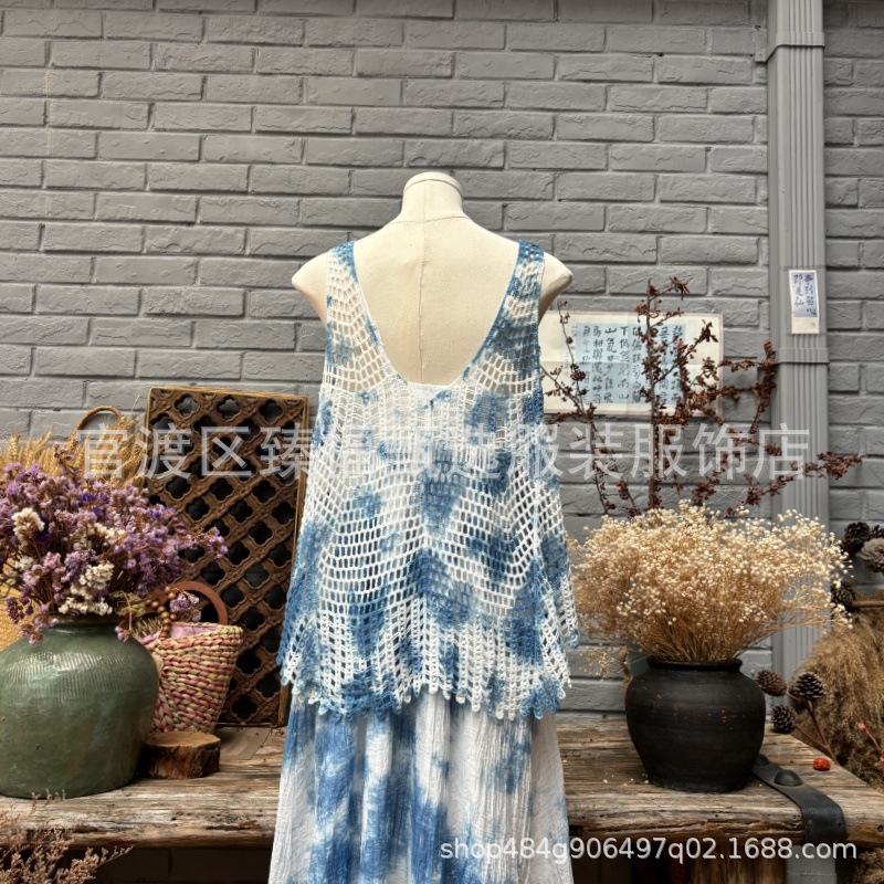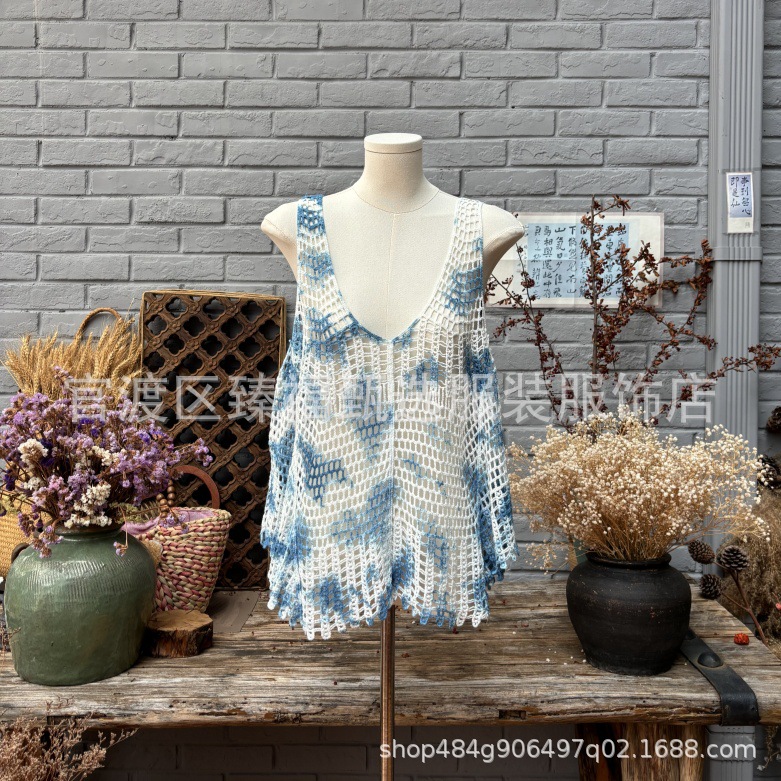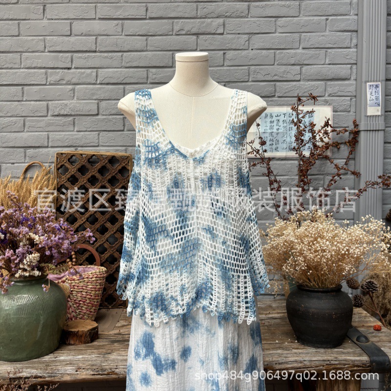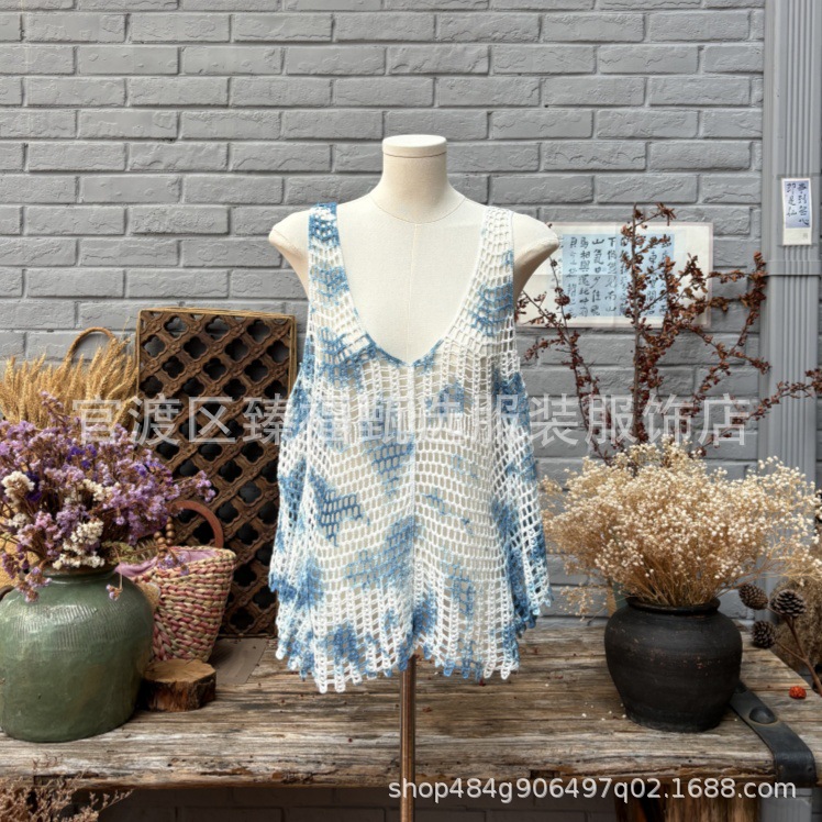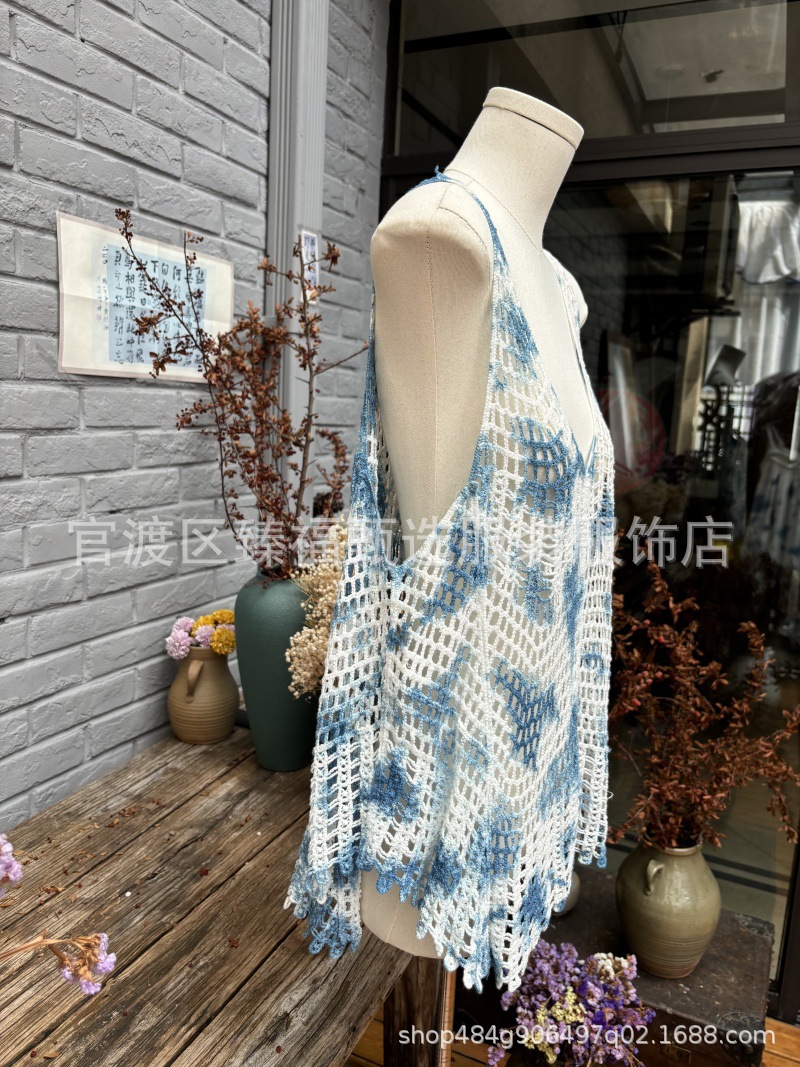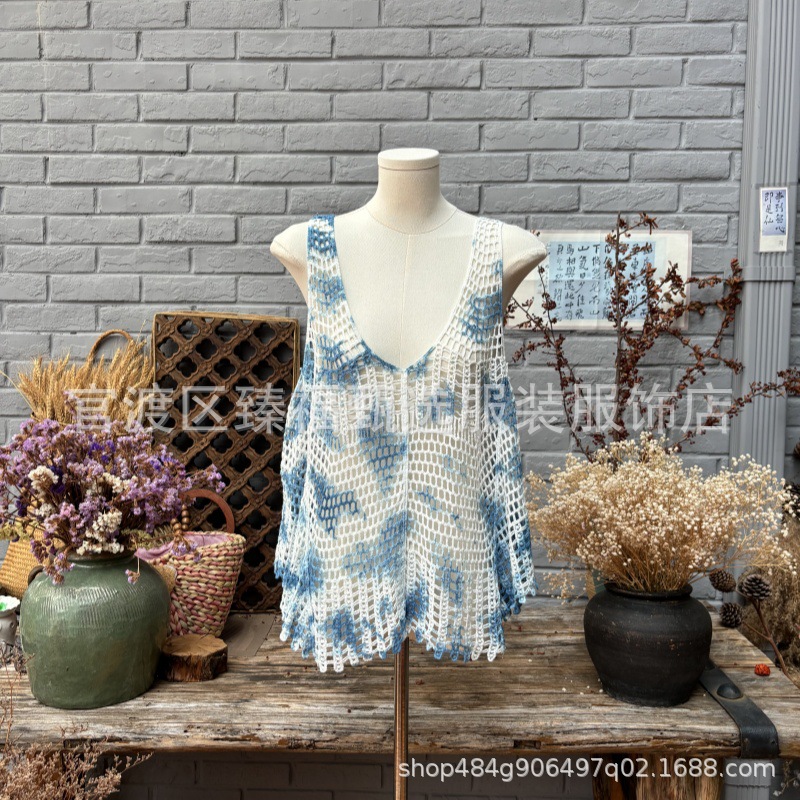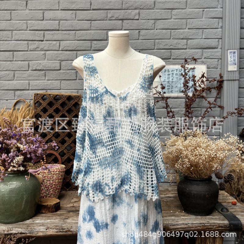 면화 타이-염료 블루-화이트 염료 식물 염료 니트 할로우 아웃 여행 여성 블라우스 니트 탑 조끼스토어 가기