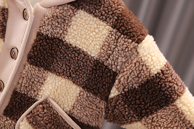 소년의 겨울 2024 새로운 어린이 서양식 아기의 겨울 양고기 플리스 격자 후드 코트 따뜻한 탑