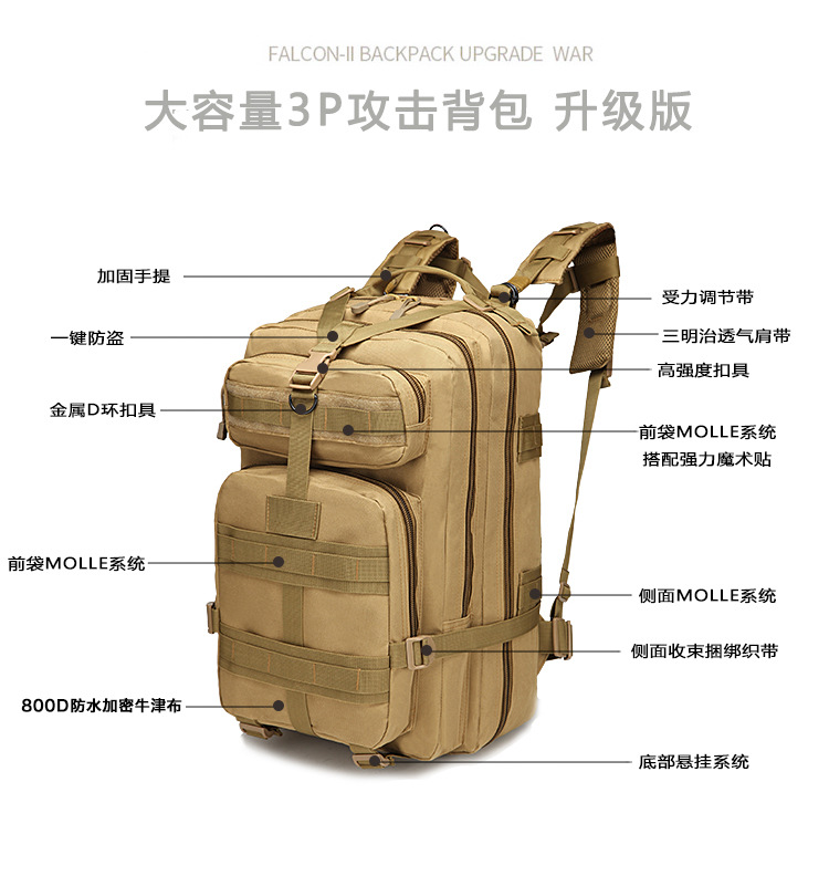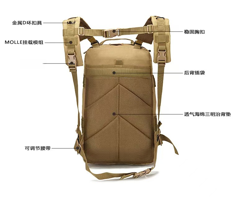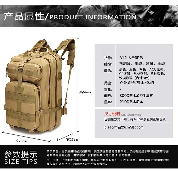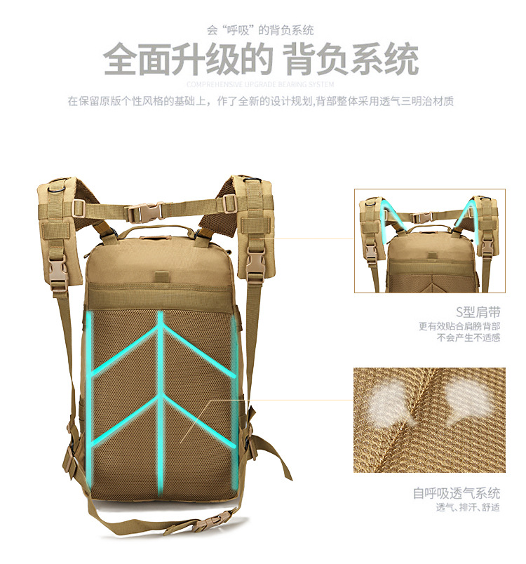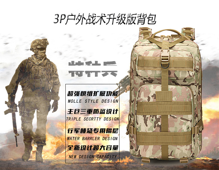 남성과 여성의 스포츠 야외 등산 여행 배낭 캠핑 위장 가방 전술 배낭 40L 대형 3P 배낭