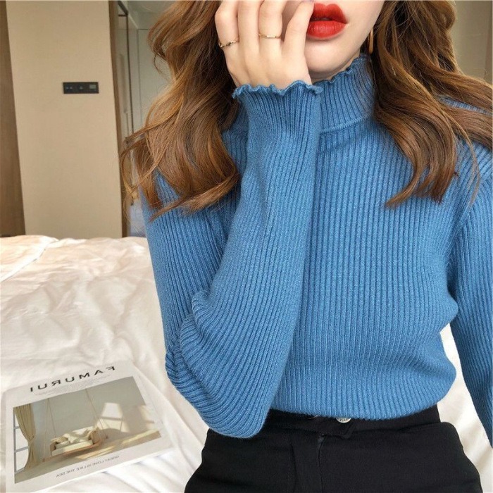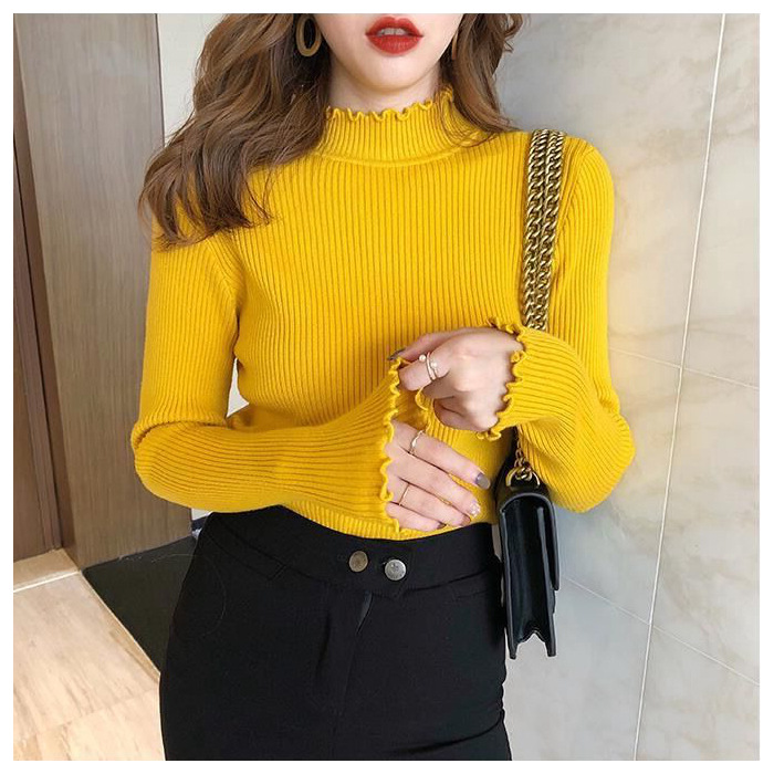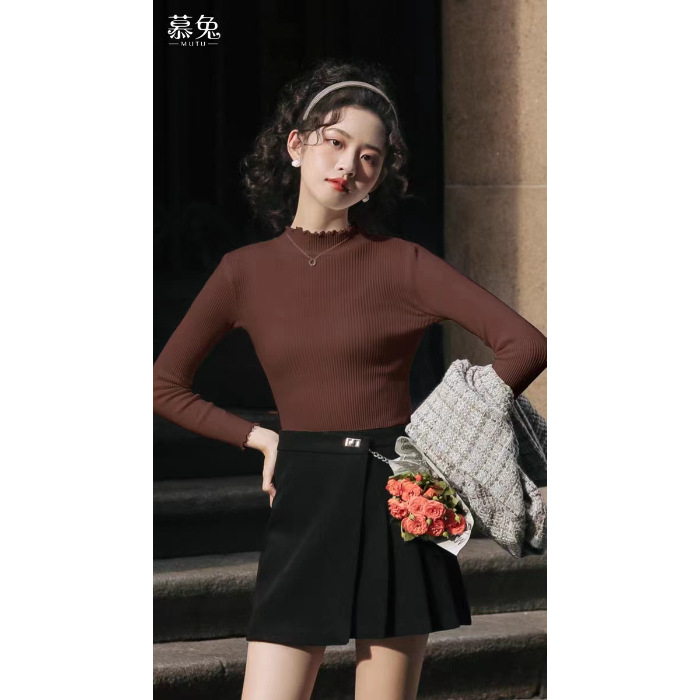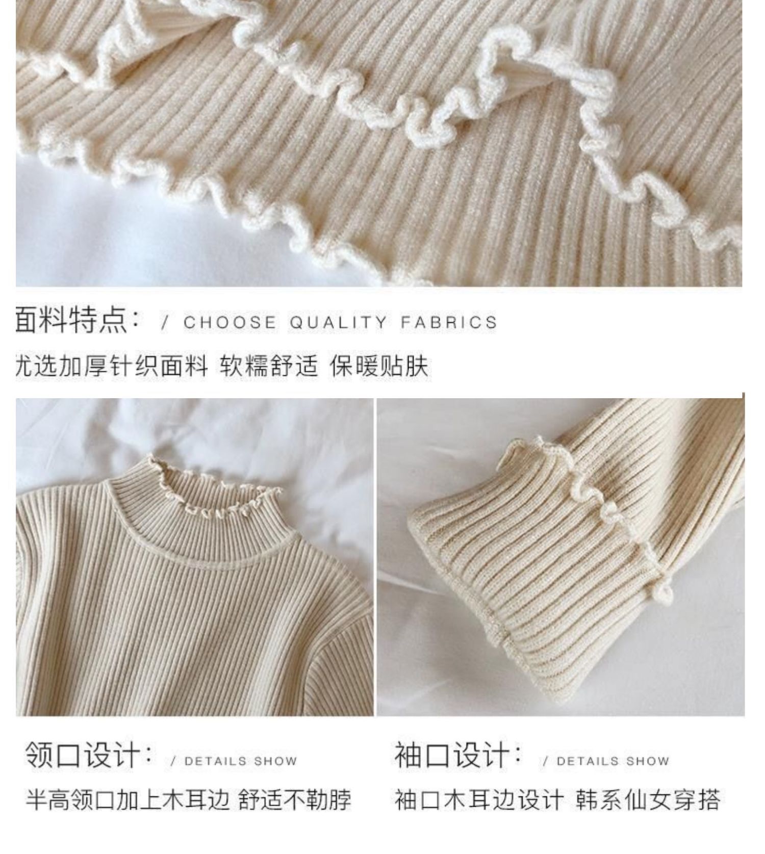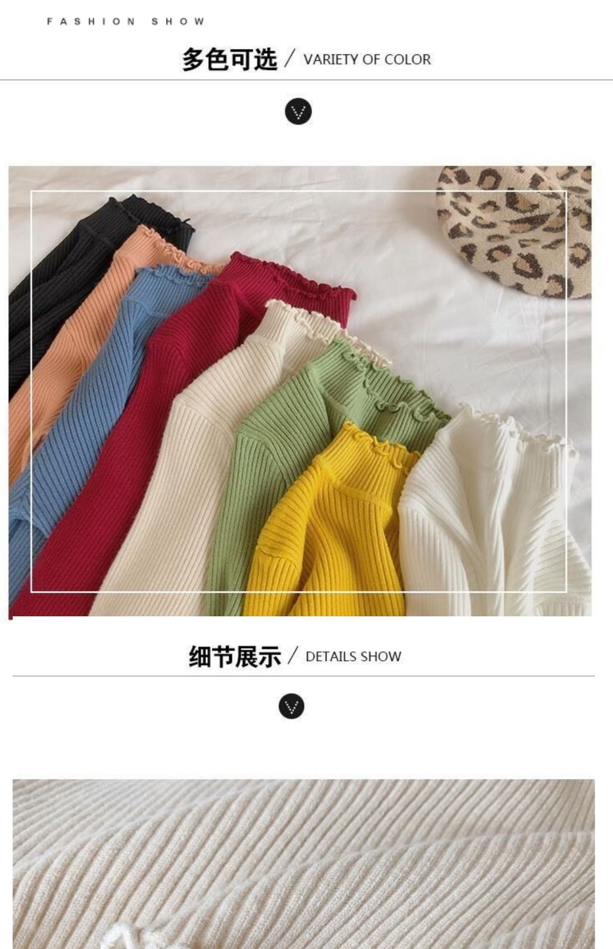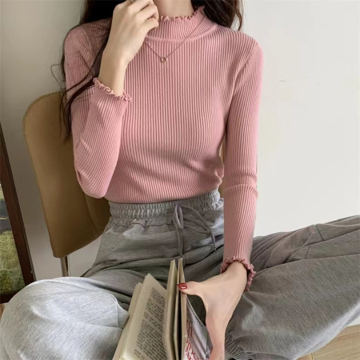 2023秋季毛衣女内搭修身黑色半高领木耳边长袖百搭薄款针织打底衫
