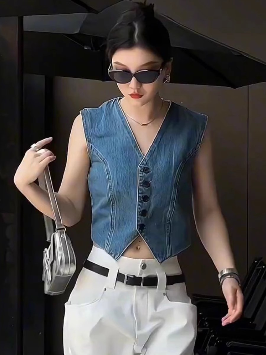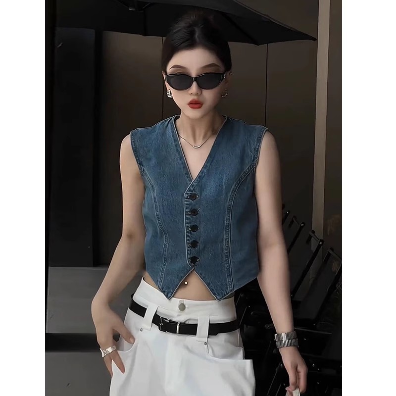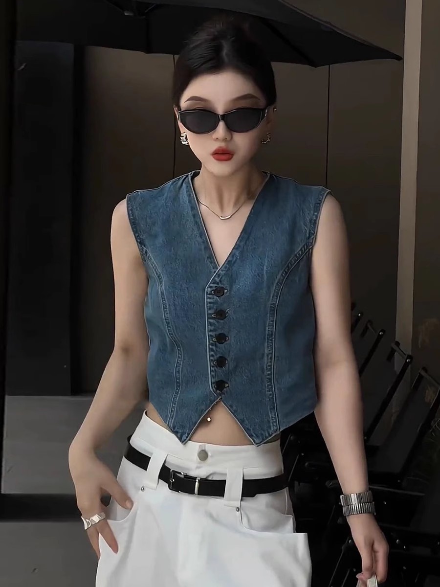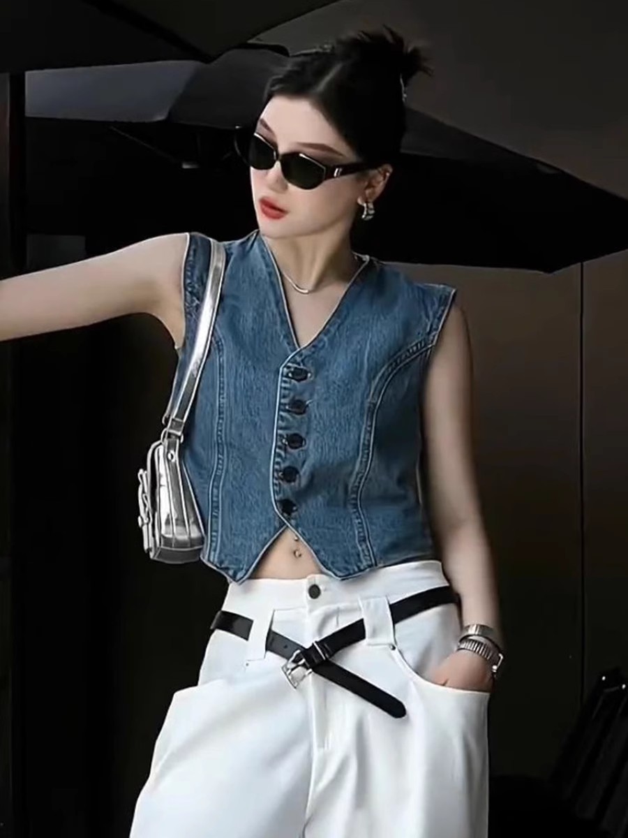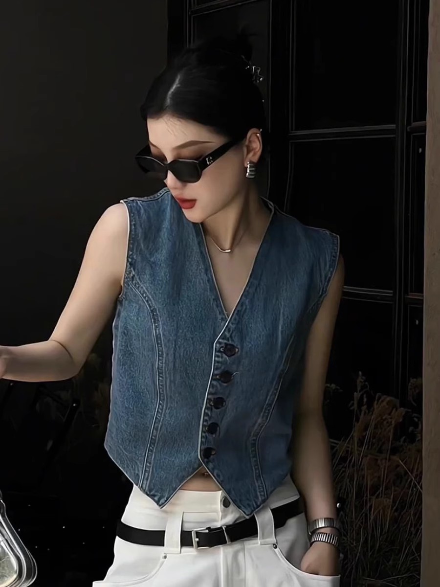여성용 민소매 데님 조끼, 작은 체형을 위한 V넥 숏 조끼, 가을 패션에 활용도 높은, 가볍고 성숙한 스타일, 이너웨어로 활용 가능