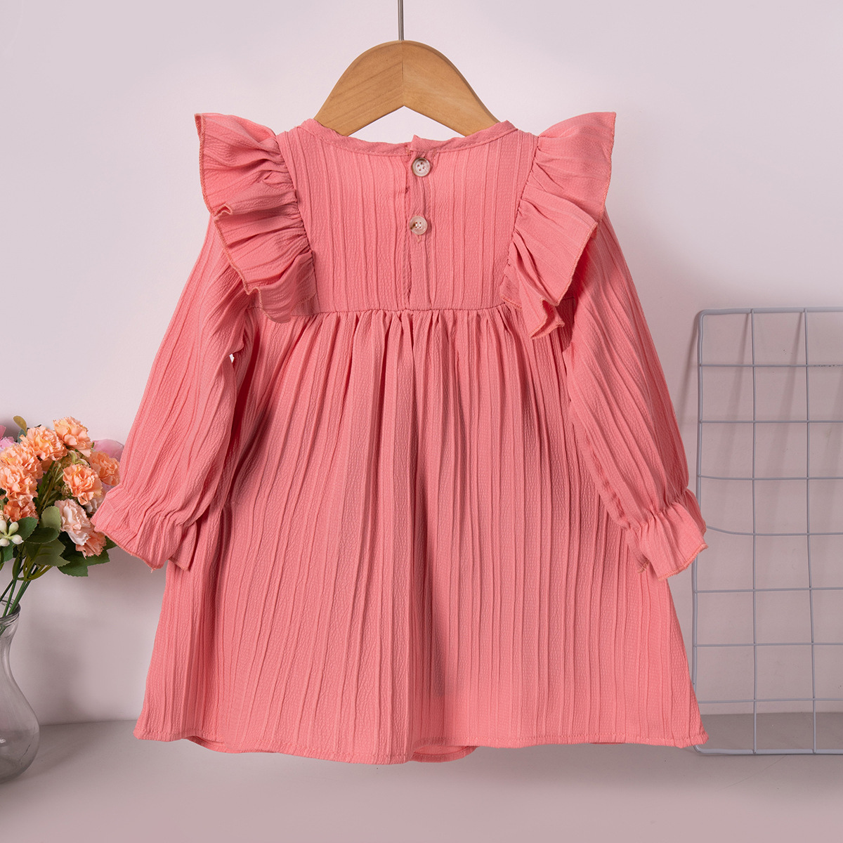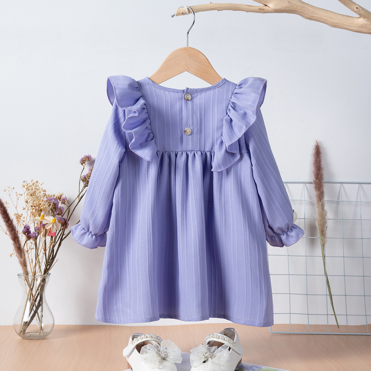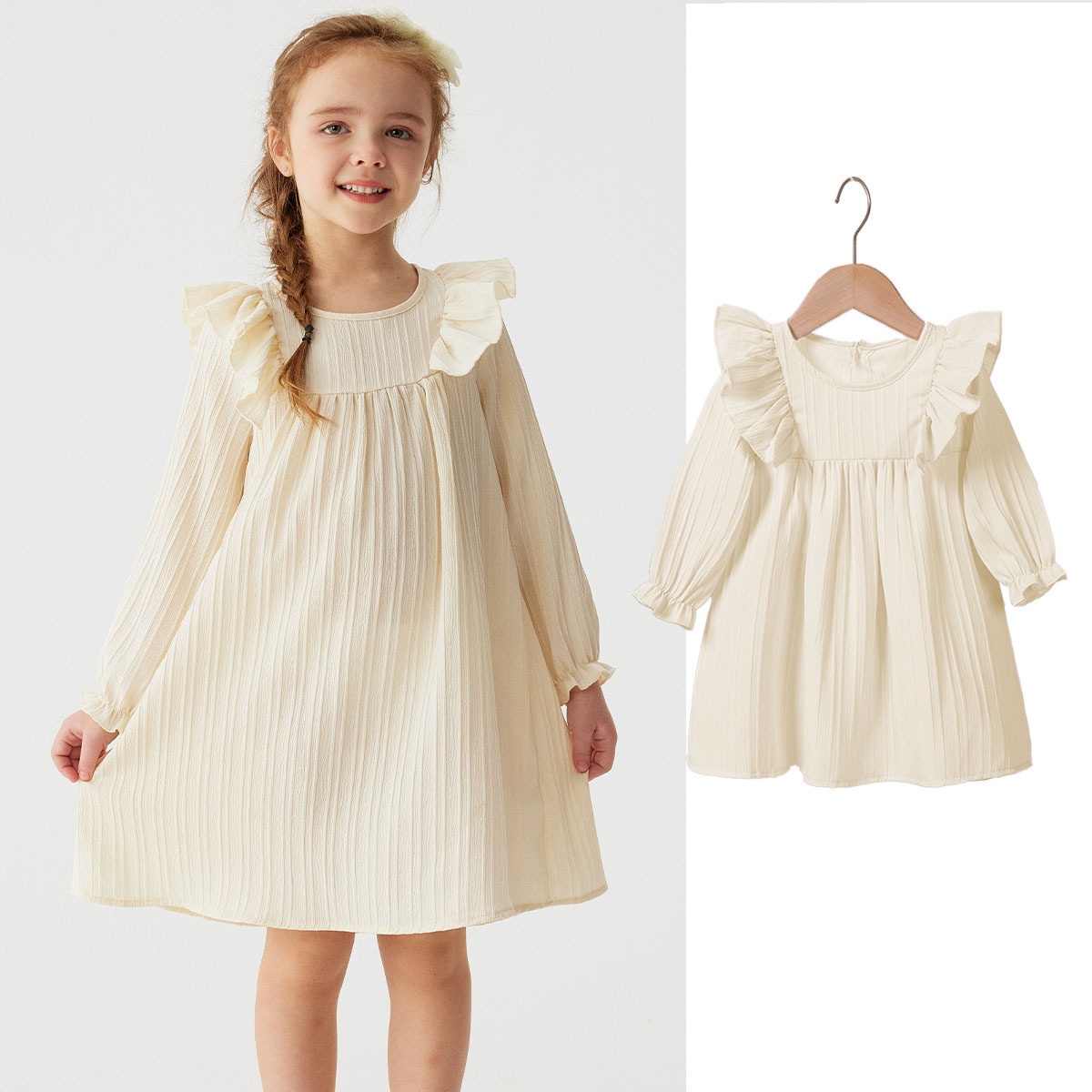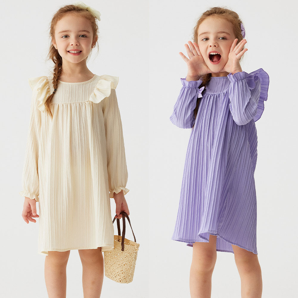 유럽과 미국 스타일의 여아 봄 가을 원피스, 러플 장식 긴팔 베이비 캐주얼 원피스, 단색 한국 스타일 데일리 A라인 스커트스토어 가기