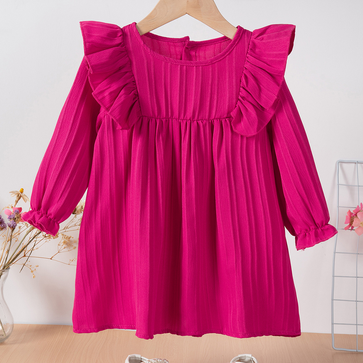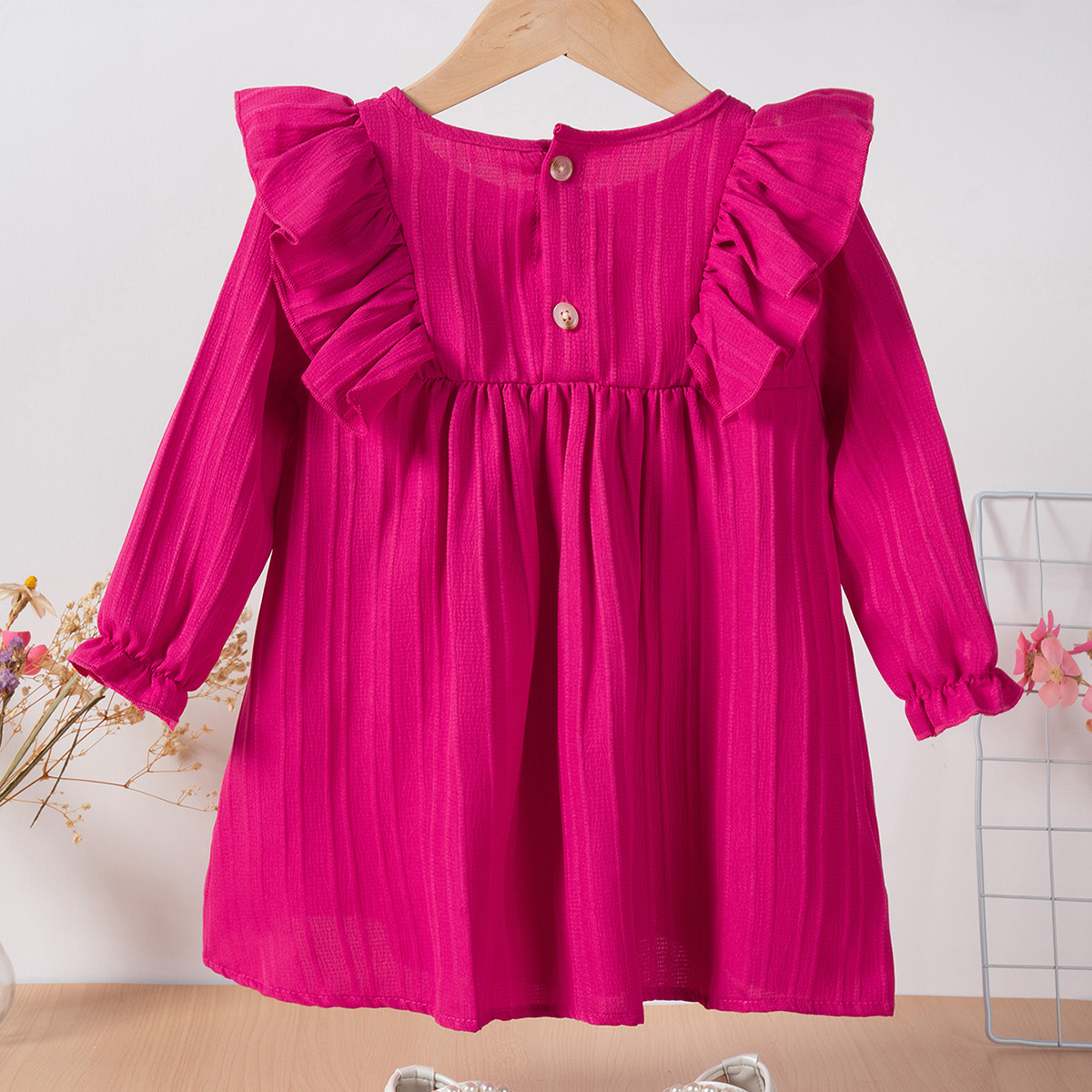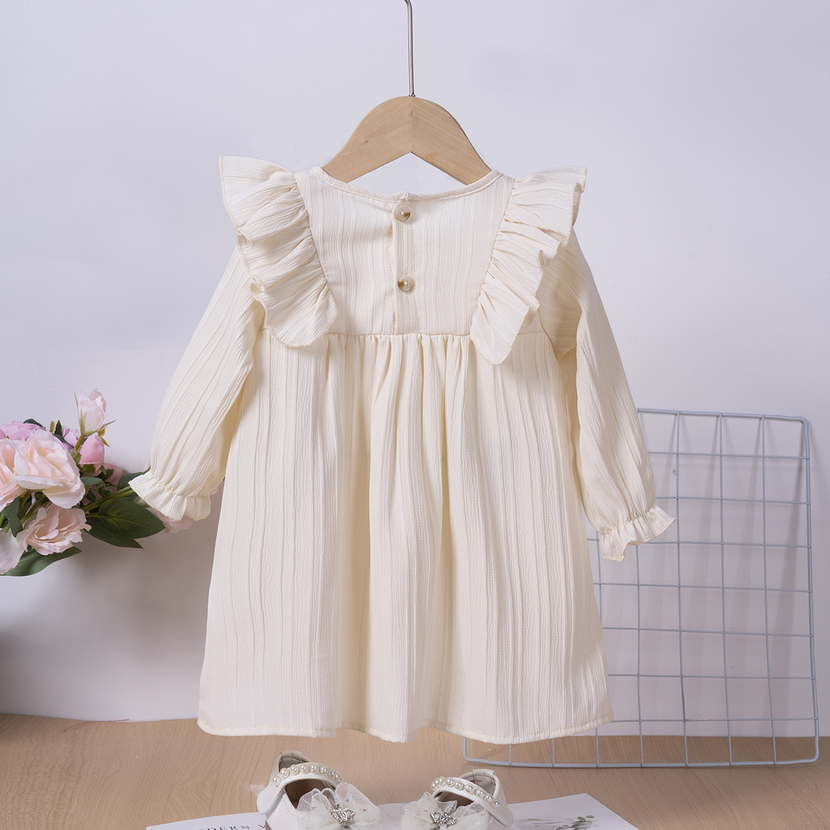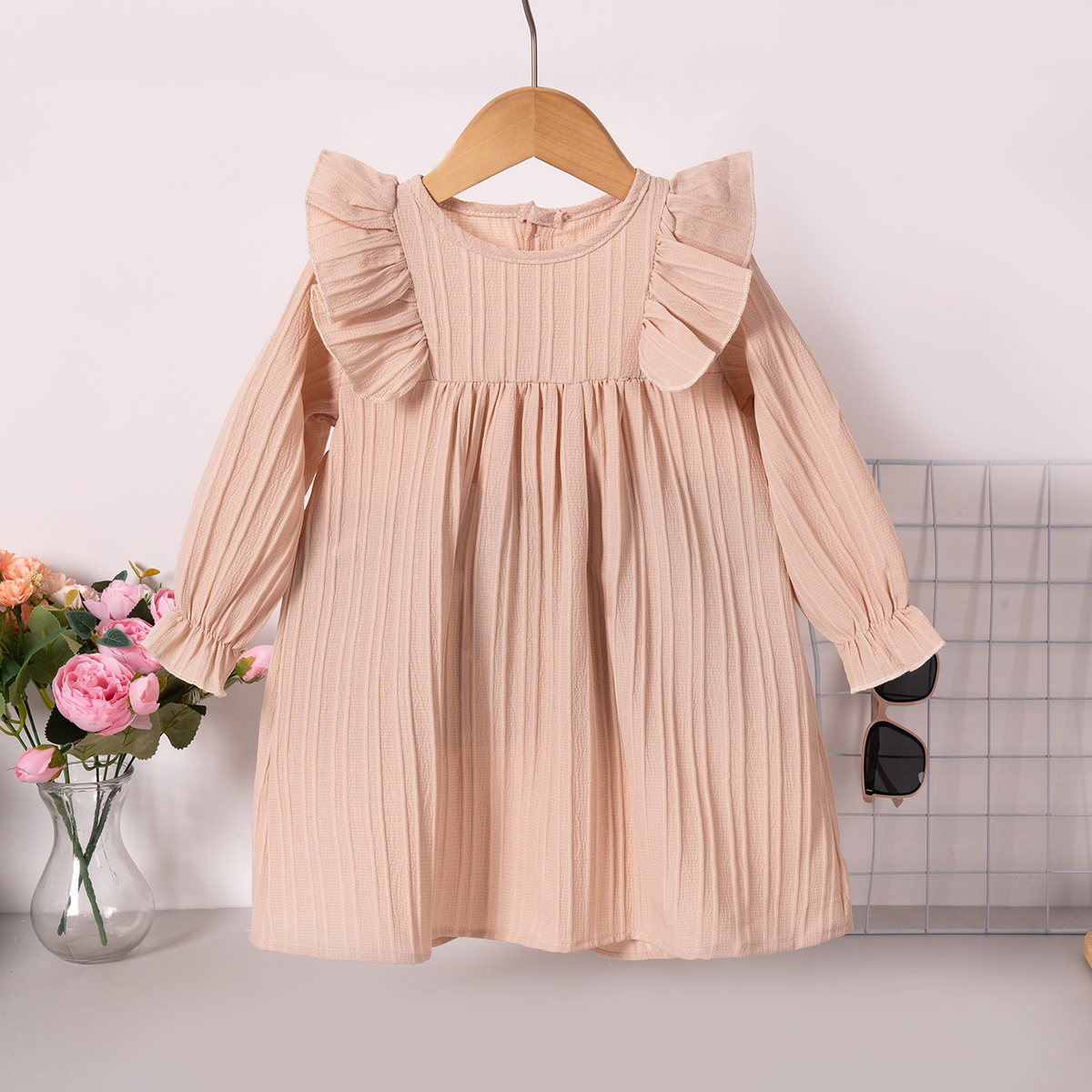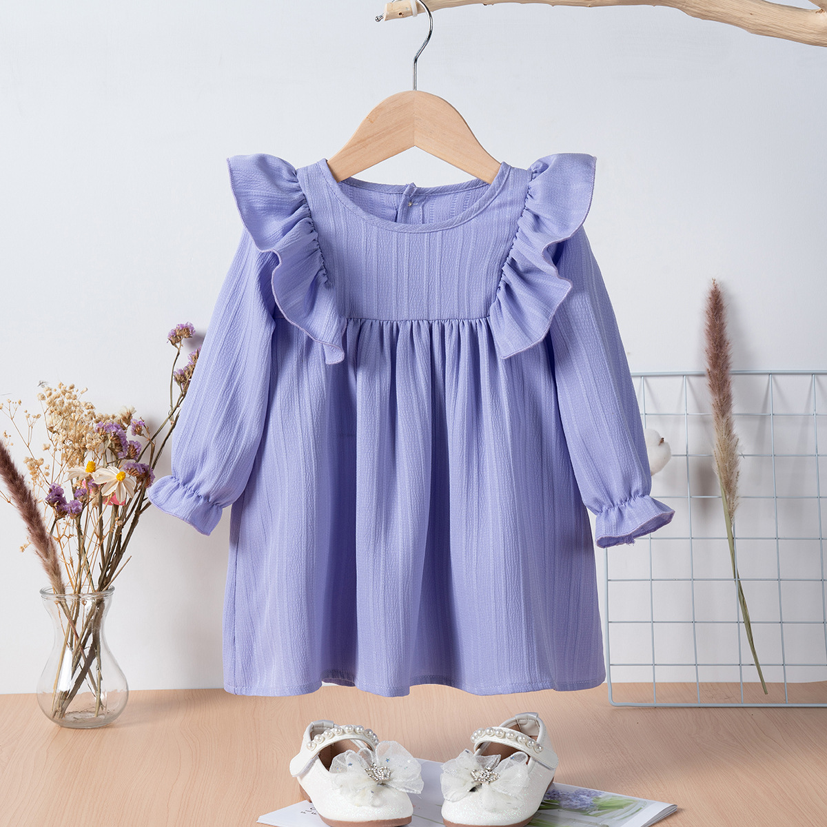 유럽과 미국 스타일의 여아 봄 가을 원피스, 러플 장식 긴팔 베이비 캐주얼 원피스, 단색 한국 스타일 데일리 A라인 스커트스토어 가기