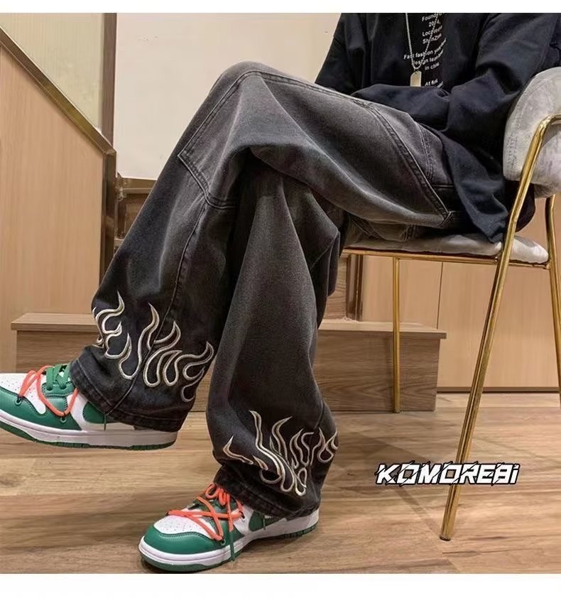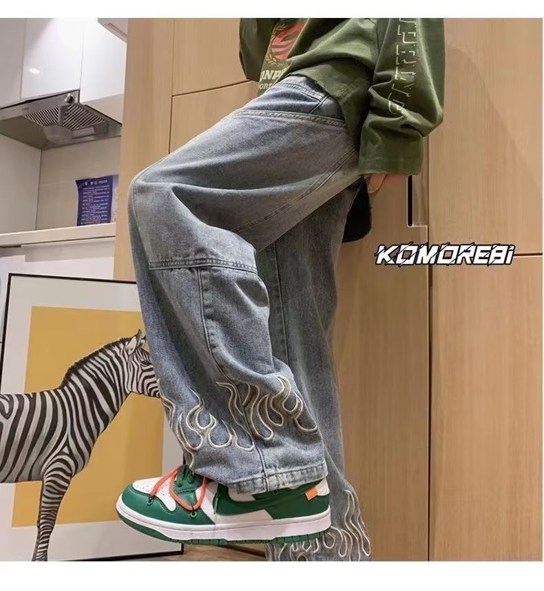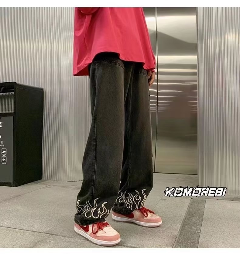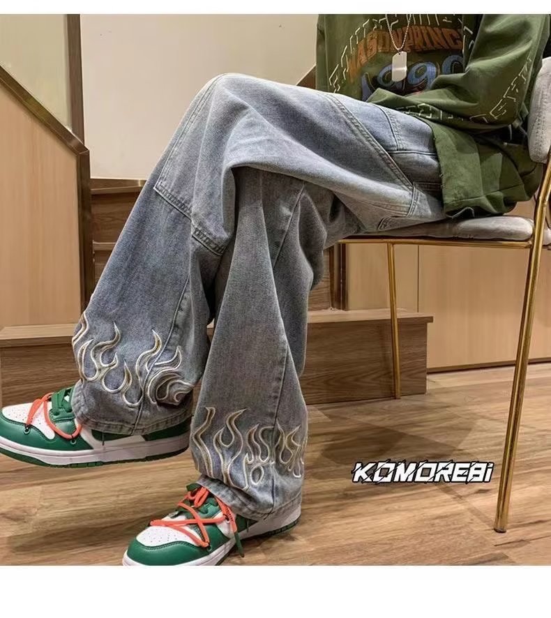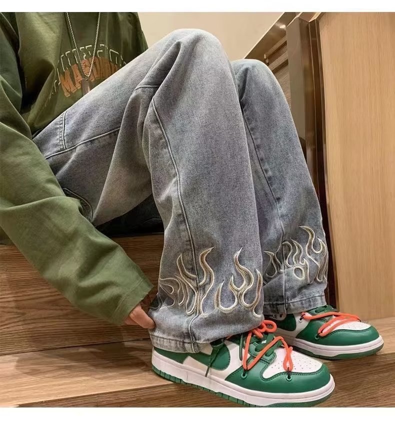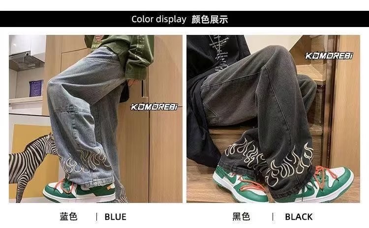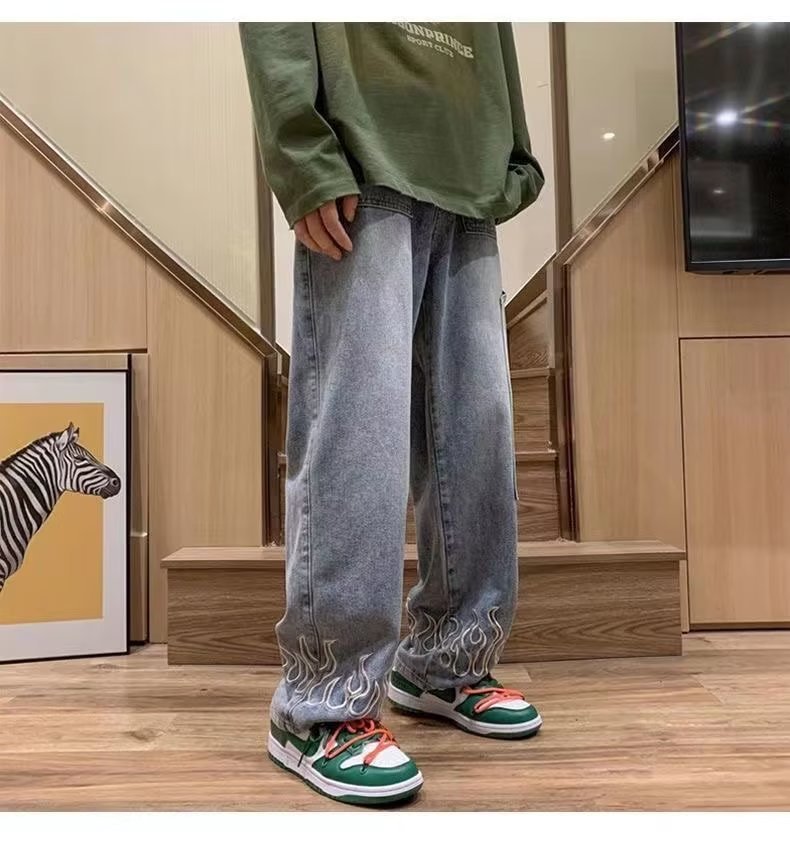 남성 바지 봄과 가을 새로운 직선 발 마이크로 탄성 느슨한 직선형 지퍼 중간 허리 유행 청소년 인기있는 세탁 청바지스토어 가기
