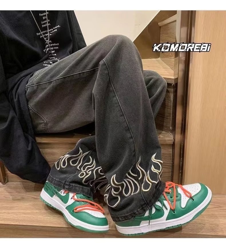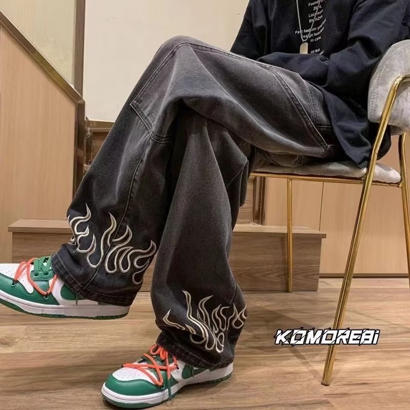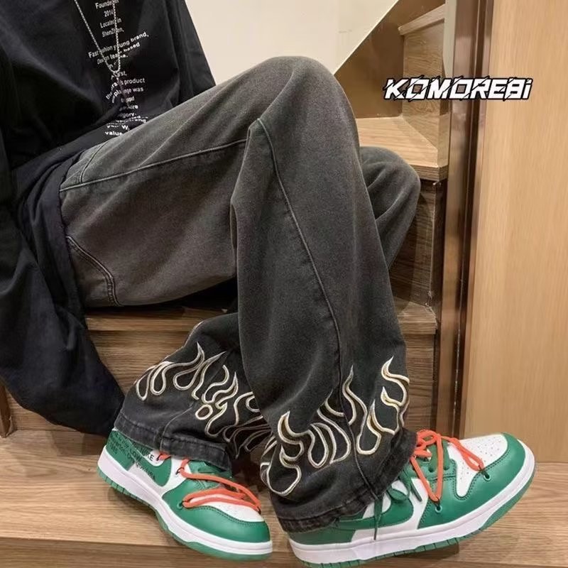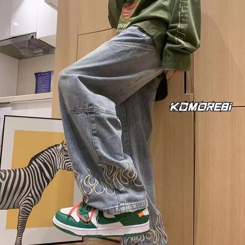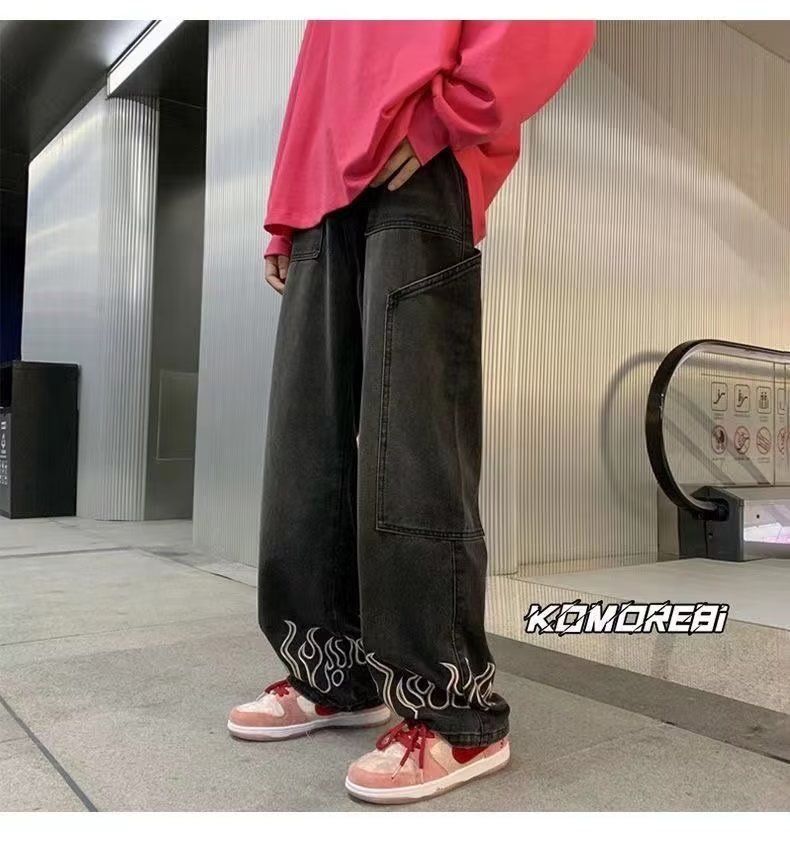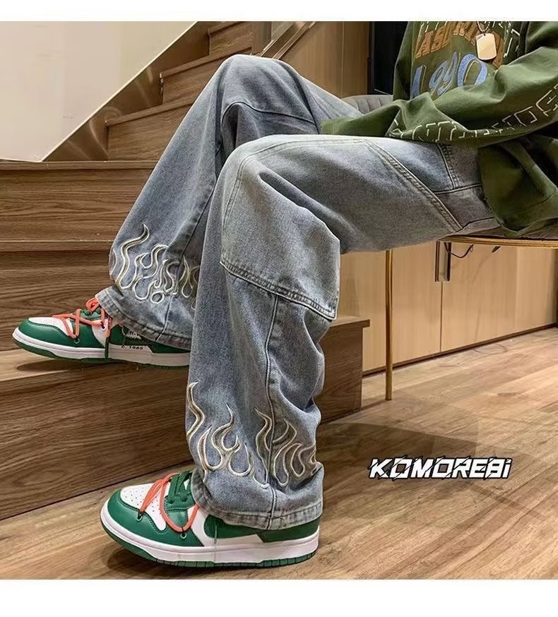 남성 바지 봄과 가을 새로운 직선 발 마이크로 탄성 느슨한 직선형 지퍼 중간 허리 유행 청소년 인기있는 세탁 청바지스토어 가기