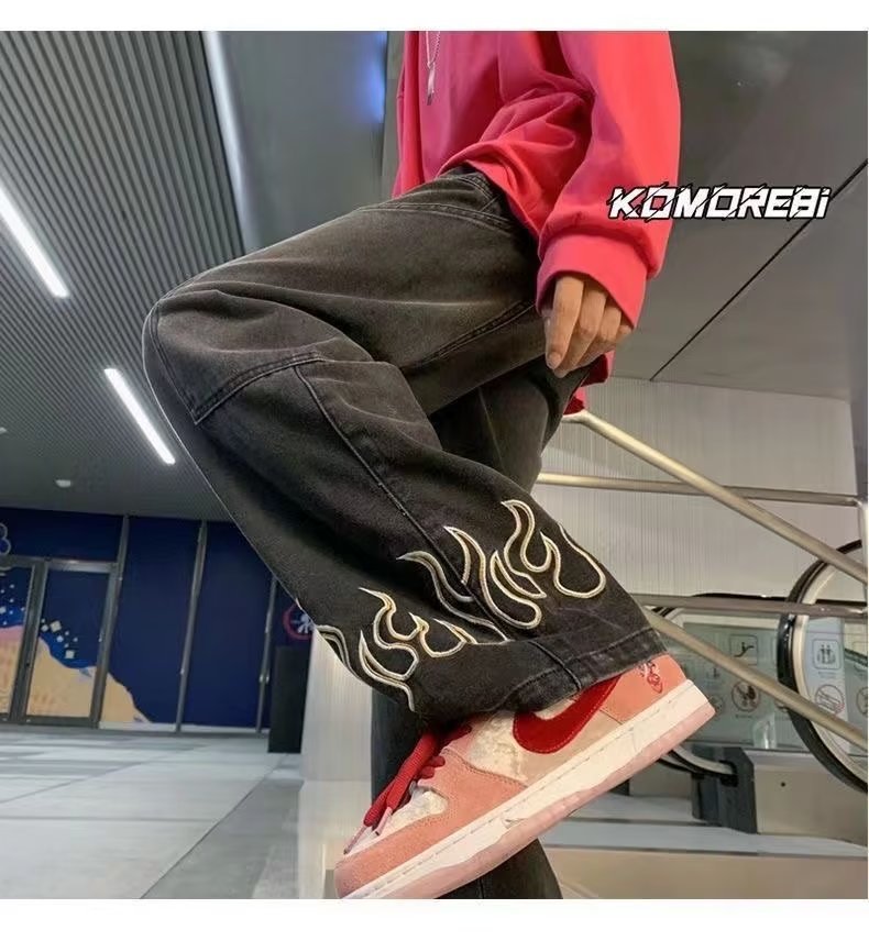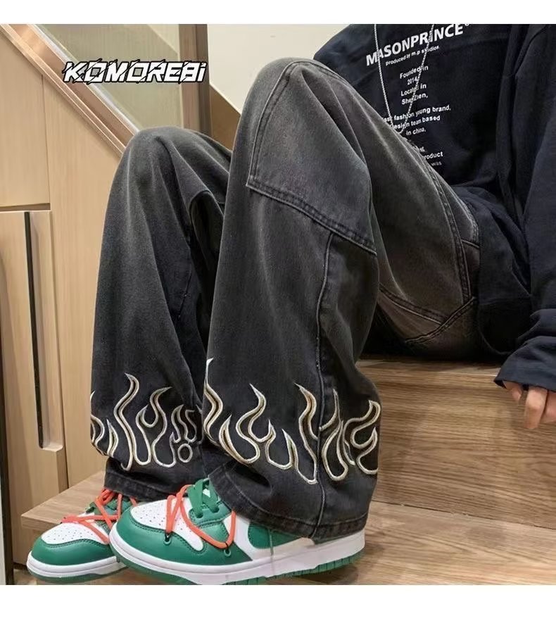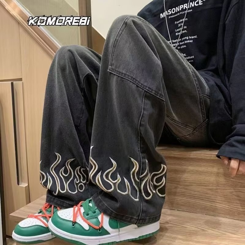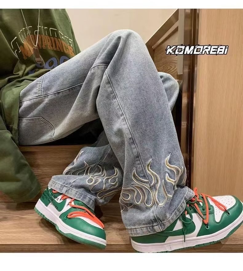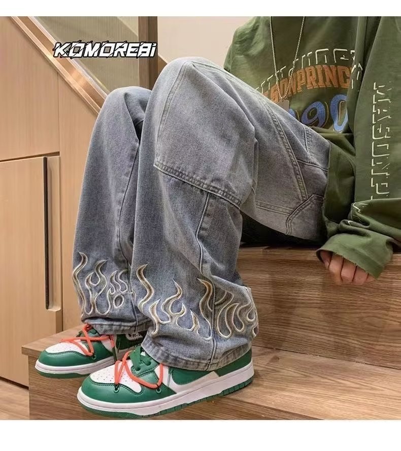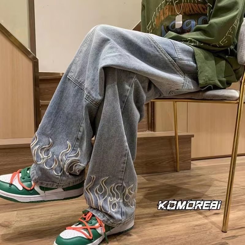 남성 바지 봄과 가을 새로운 직선 발 마이크로 탄성 느슨한 직선형 지퍼 중간 허리 유행 청소년 인기있는 세탁 청바지스토어 가기