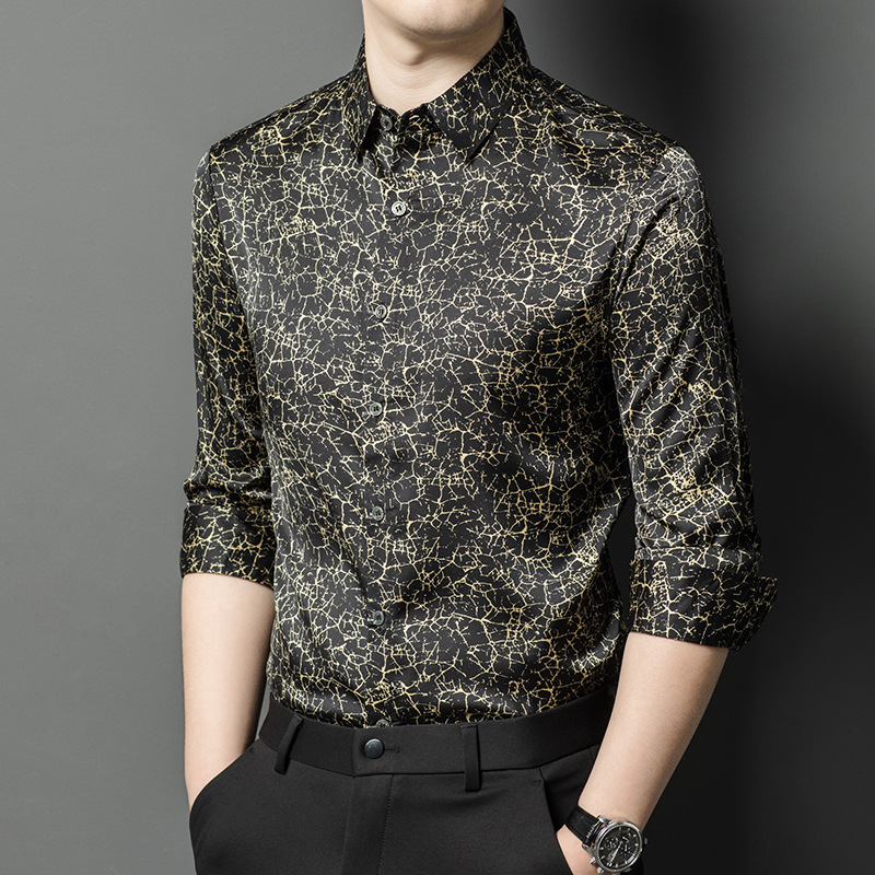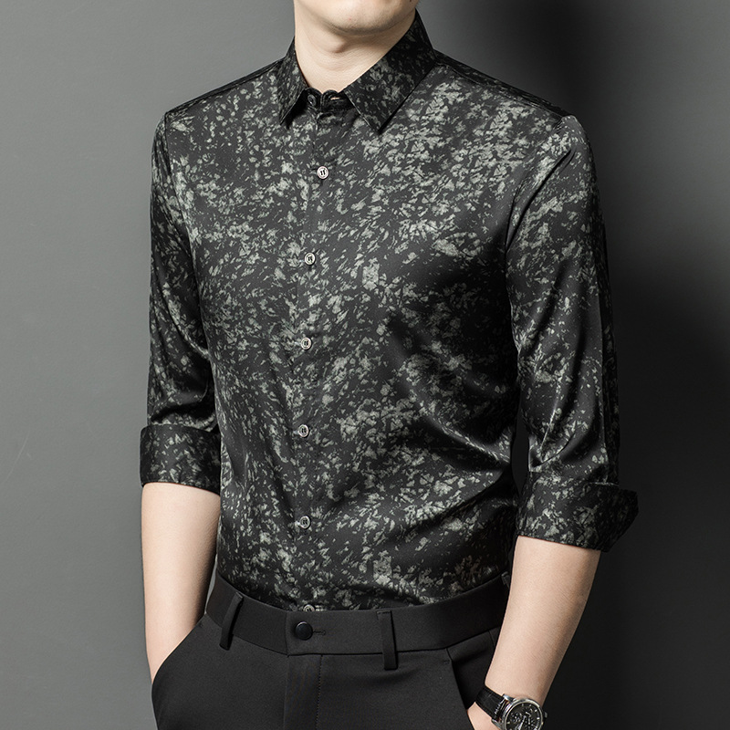 봄가을 남성용 긴팔 셔츠, 실크 원단, 은은한 무늬 셔츠, 비즈니스 캐주얼, 고급 중년 남성용, 다림질 필요 없는 셔츠스토어 가기