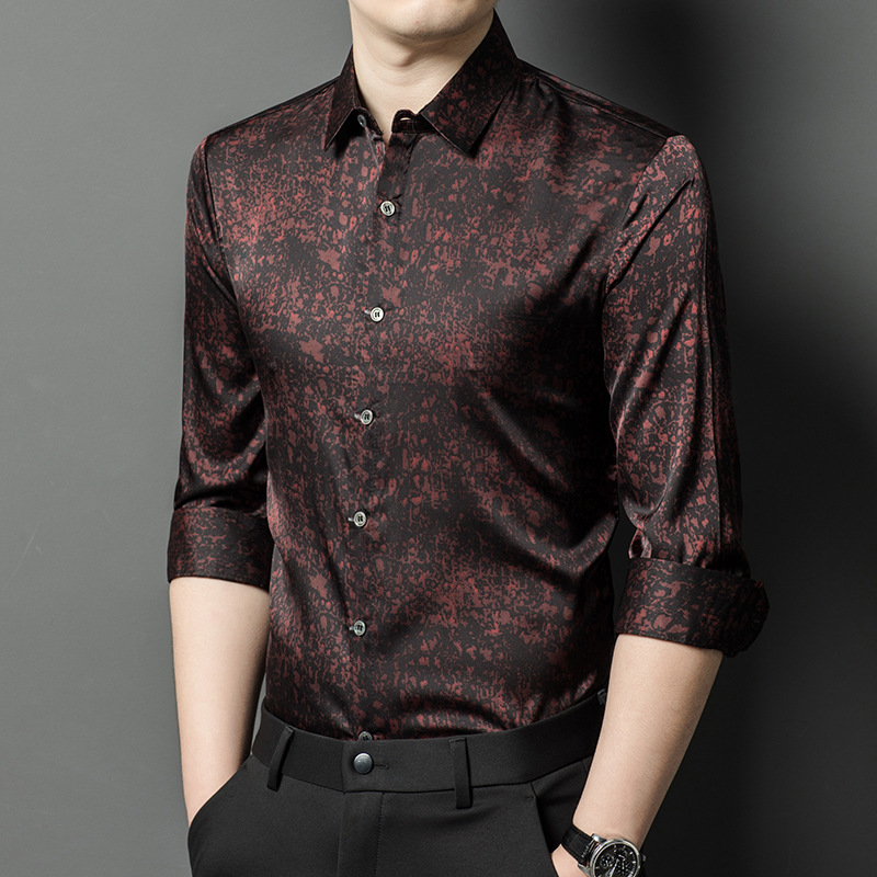 봄가을 남성용 긴팔 셔츠, 실크 원단, 은은한 무늬 셔츠, 비즈니스 캐주얼, 고급 중년 남성용, 다림질 필요 없는 셔츠