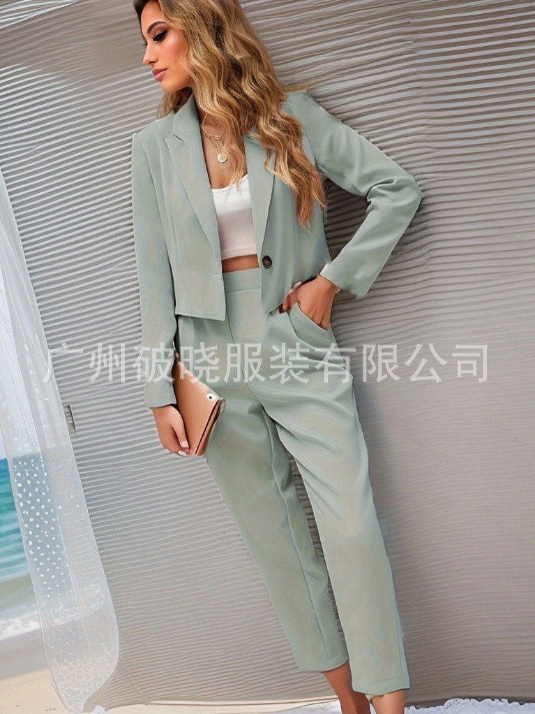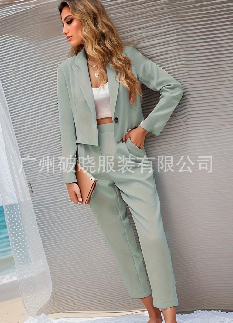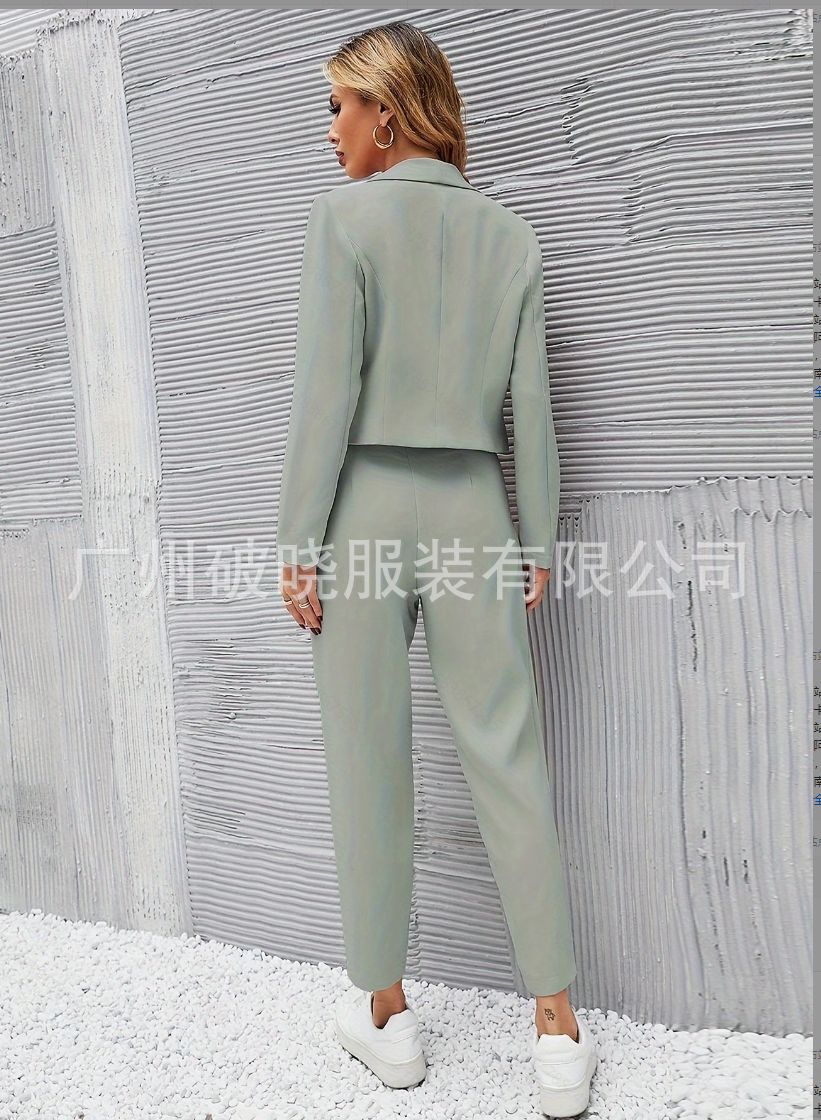 2025년 신상 유럽 및 미국 해외 무역 여성복, 단색 라펠 긴팔 포켓 팬츠, 패셔너블한 투피스 세트
