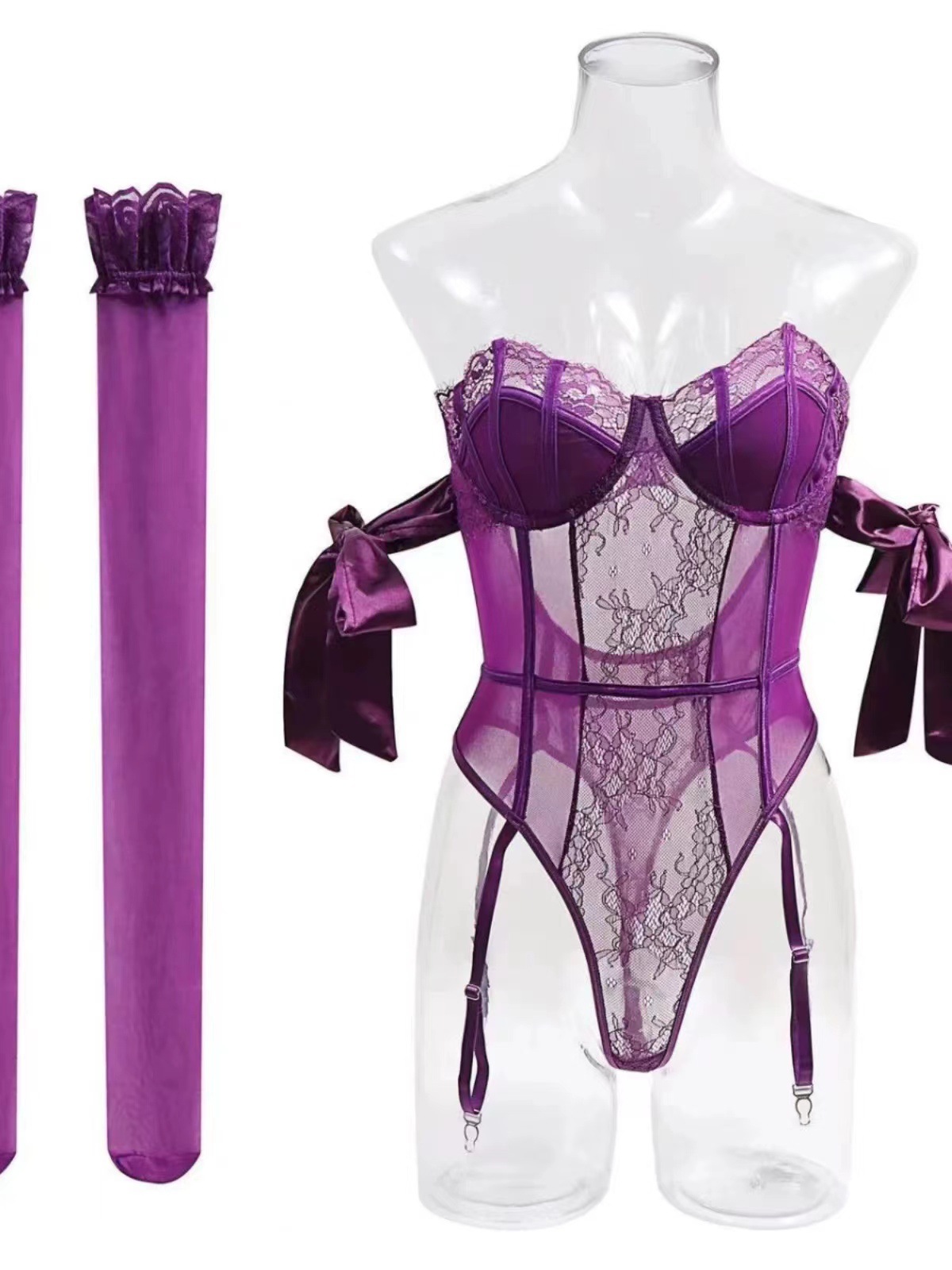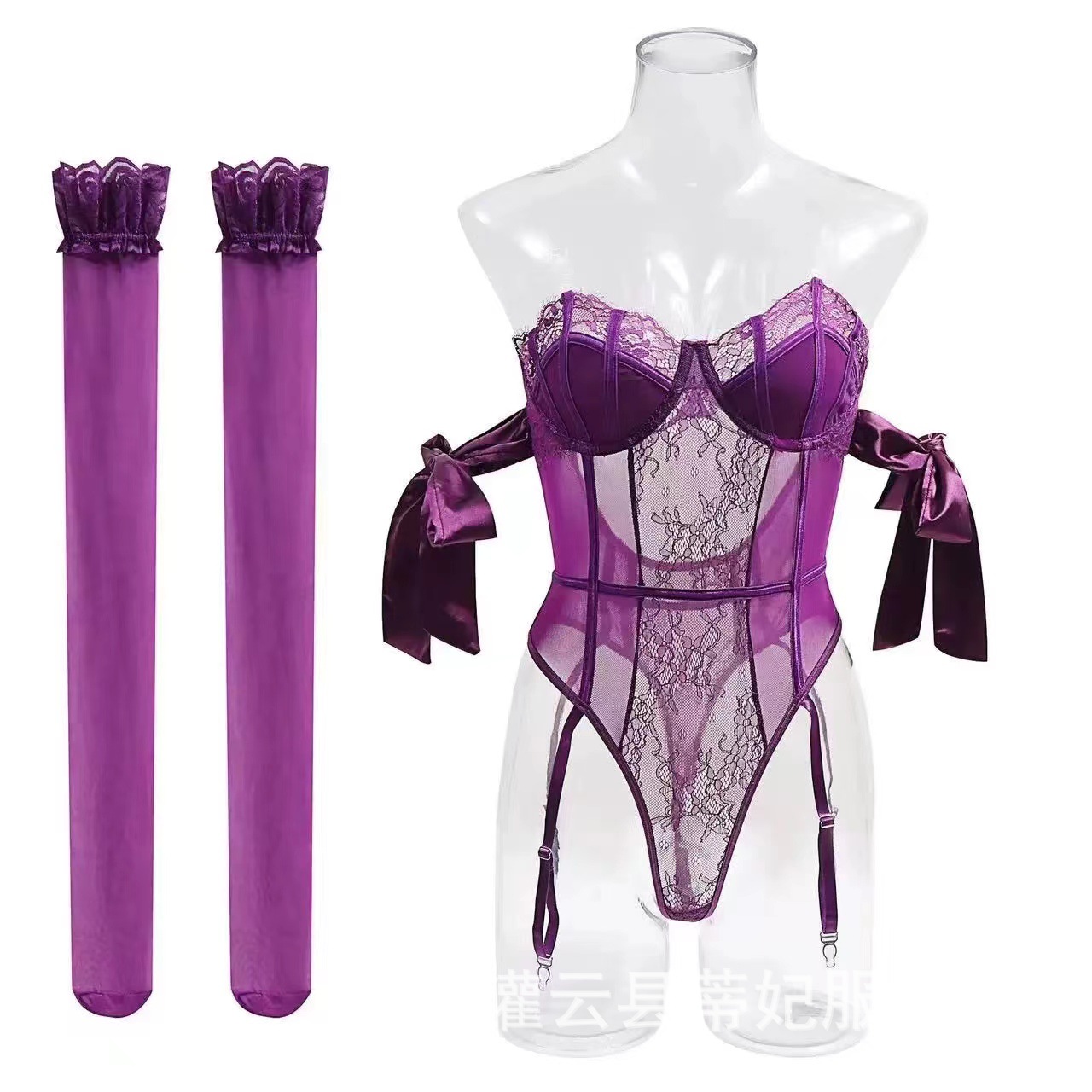 나이트 스웨어 티 페이 섹시한 란제리 퍼플 레이스 원피스 옷 순수 세트 유니폼 입고 파자마 유혹