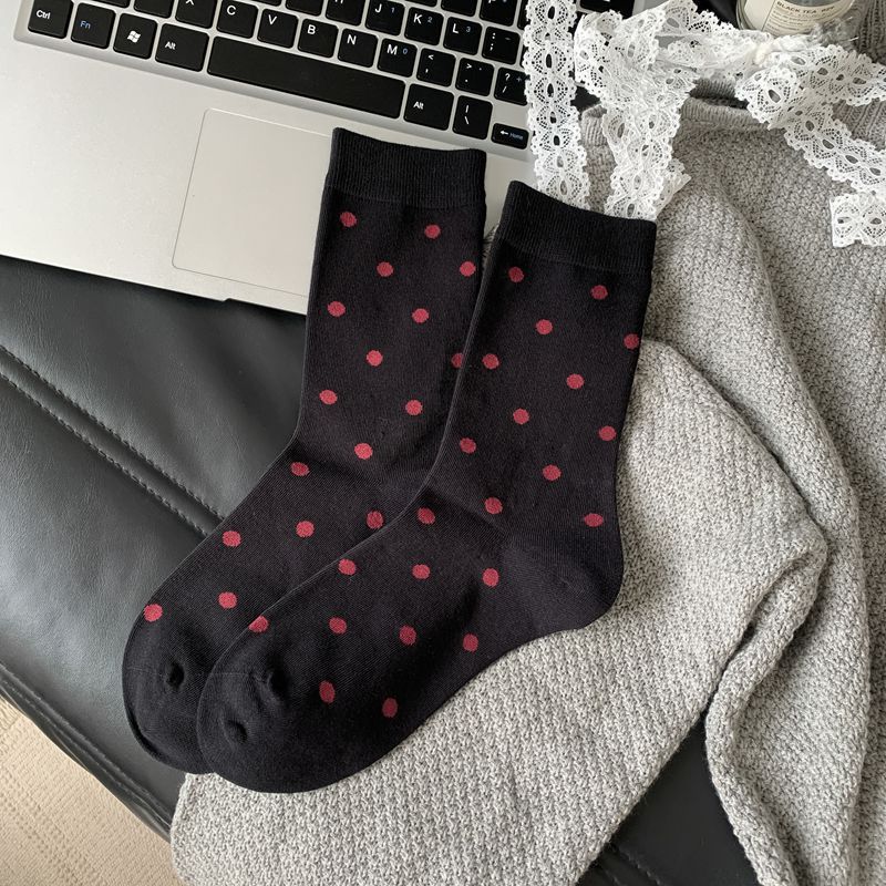Ankora Red Socks 중간 길이 양말 여성의 봄과 가을 Ins 유행 면 양말 일본식 한국식 웨이브 도트 버건디 스타킹스토어 가기