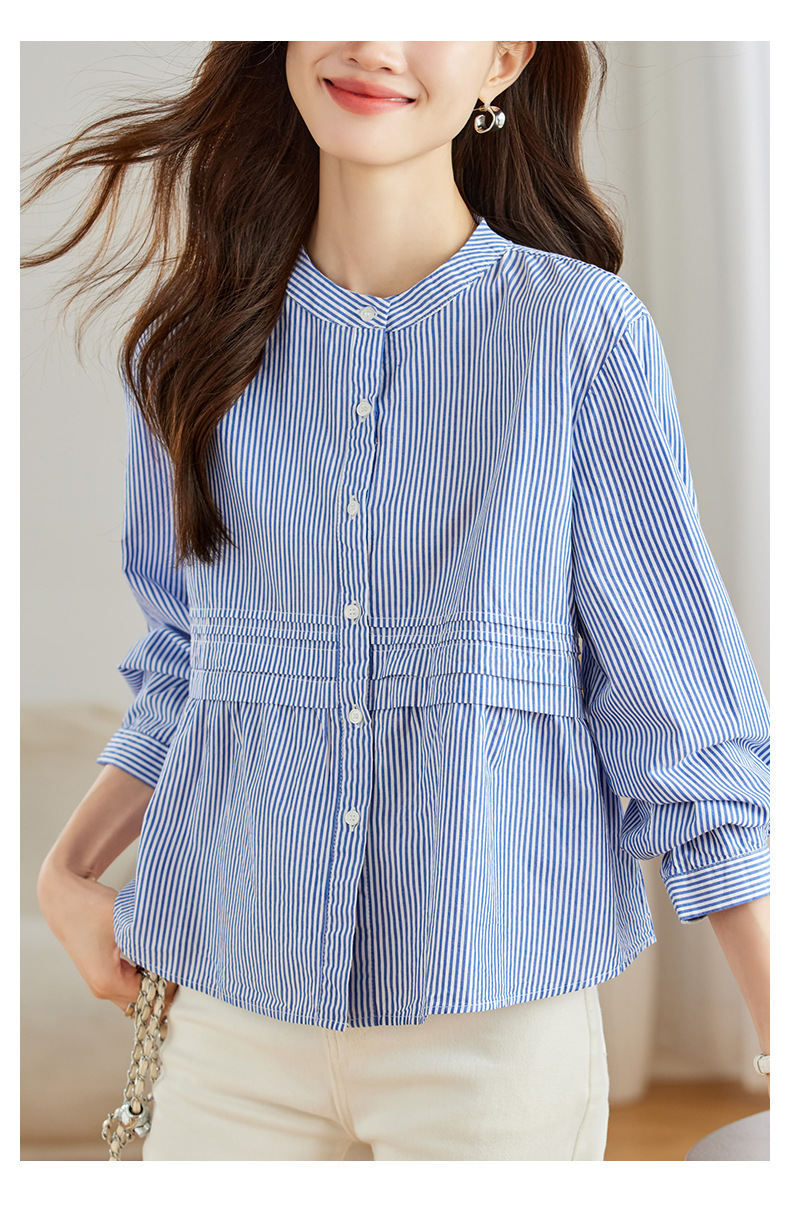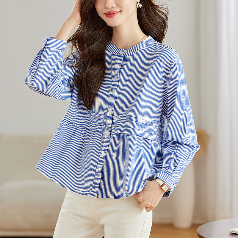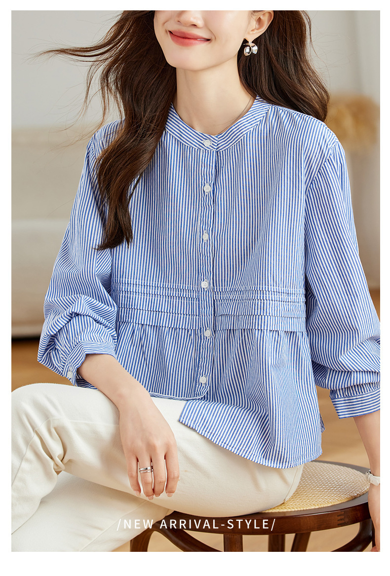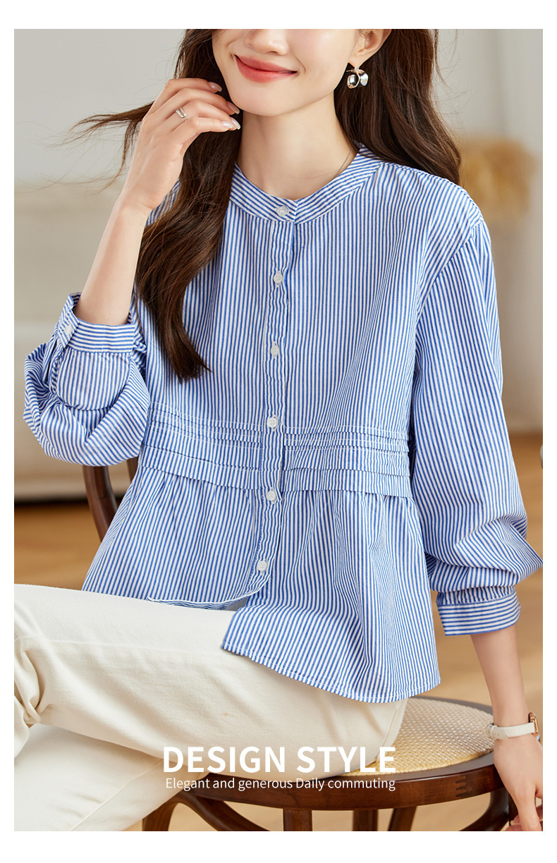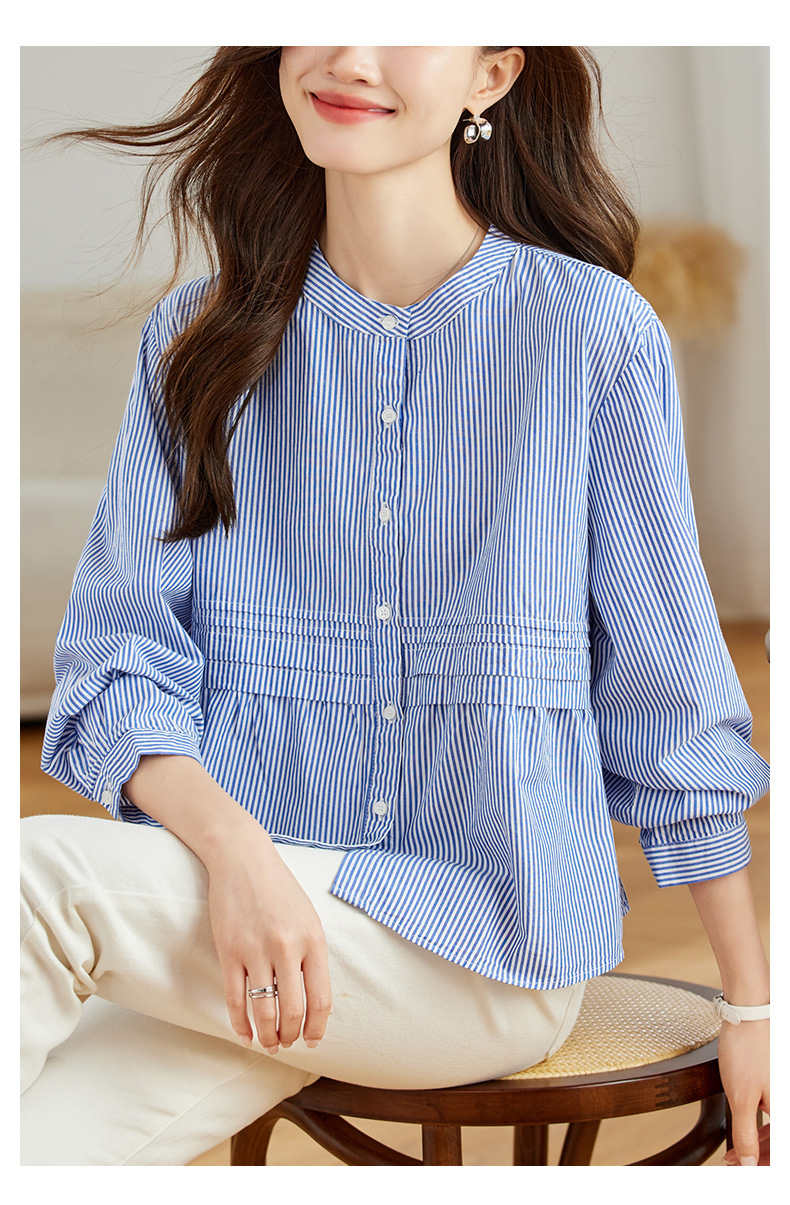 공장 직판 디자인 감각적인 주름 장식 라운드넥 스트라이프 긴팔 셔츠 여성용 2026 봄 가을 신상 루즈핏 슬리밍 탑스토어 가기