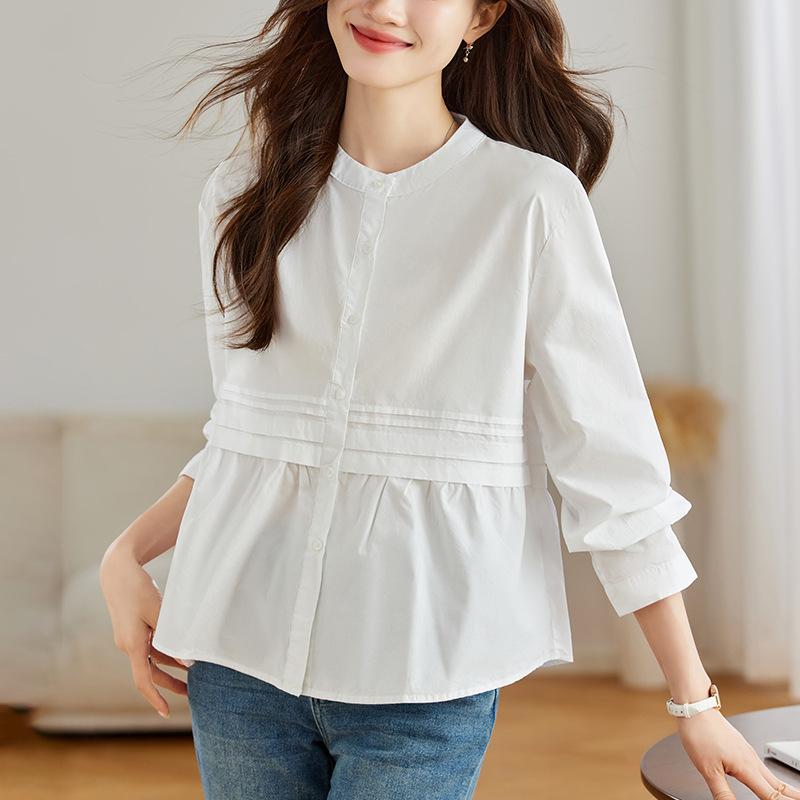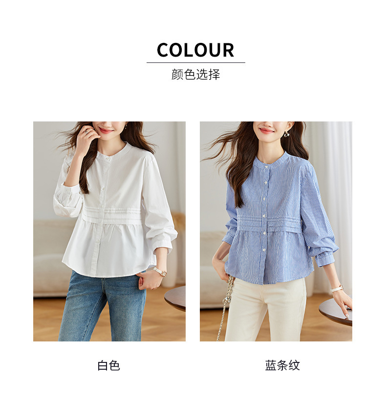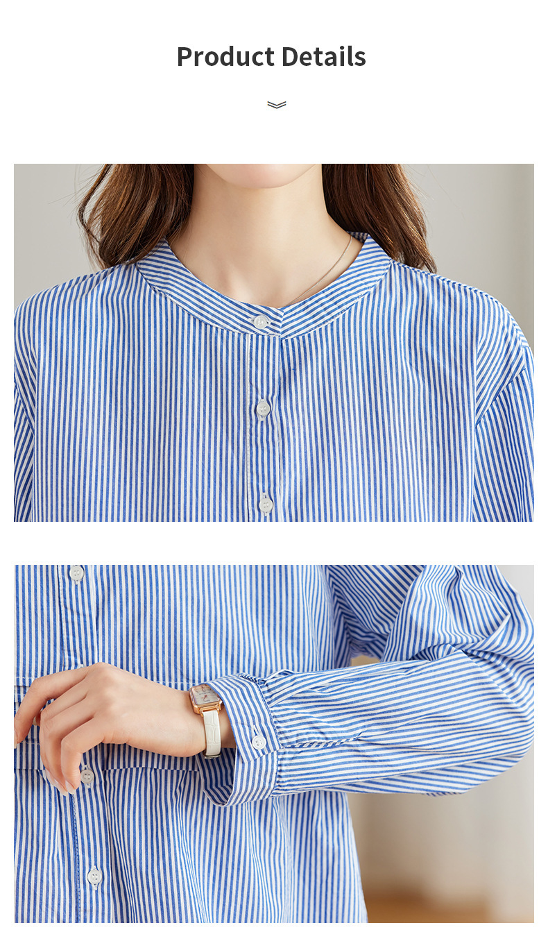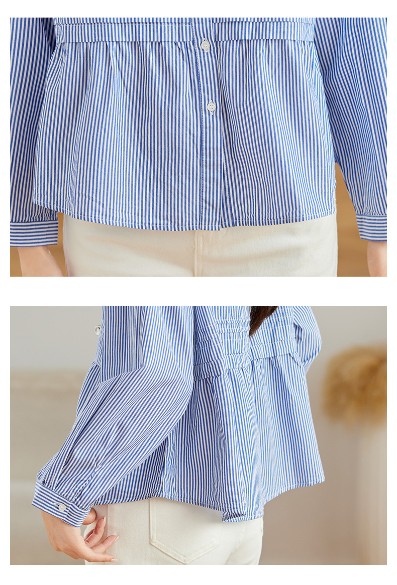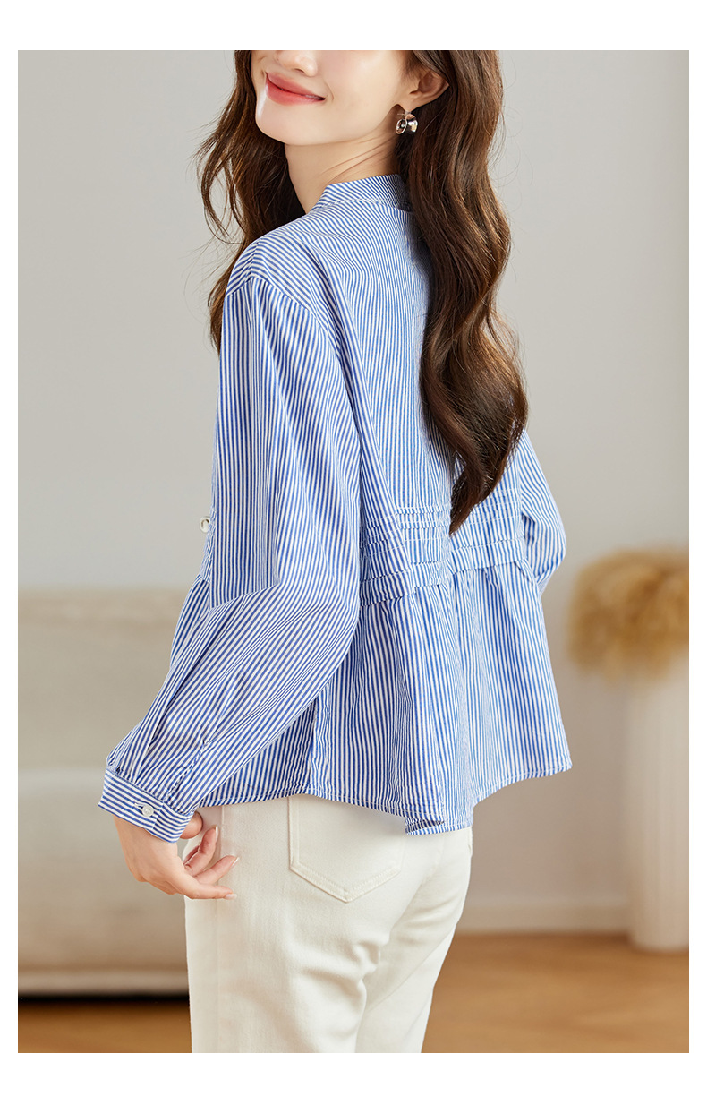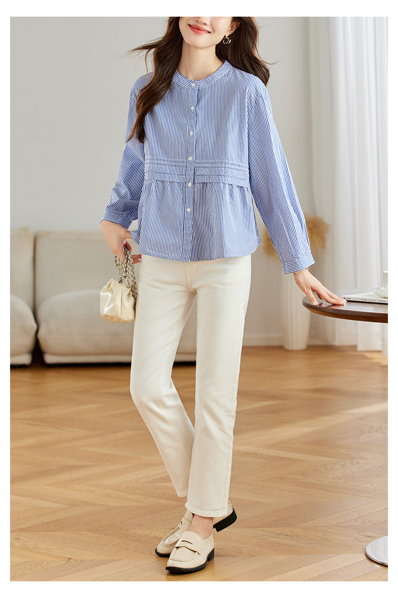 공장 직판 디자인 감각적인 주름 장식 라운드넥 스트라이프 긴팔 셔츠 여성용 2026 봄 가을 신상 루즈핏 슬리밍 탑스토어 가기