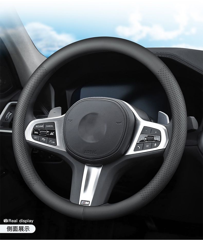 자동차 스티어링 휠 커버 사계절 보편적 인 천공 통기성 미끄럼 편안한 자동차 인테리어 수정 나파 가죽 핸들 커버스토어 가기