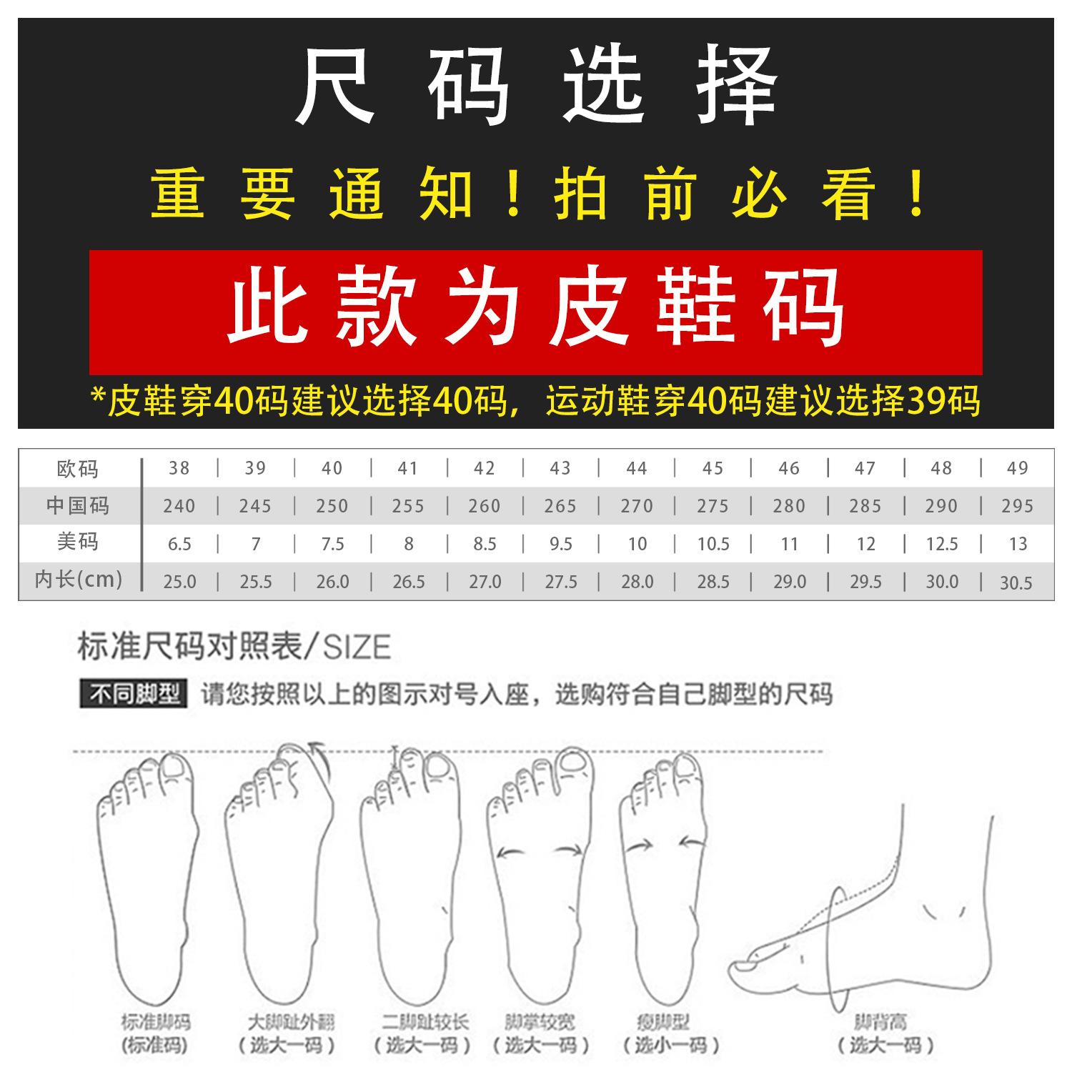 • 가죽 신발 사이즈(운동화보다 한 사이즈 더 큼)