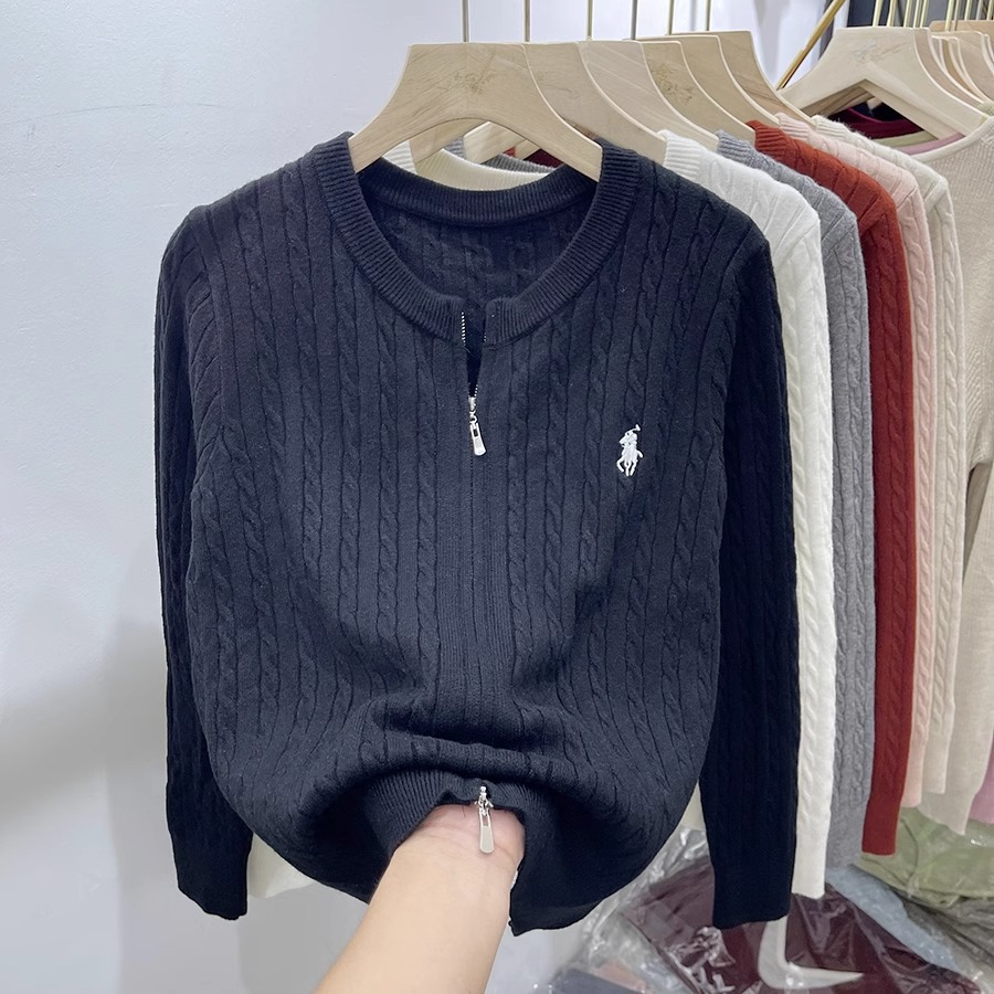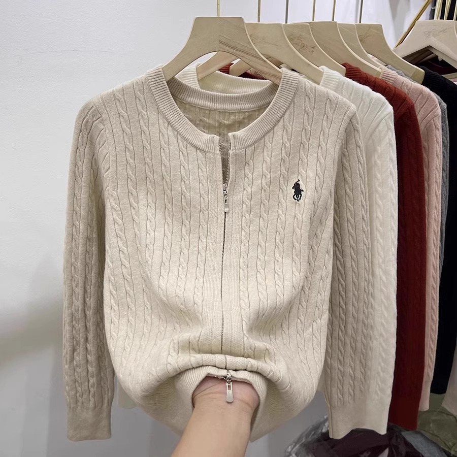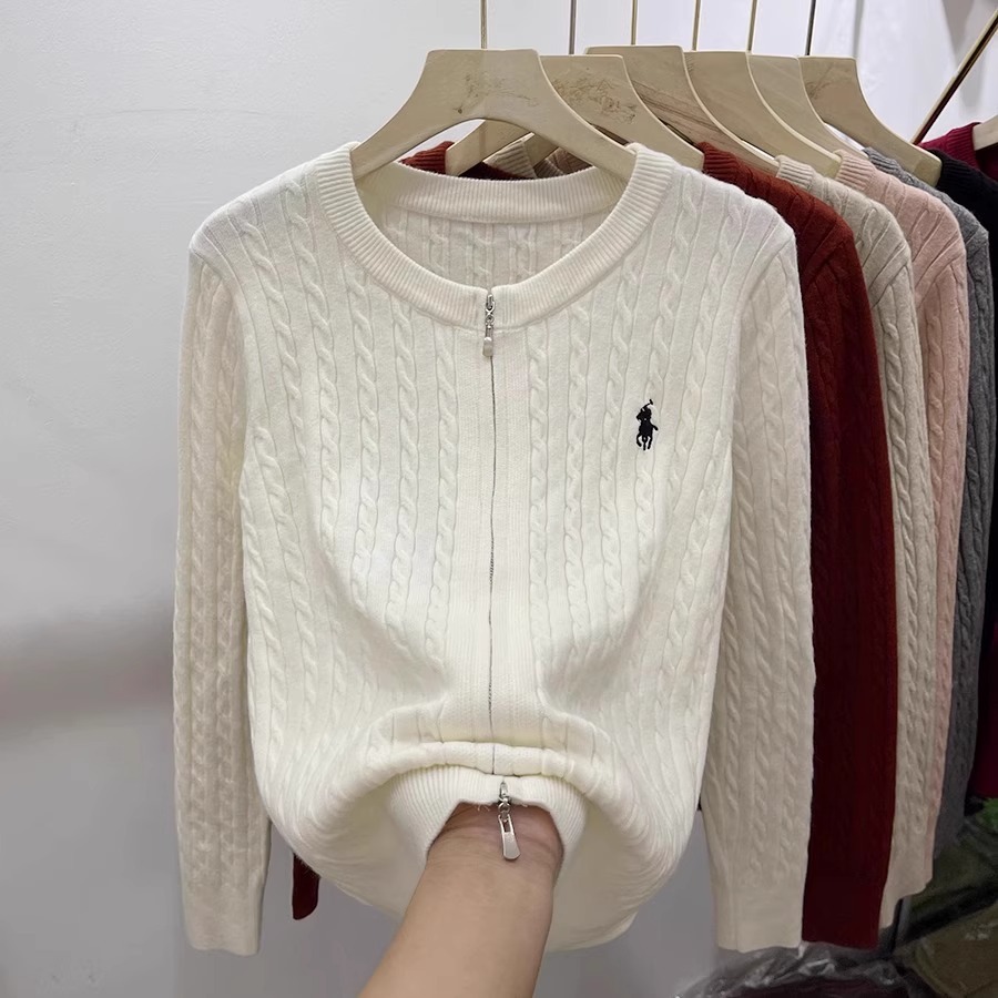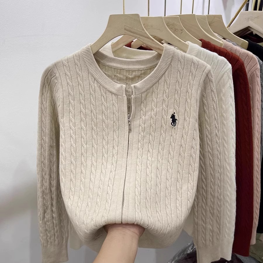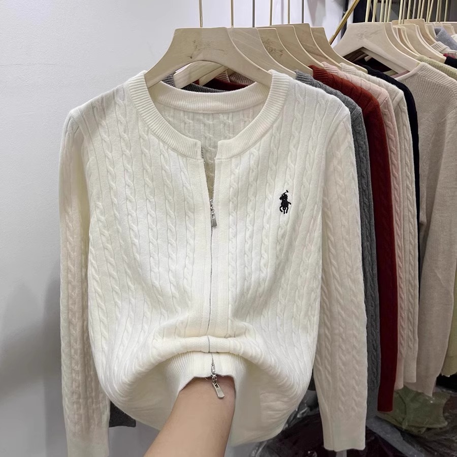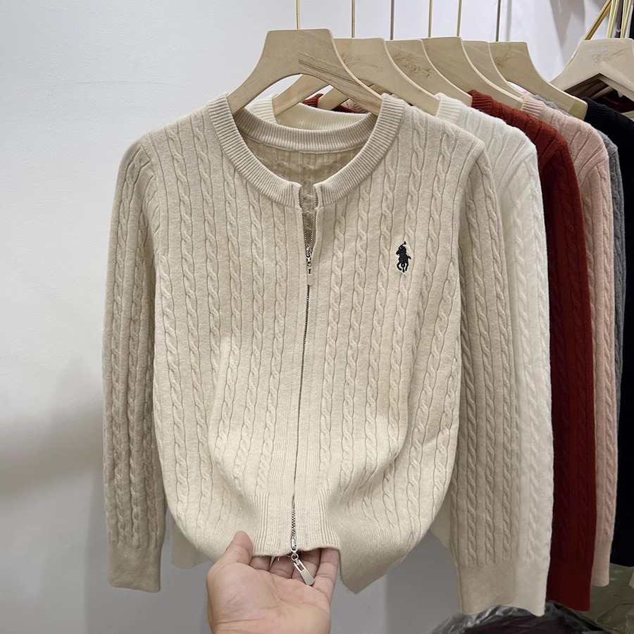 여성을위한 더블 지퍼 트위스트 자수 니트 카디건 봄 새로운 라운드 넥 긴팔 연령 감소 스웨터 재킷 다목적 탑