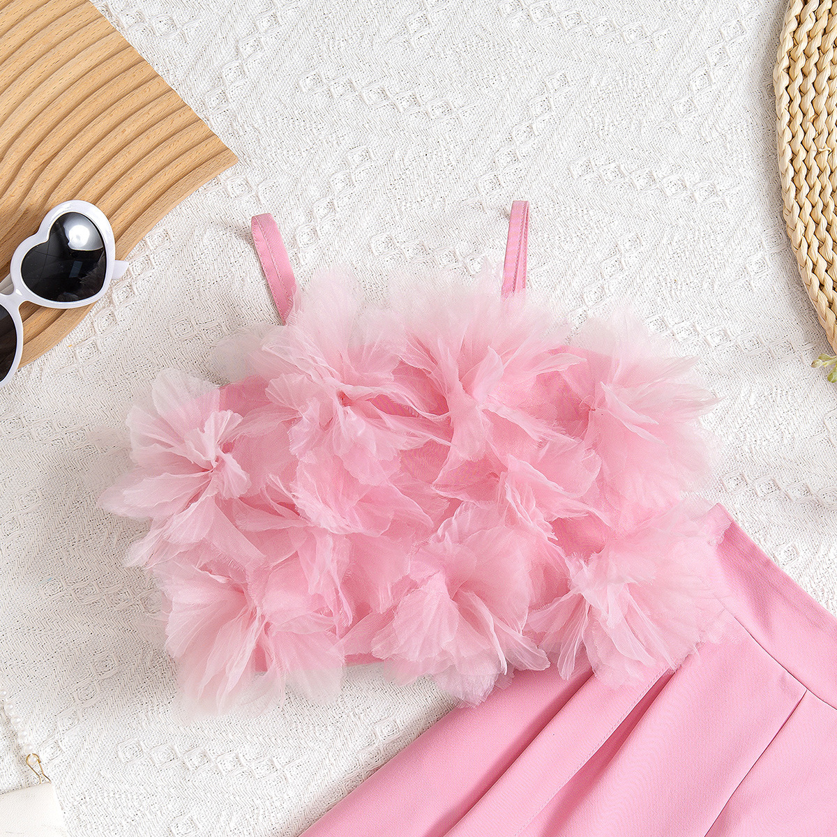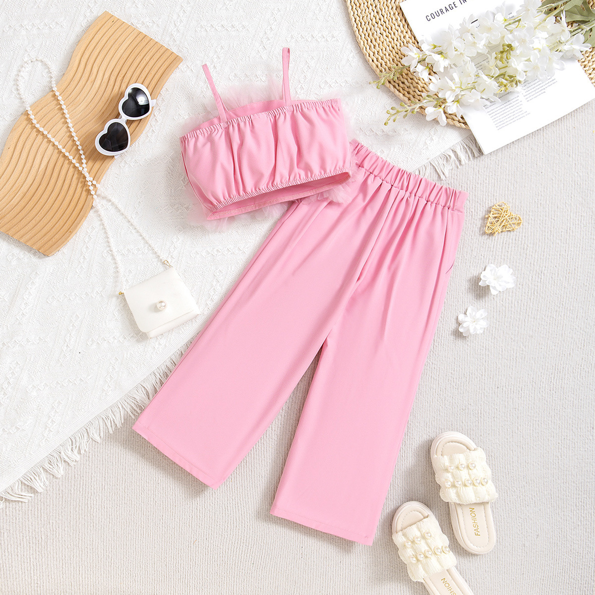 2024 유럽과 미국의 패션 여름 소녀 세트 어린이 슬링 메쉬 꽃 조끼 세트 바지 2 피스 세트