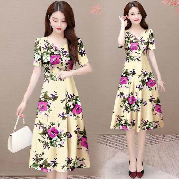 어머니의 여름 한국 스타일 새로운 반팔 원피스 허리 우아한 플러스 사이즈 여성 A 라인 스커트 슬림 원피스스토어 가기