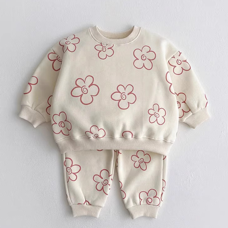 2024 년 아동복 한국식 아동복 가을착용 세트 소녀의 꽃 인쇄 테리 코튼 땀 투피스 세트스토어 가기