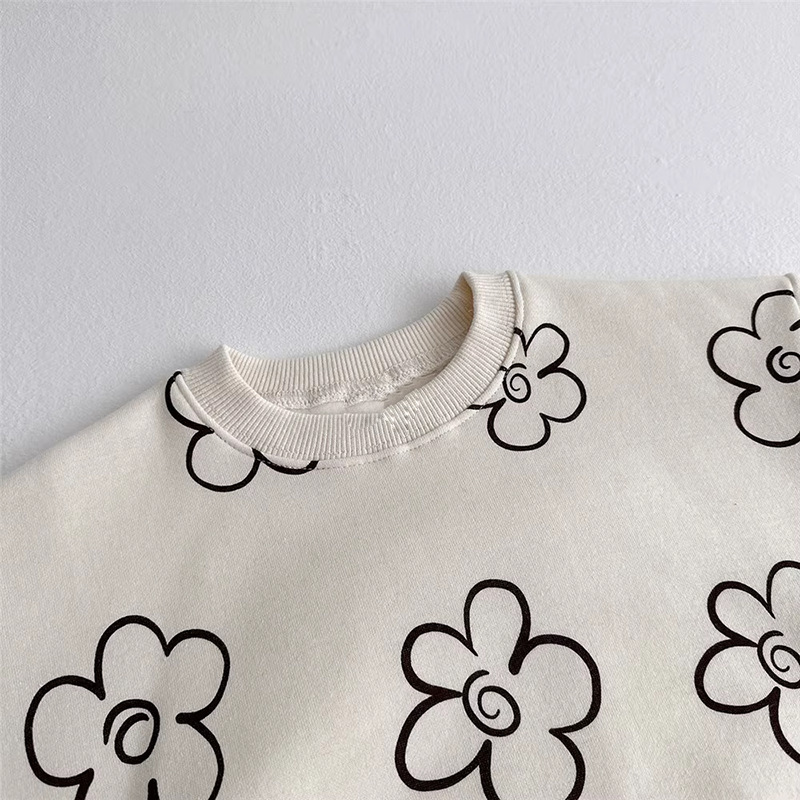 2024 년 아동복 한국식 아동복 가을착용 세트 소녀의 꽃 인쇄 테리 코튼 땀 투피스 세트