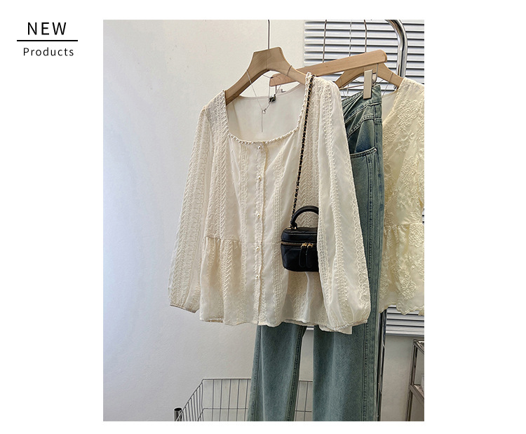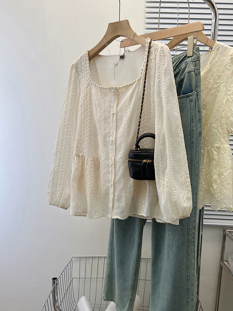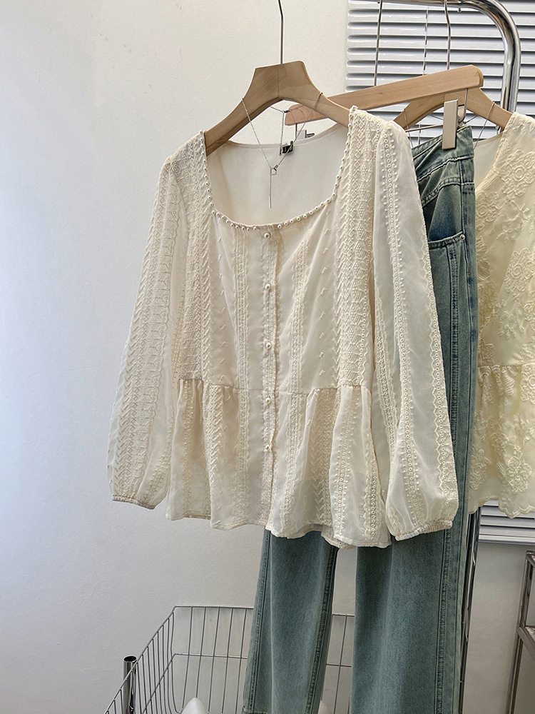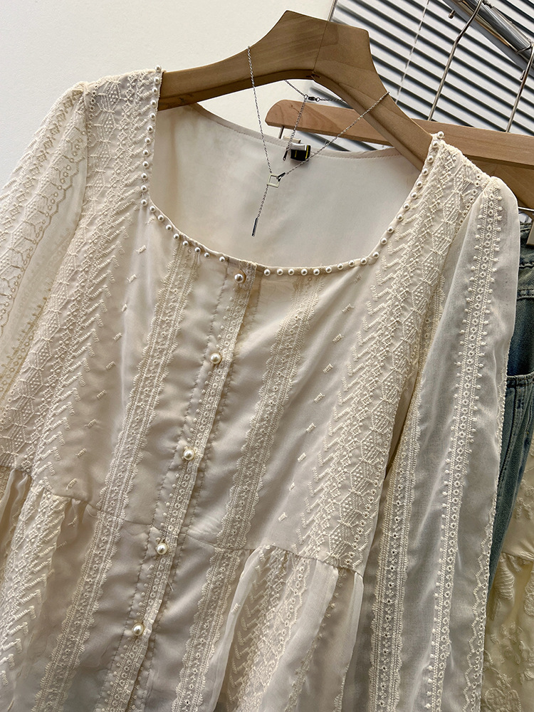 달콤한 스퀘어 칼라 비즈 자수 셔츠 여성용 봄 플러스 사이즈 통통 자매 레트로 프랑스 스타일 나이 감소 슬리밍 탑스토어 가기