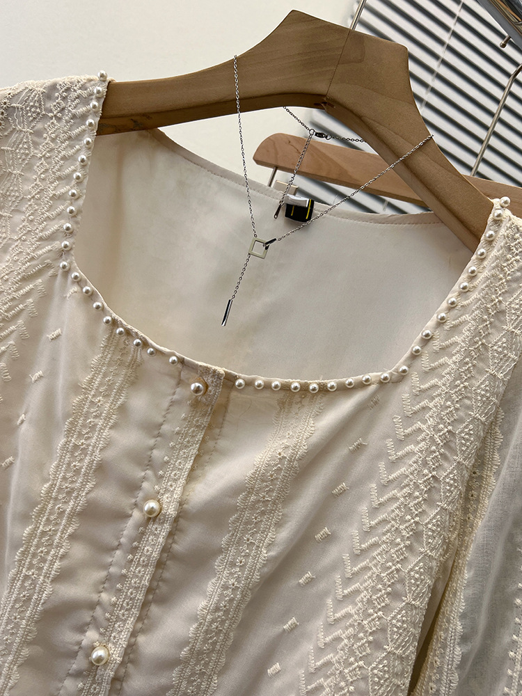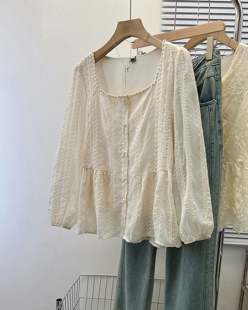 달콤한 스퀘어 칼라 비즈 자수 셔츠 여성용 봄 플러스 사이즈 통통 자매 레트로 프랑스 스타일 나이 감소 슬리밍 탑