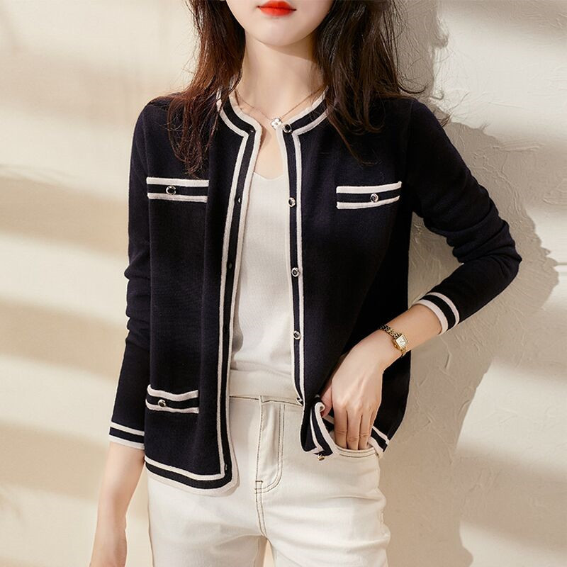 2024 명암 컬러 샤넬 스타일 봄과 가을 니트 카디건 외부 착용 여성을위한 새로운 우아한 긴 소매 스웨터 코트스토어 가기