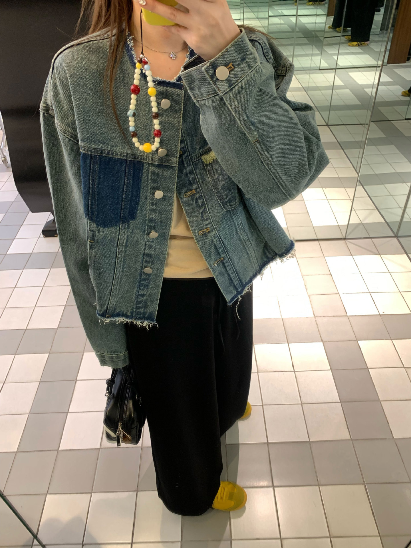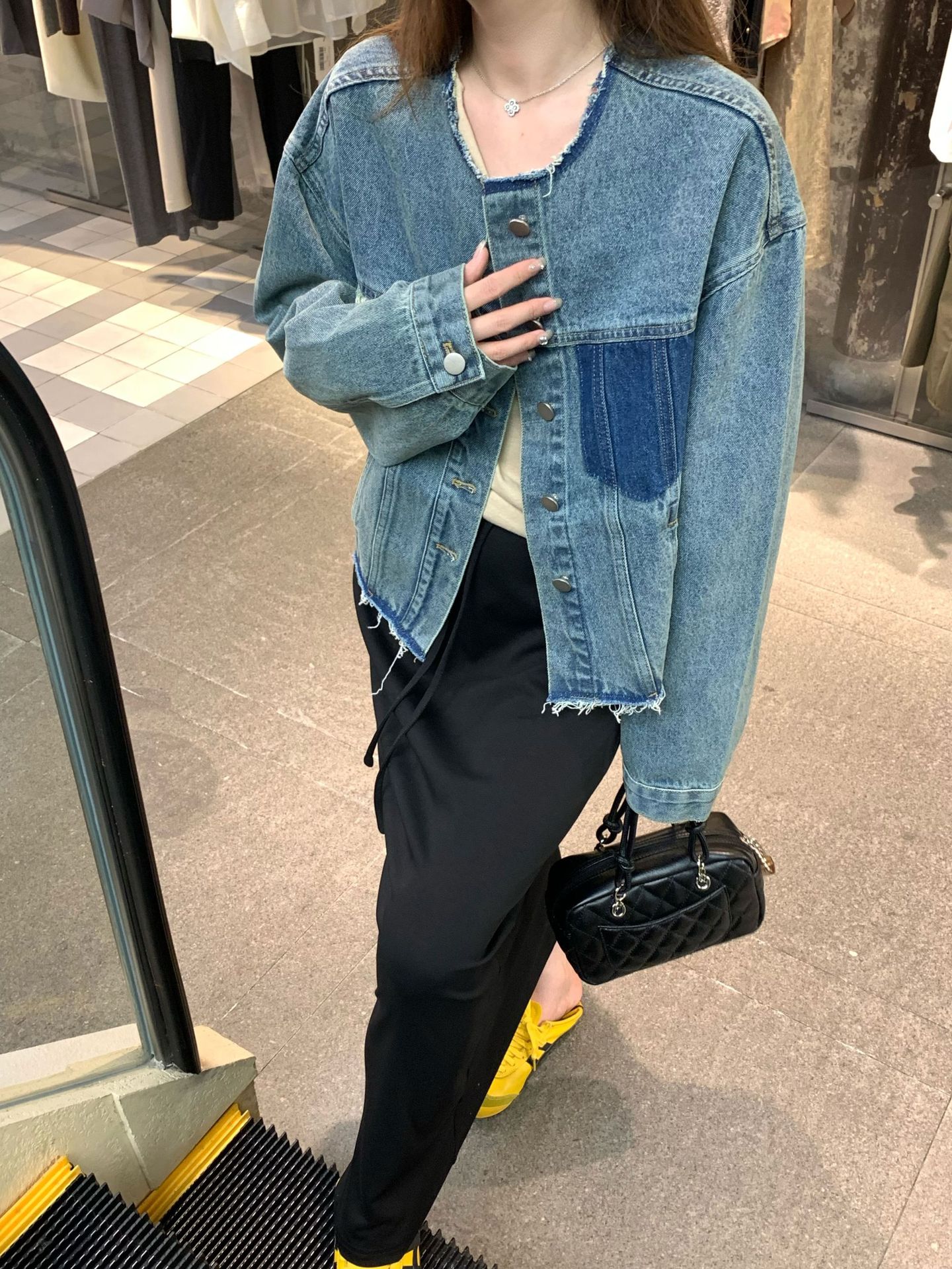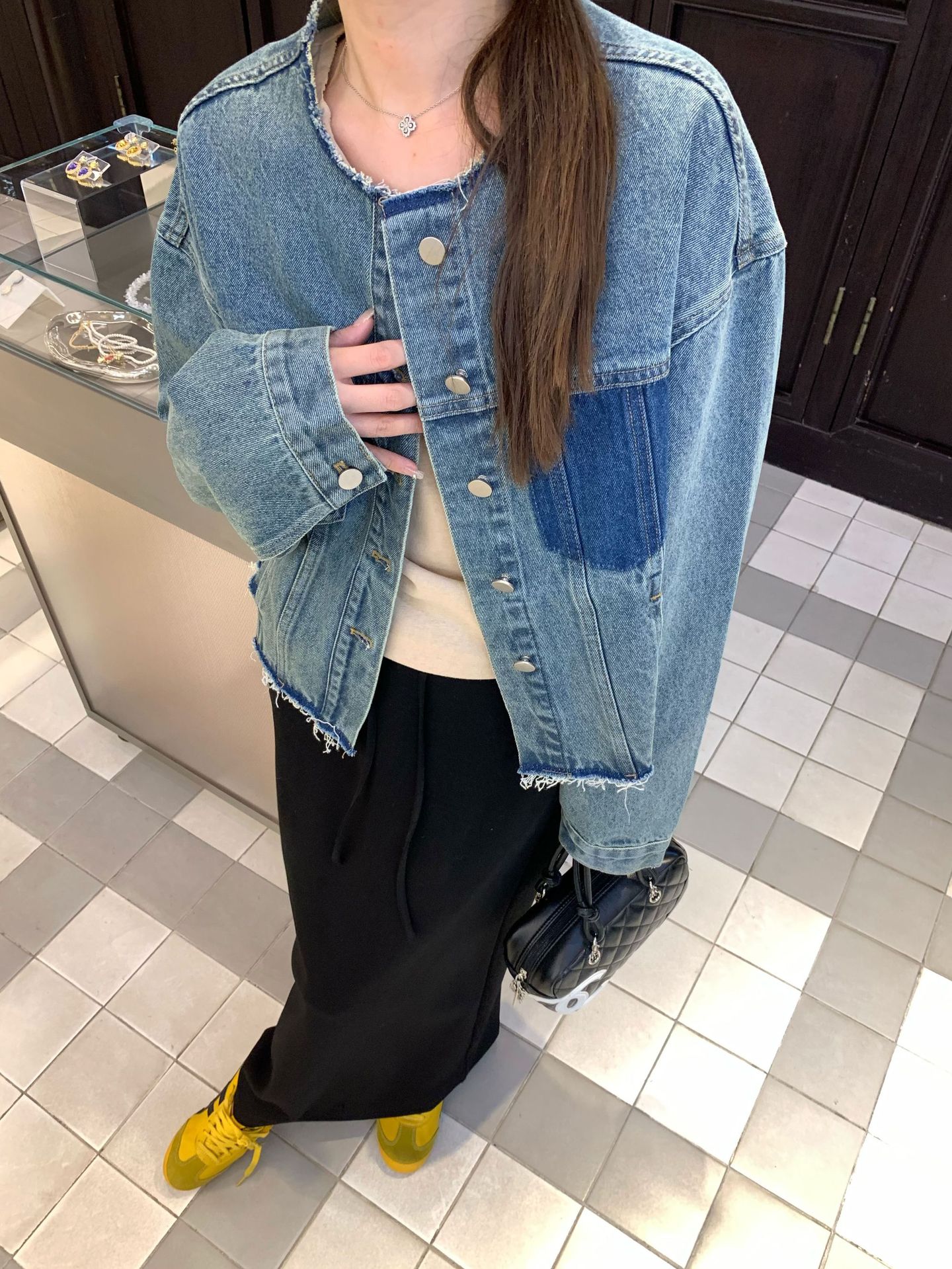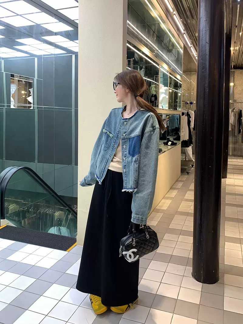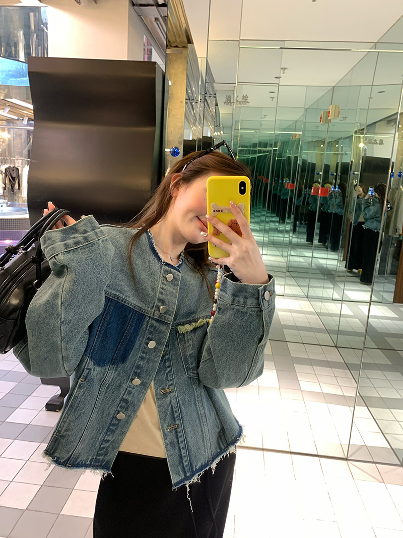 홍콩 스타일 빈티지 세련된 데님 코트 여성의 봄과 가을 세탁 오래 된 디자인 센스 루즈 술 녹 크루 넥 재킷스토어 가기