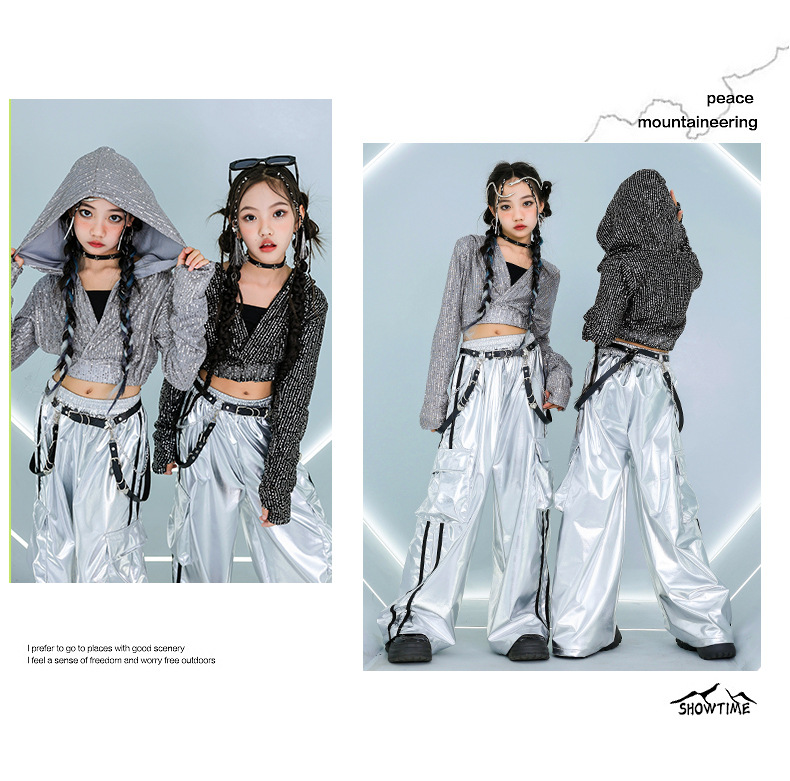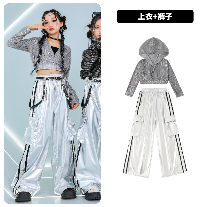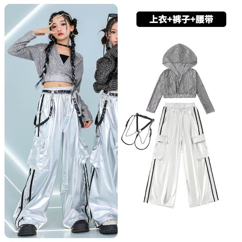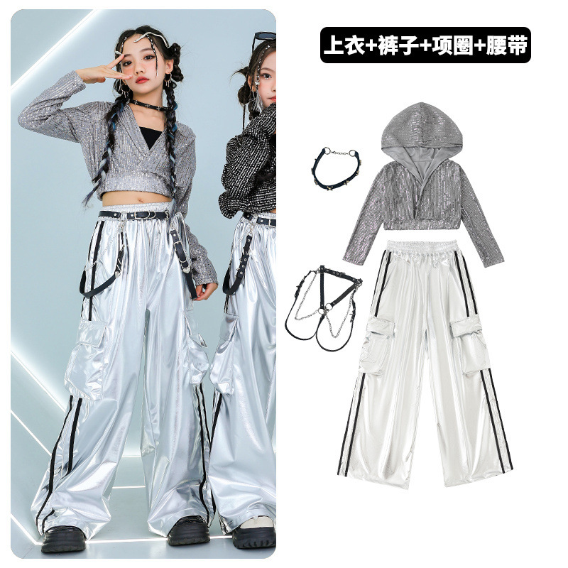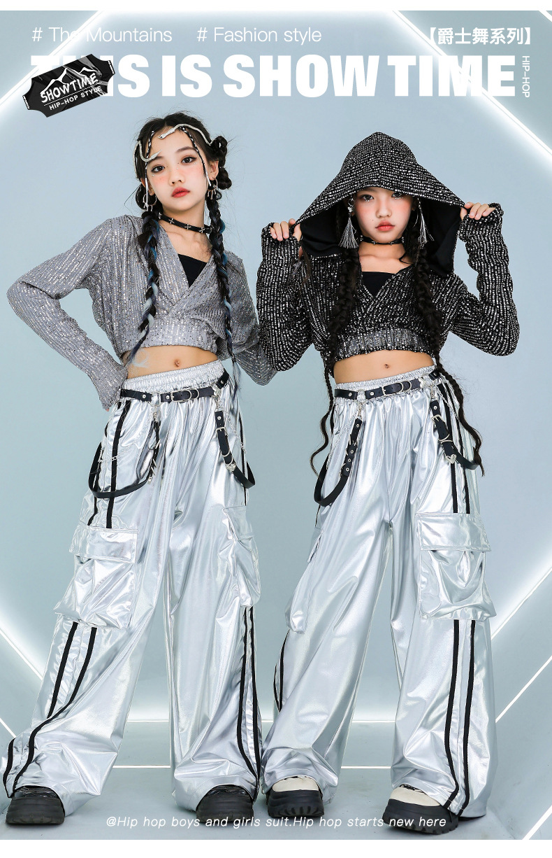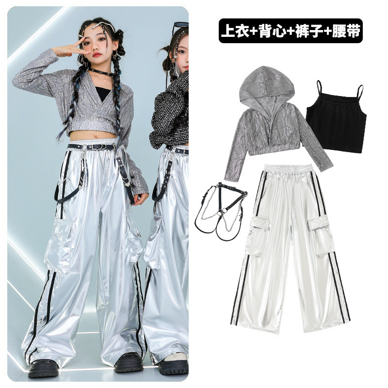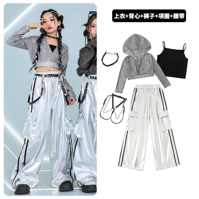 재즈 댄스 걸스 의상 배꼽 실버 속편 세트 유행 거리 대결 댄스 옷 스트리트 댄스 공연 옷 여성스토어 가기
