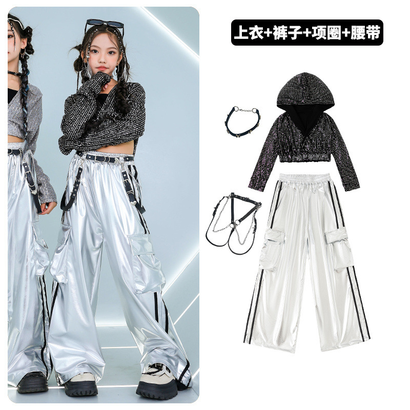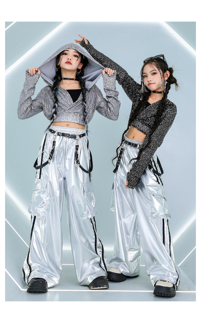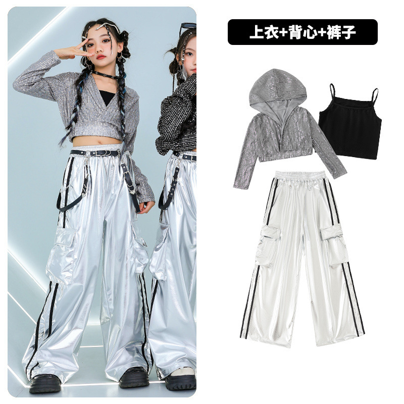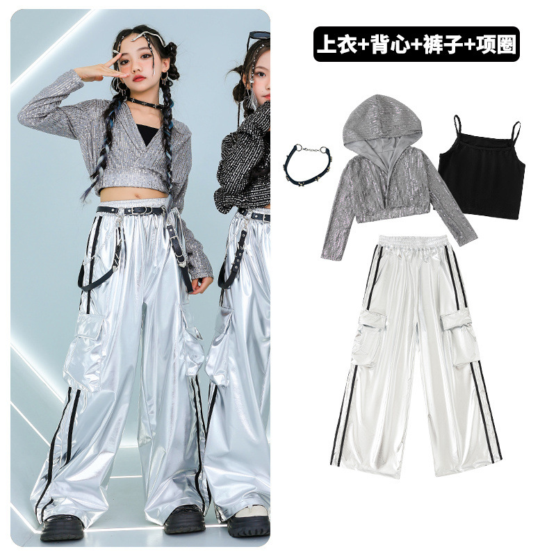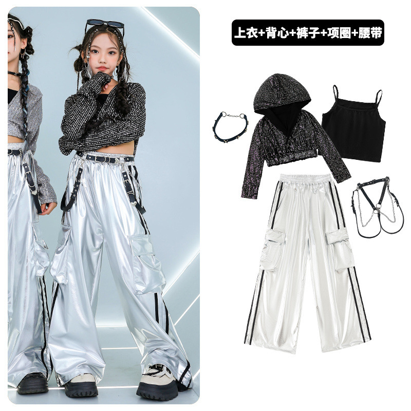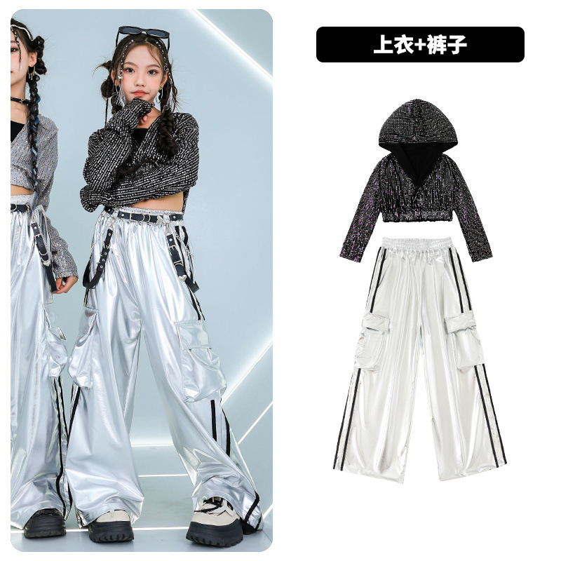 재즈 댄스 걸스 의상 배꼽 실버 속편 세트 유행 거리 대결 댄스 옷 스트리트 댄스 공연 옷 여성스토어 가기