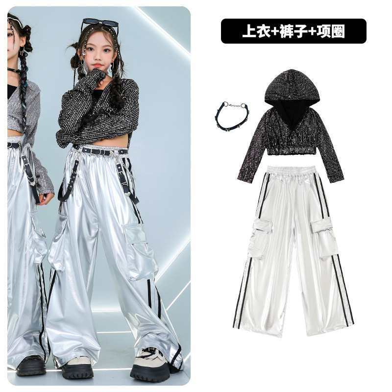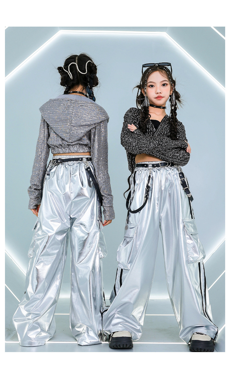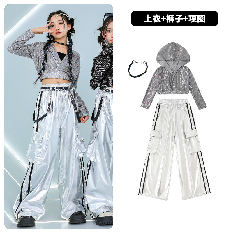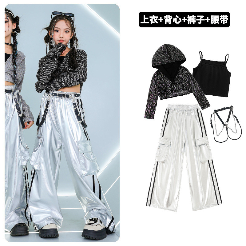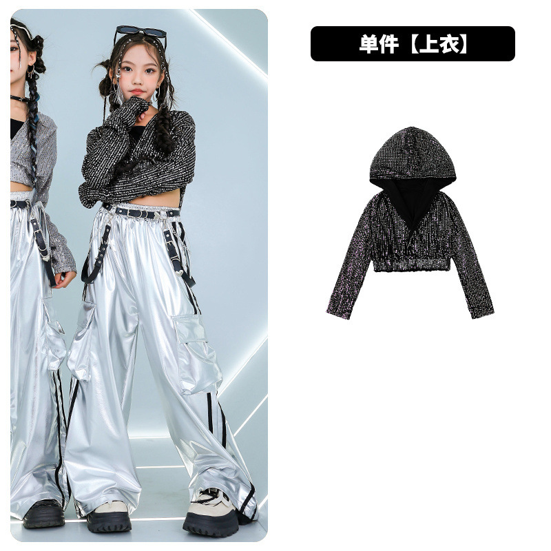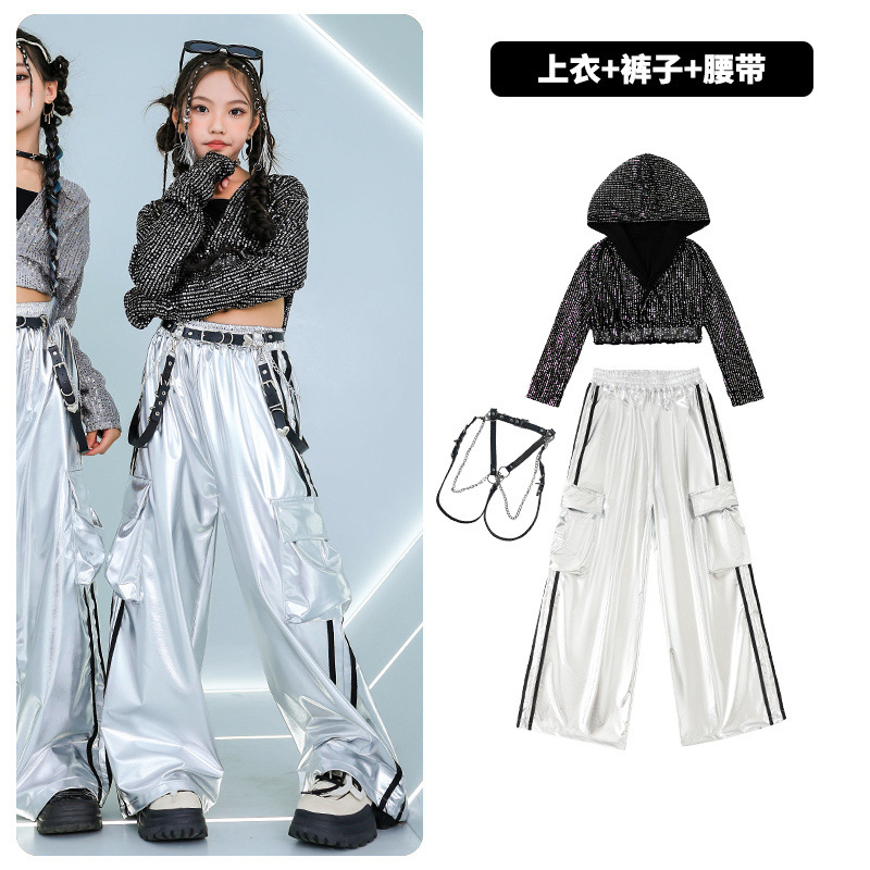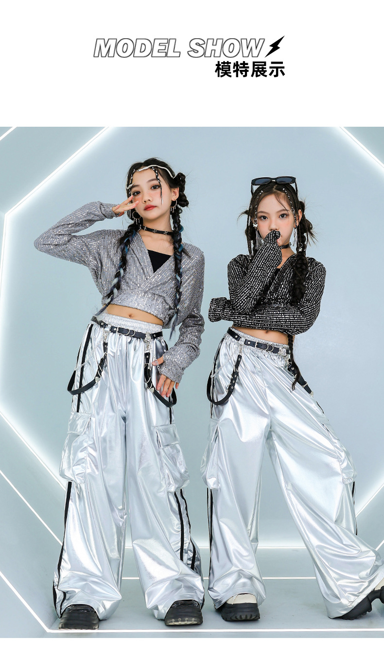 재즈 댄스 걸스 의상 배꼽 실버 속편 세트 유행 거리 대결 댄스 옷 스트리트 댄스 공연 옷 여성스토어 가기