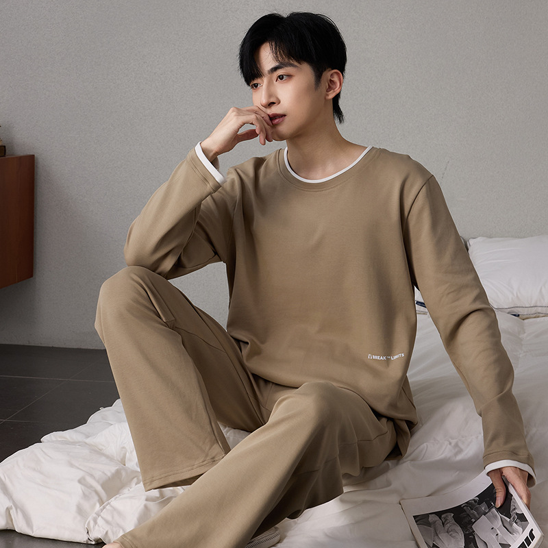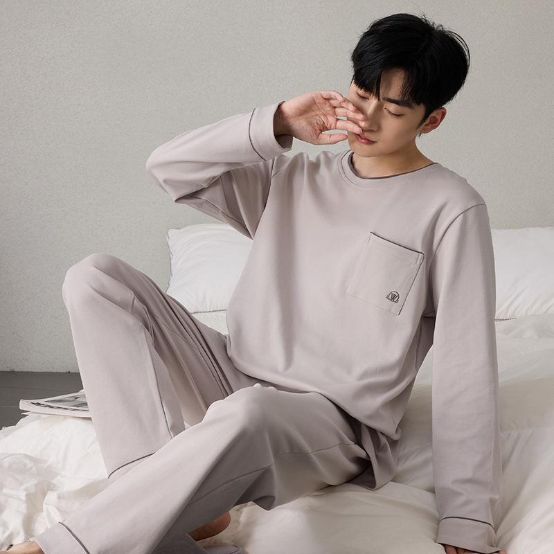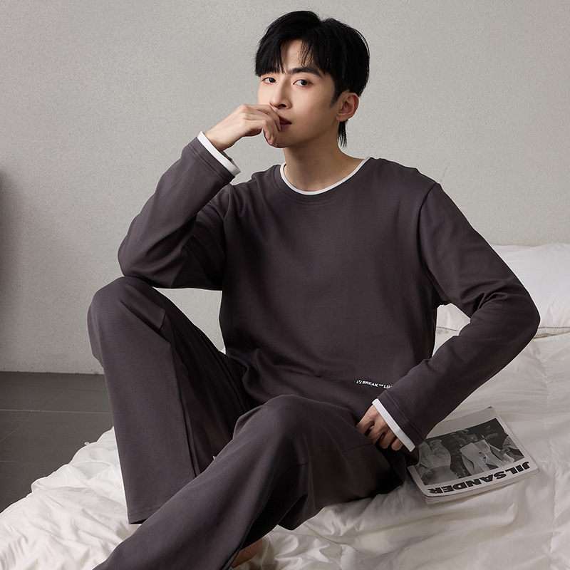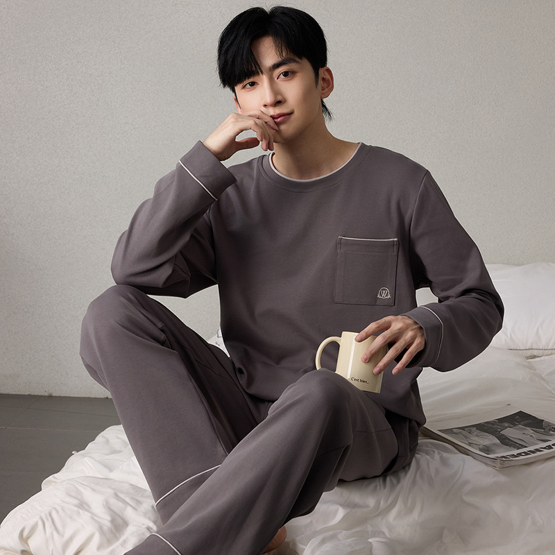순면 남성 잠옷 긴팔 긴바지 가을 겨울 순면 홈웨어 남성용 청년 성인 세트 외출복 가능