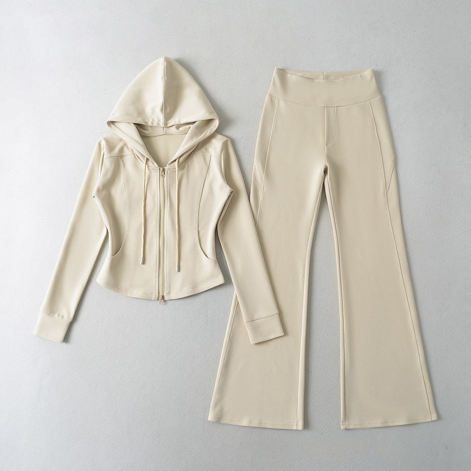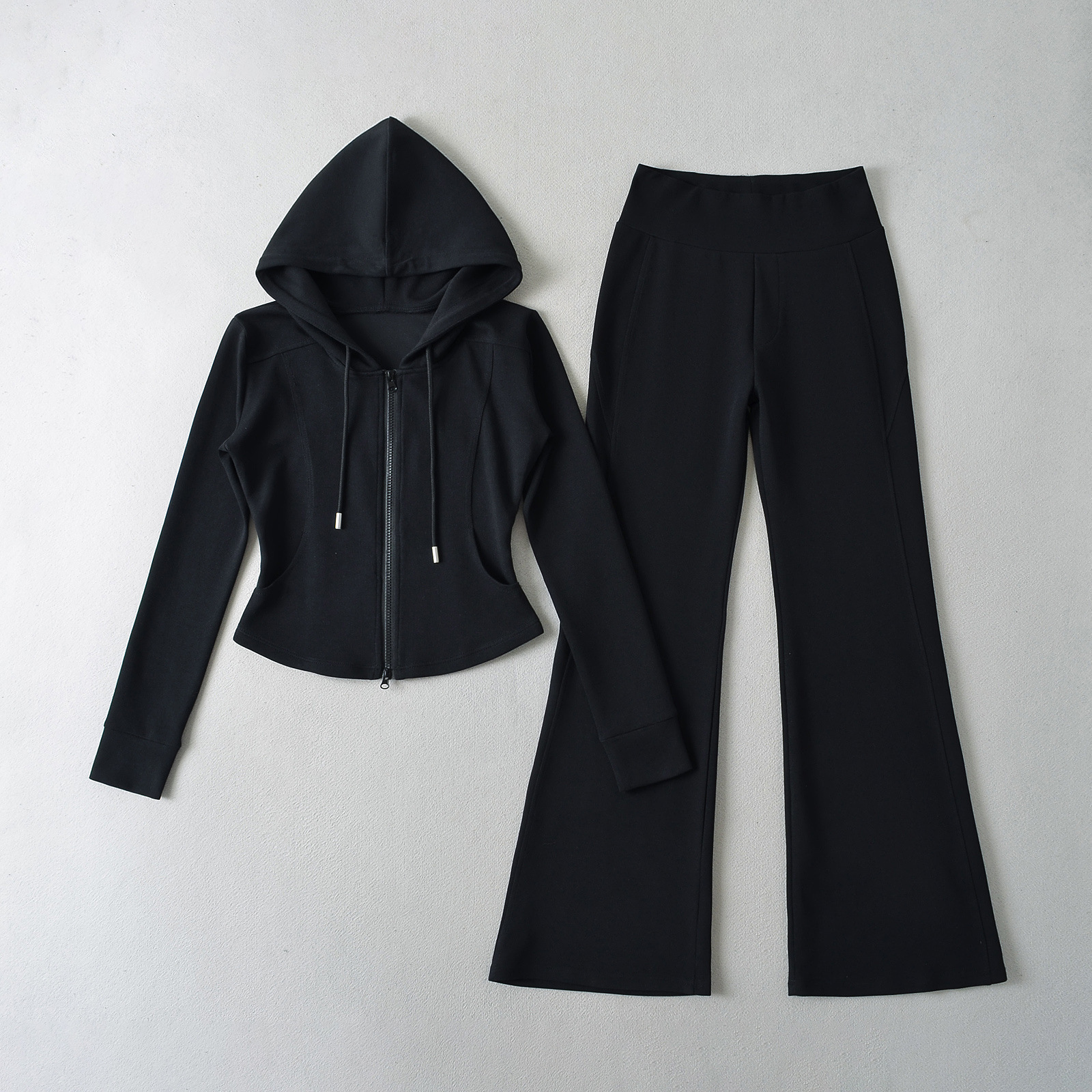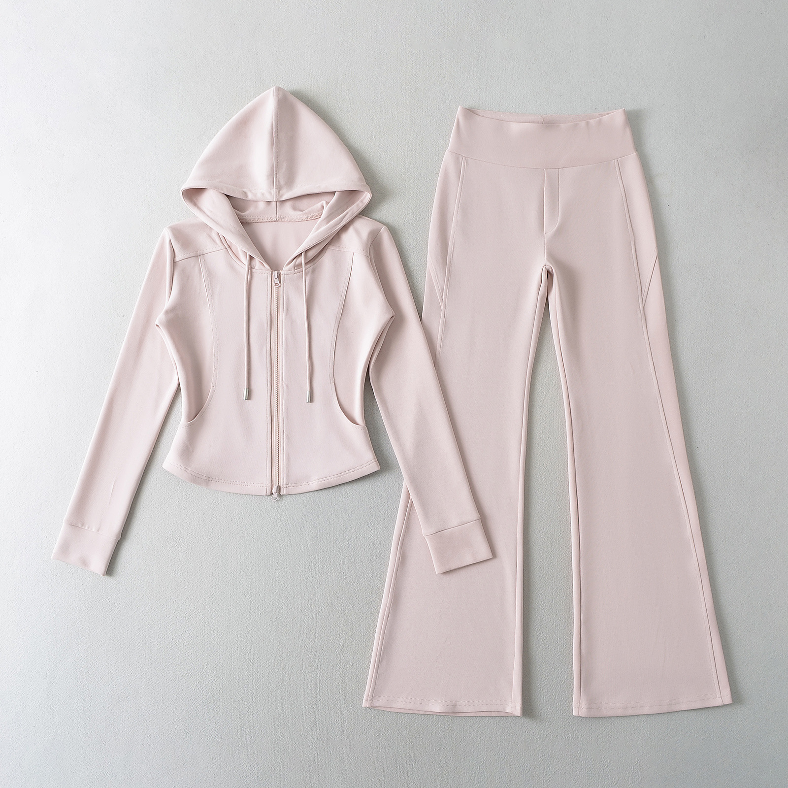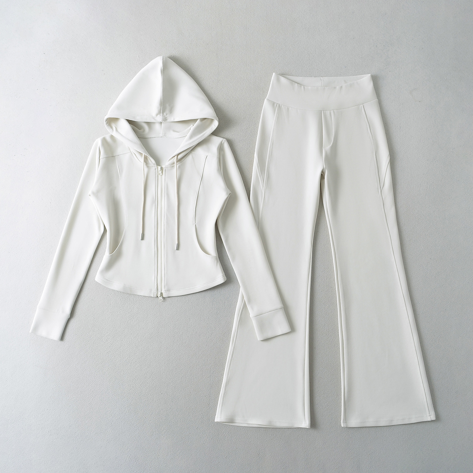 패션 스티칭 허리 슬리밍 지퍼 후드 스웨터 여성용 미국식 핫 걸 슬림 핏 플레어 팬츠