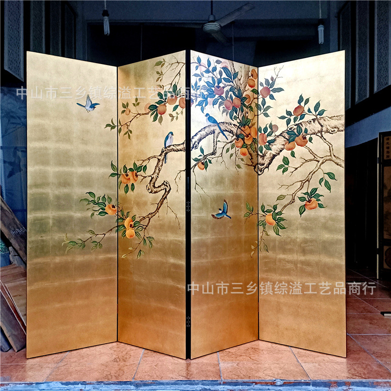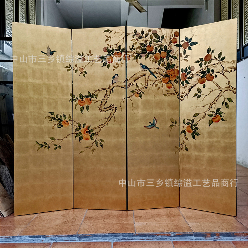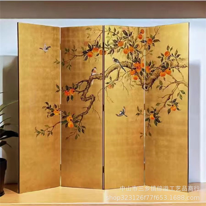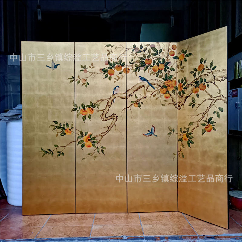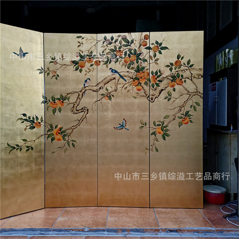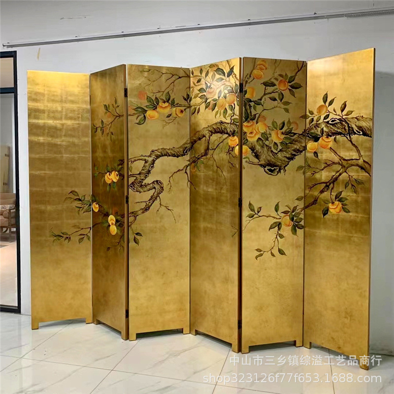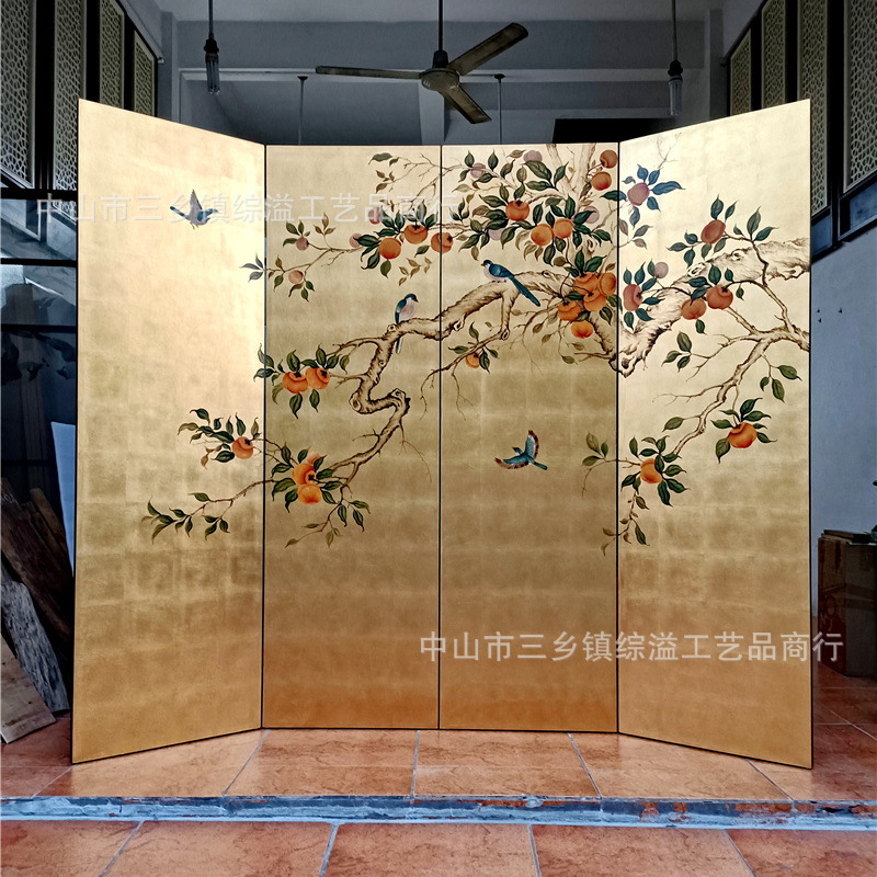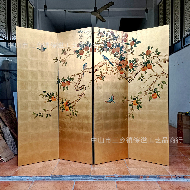 골드 호일 스크린 손으로 그린 모든 것이 잘 래커 그림 중국 거실 연구 파티션 단단한 나무 배경 모바일 접이식 화면스토어 가기