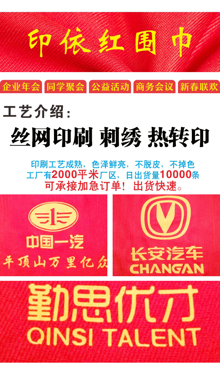 중국 레드 컨퍼런스 레드 스카프 맞춤 로고 레드 자수 인쇄 선물 귀향 스카프스토어 가기