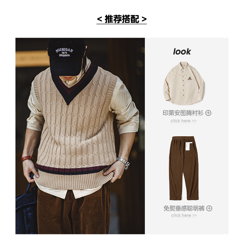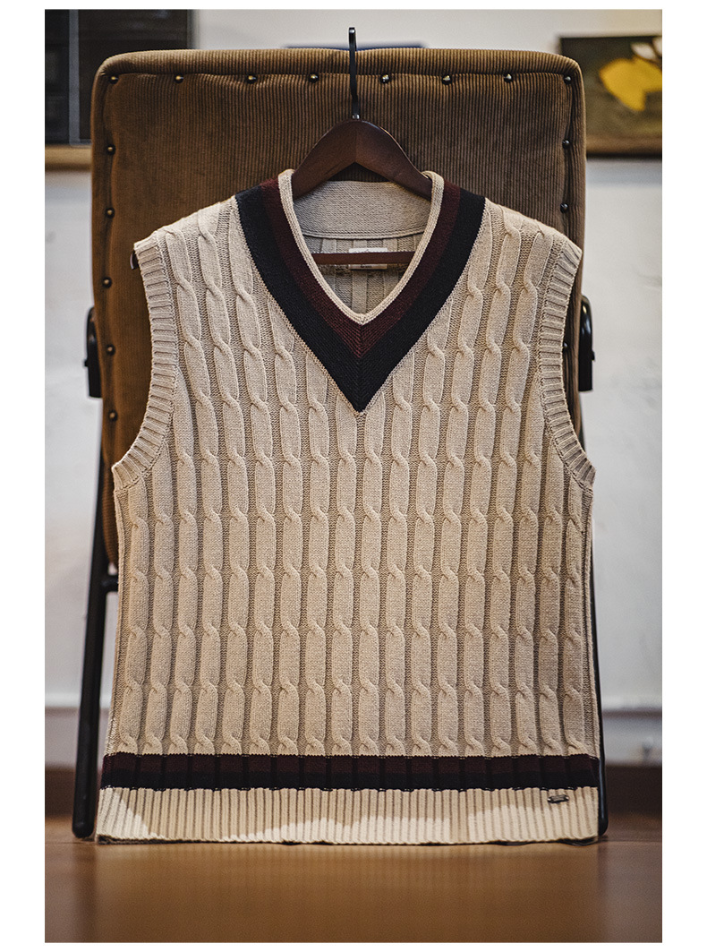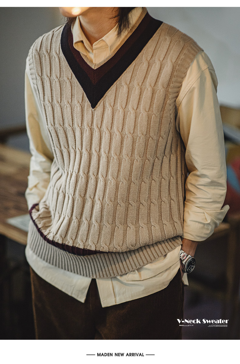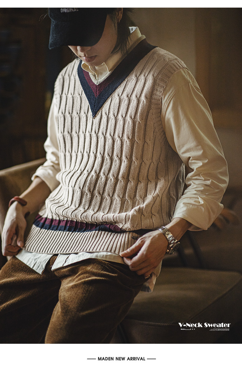 매든 툴링 아메리칸 스타일 빈티지 IVY 니트 V-Neck 스웨터 조끼 대학 스타일 대비 컬러 트위스트 꽃 민소매 조끼 남성 가을