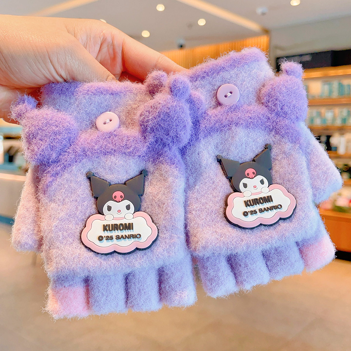 쿠로미 어린이용 장갑, 남아 및 여아용 귀여운 만화 벨벳 플립 탑 다섯 손가락 장갑, 여아용 필기 및 보온용 장갑스토어 가기