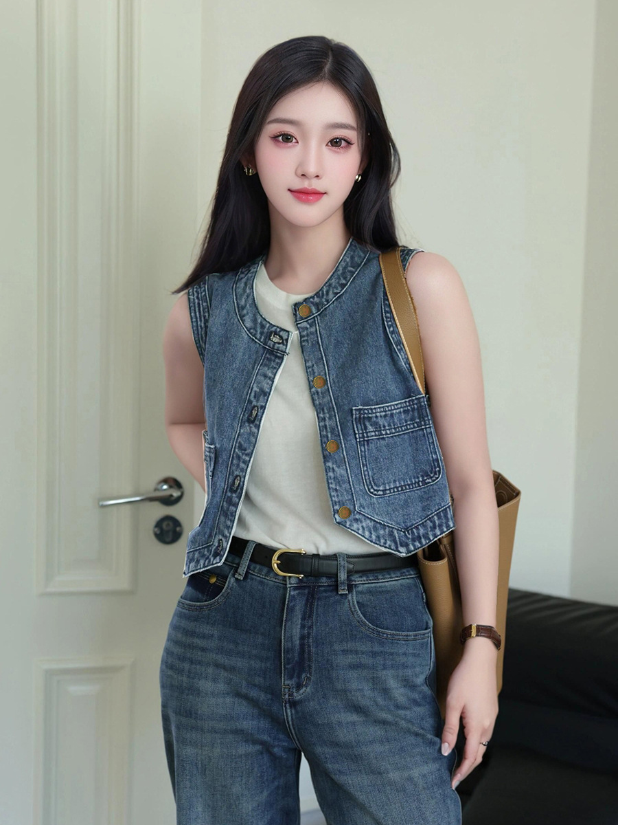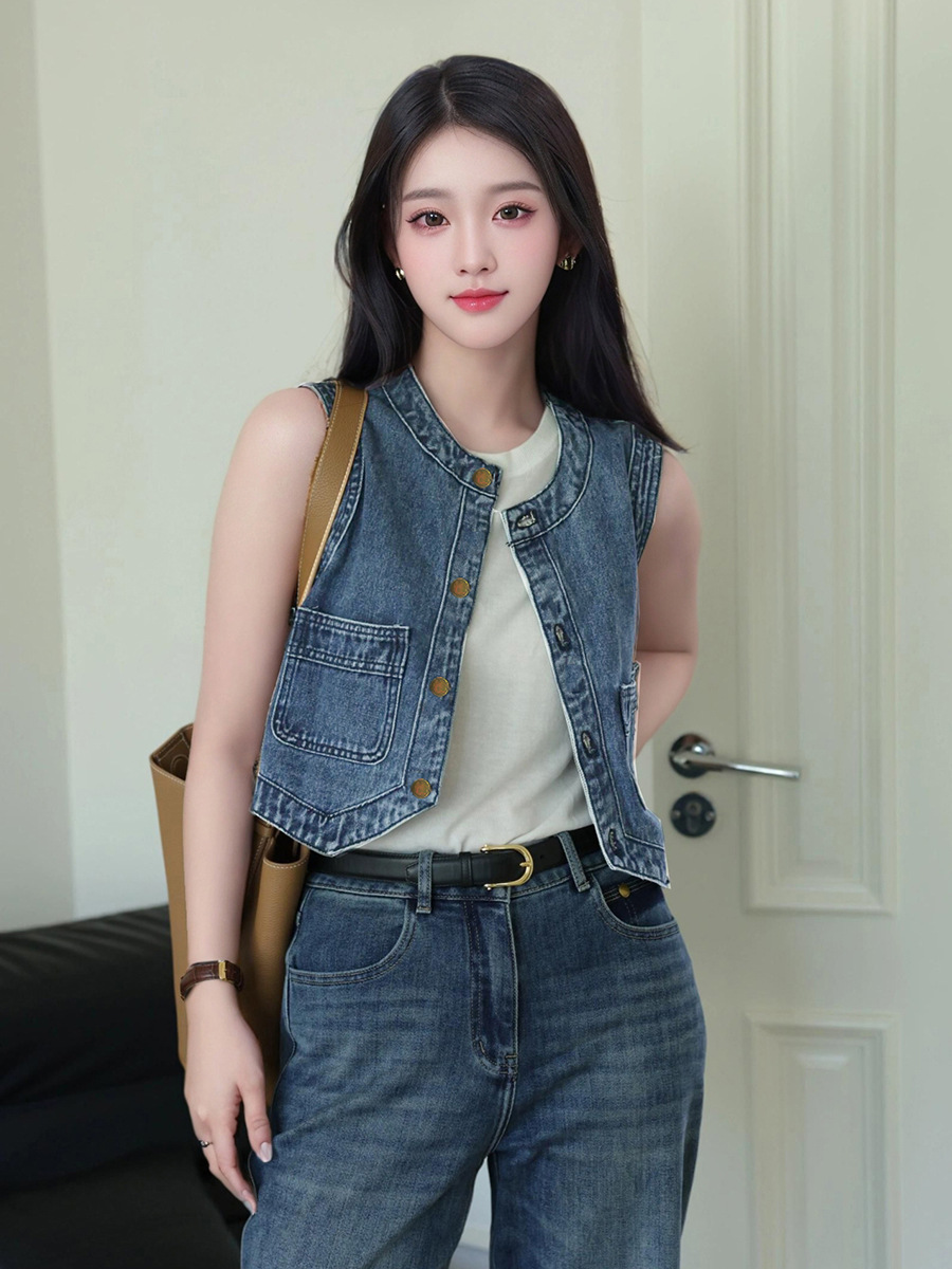 아메리칸 스타일 레트로 고급 크루 넥 데님 조끼 여성 여름 달콤한 쿨 스타일 디자인 짧은 웨이스트 코트 카디건