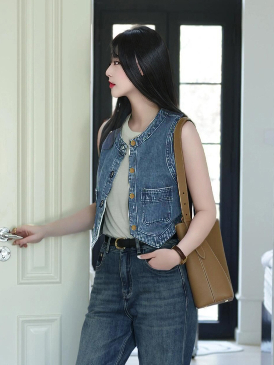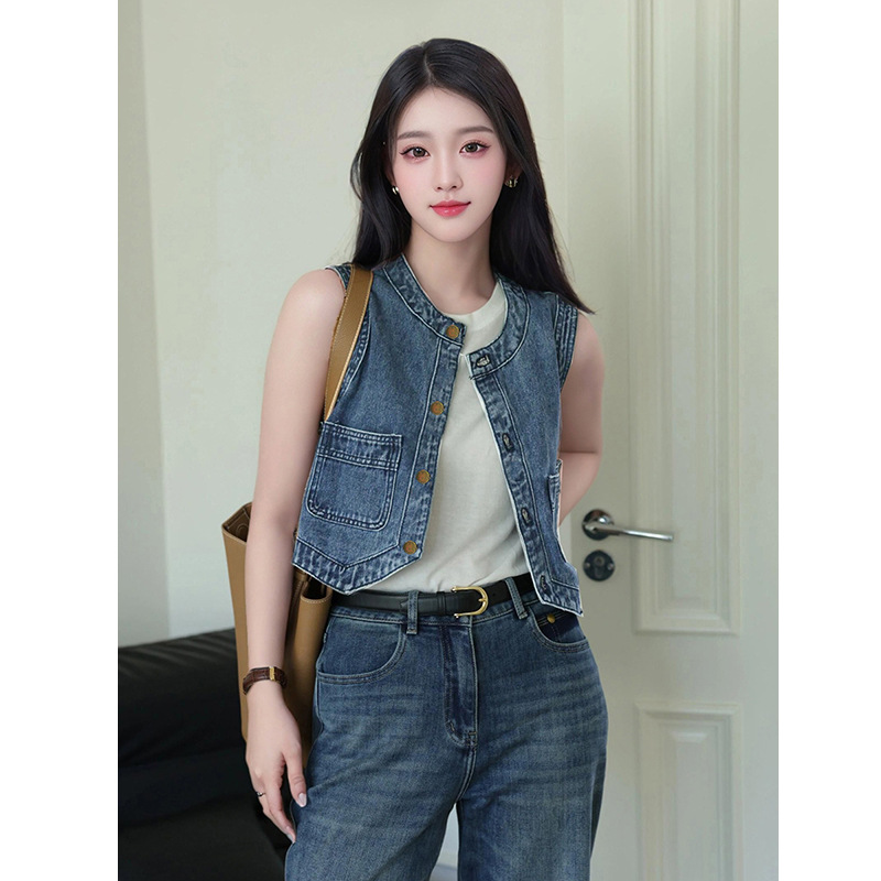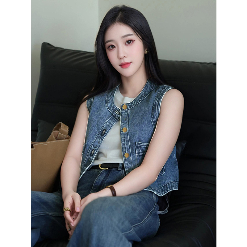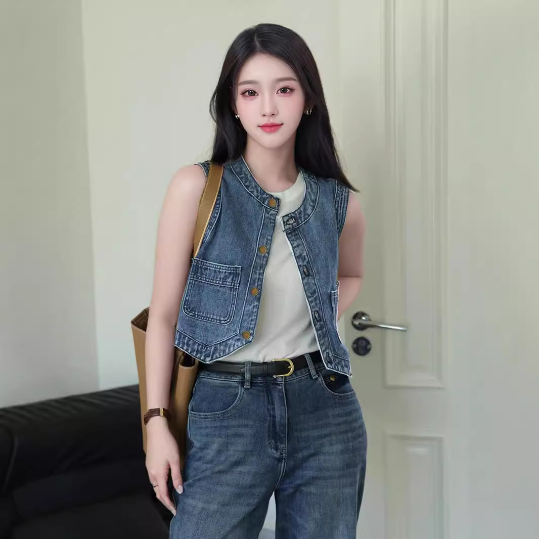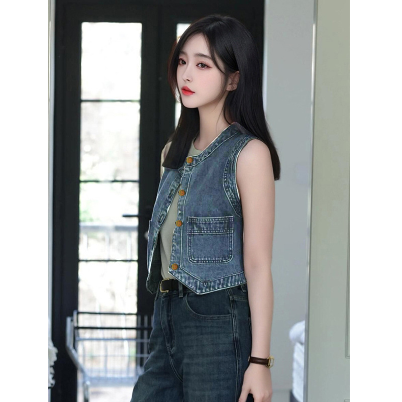 아메리칸 스타일 레트로 고급 크루 넥 데님 조끼 여성 여름 달콤한 쿨 스타일 디자인 짧은 웨이스트 코트 카디건스토어 가기