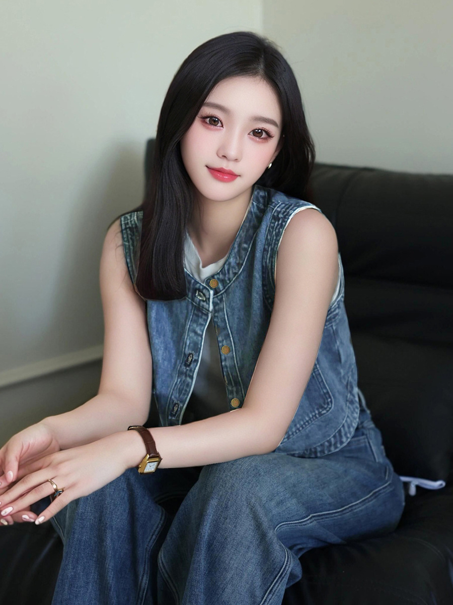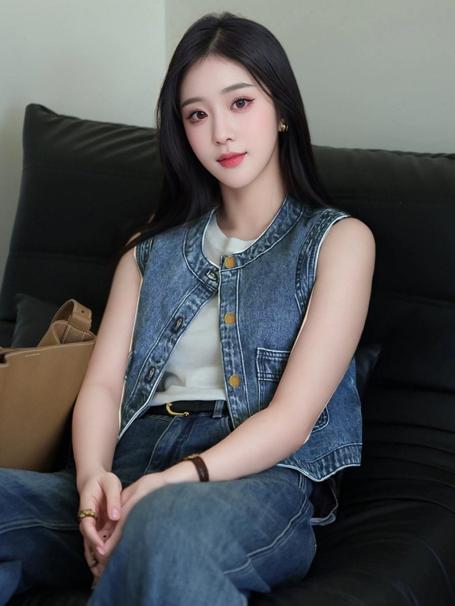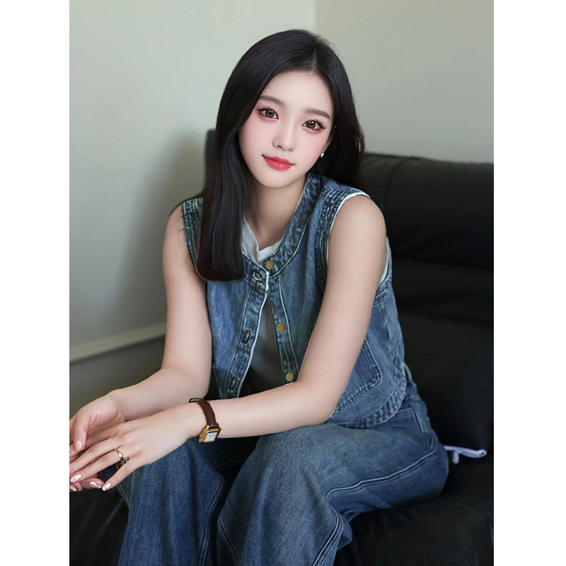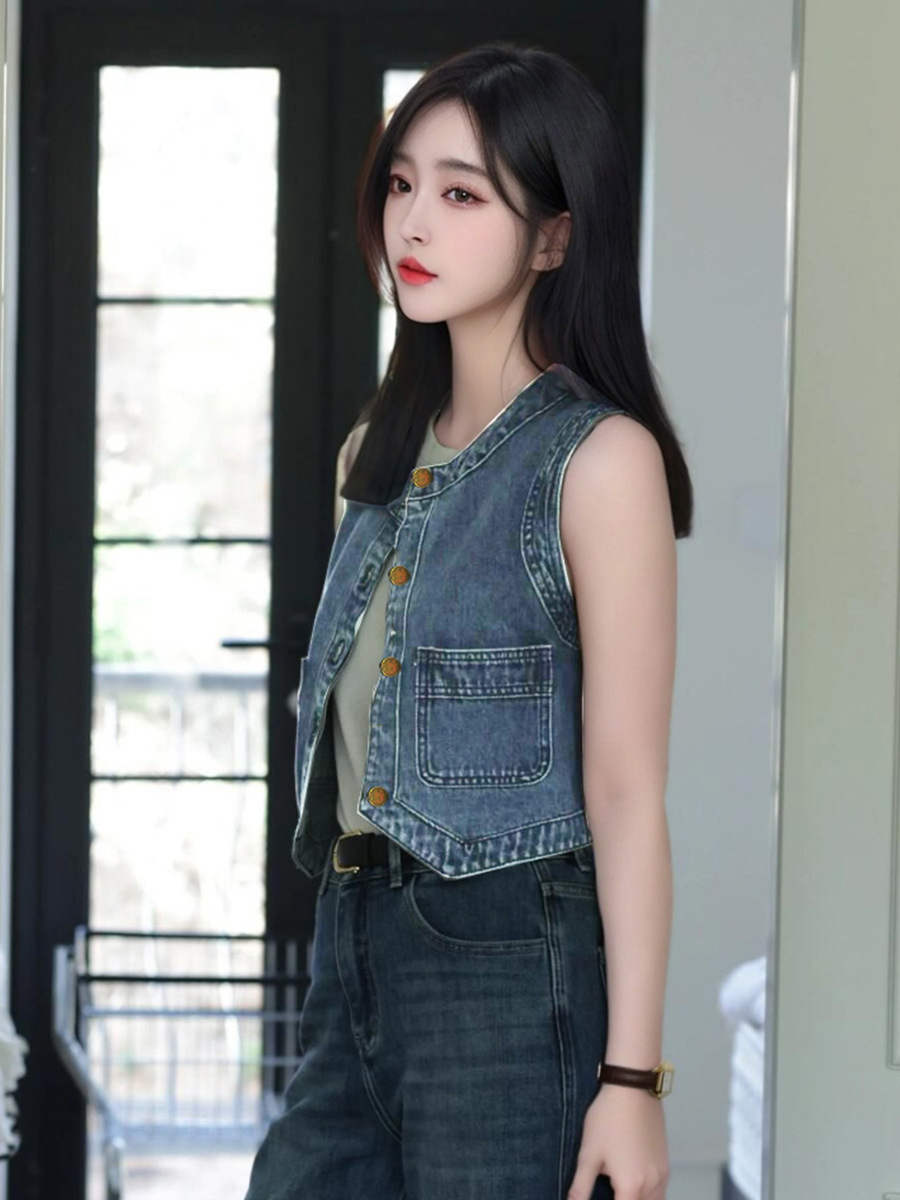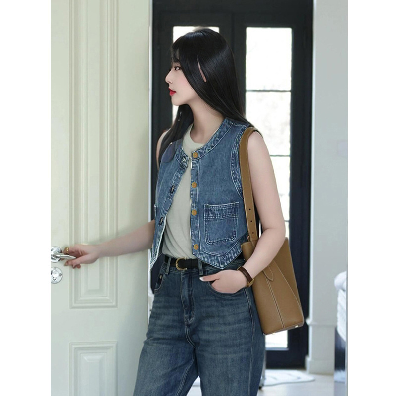 아메리칸 스타일 레트로 고급 크루 넥 데님 조끼 여성 여름 달콤한 쿨 스타일 디자인 짧은 웨이스트 코트 카디건스토어 가기
