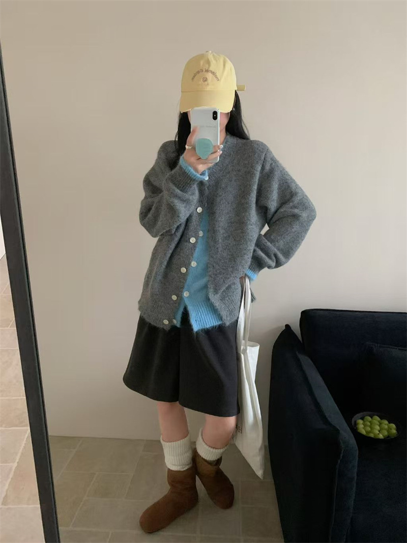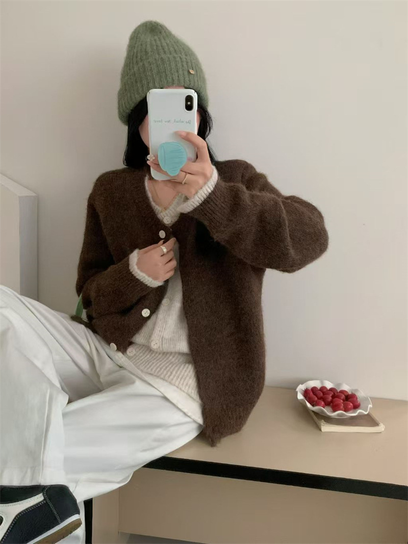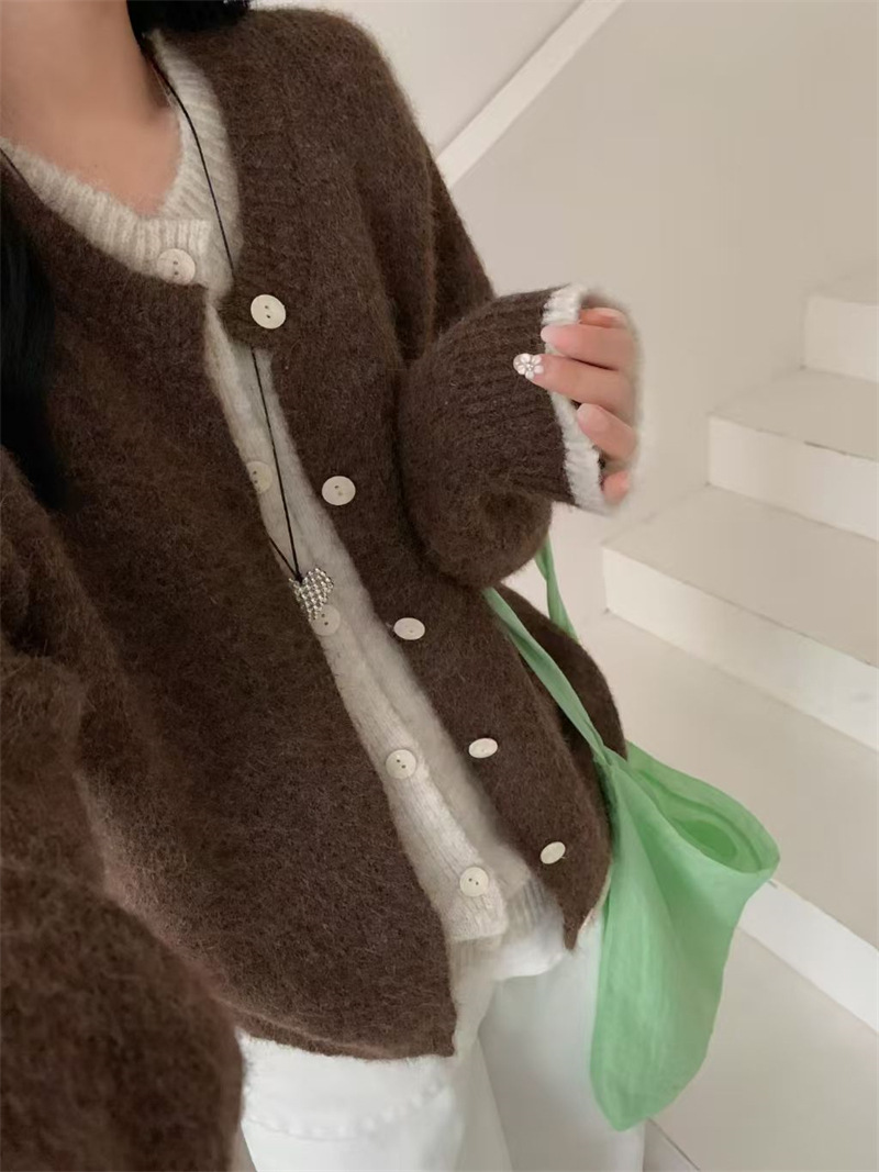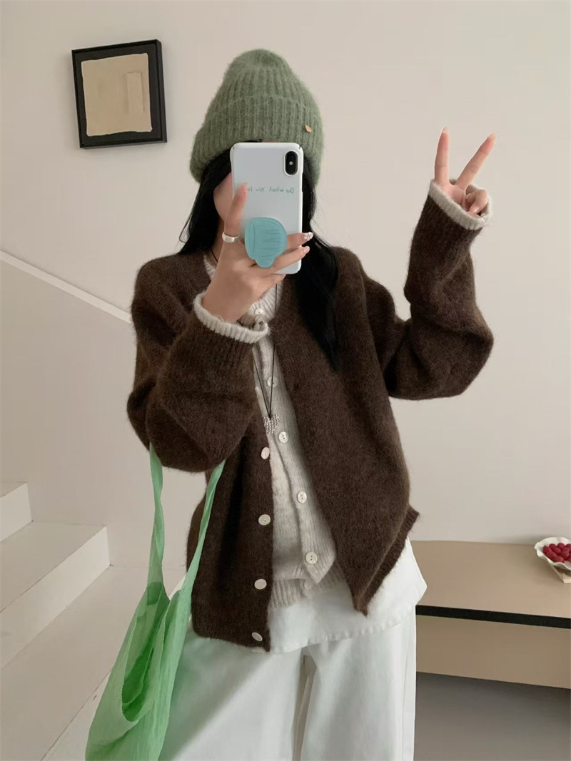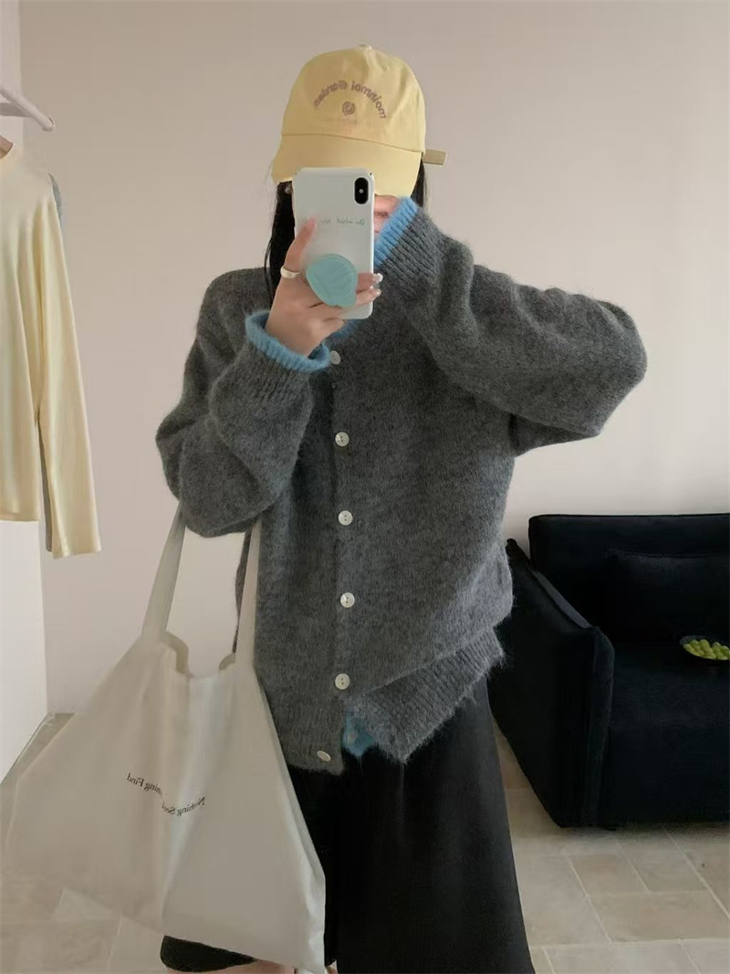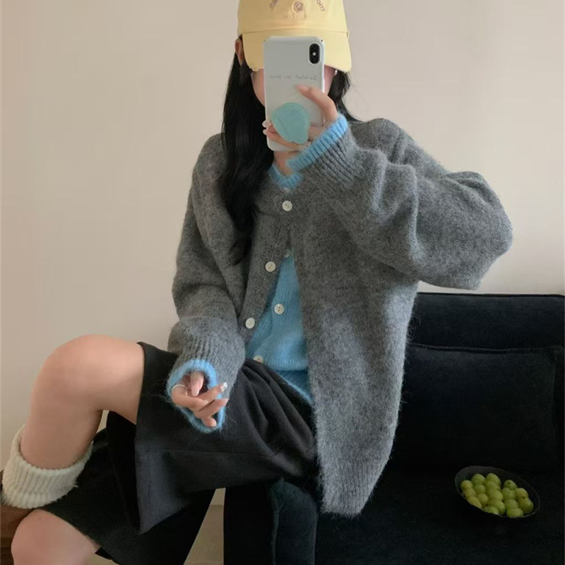 한국 스타일 라운드넥 페이크 투피스 스웨터 자켓 여성용 2025 가을 겨울 부드럽고 여유로운 루즈핏 배색 니트 가디건 상의스토어 가기
