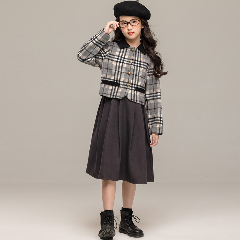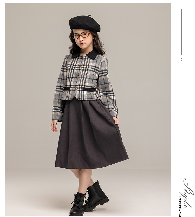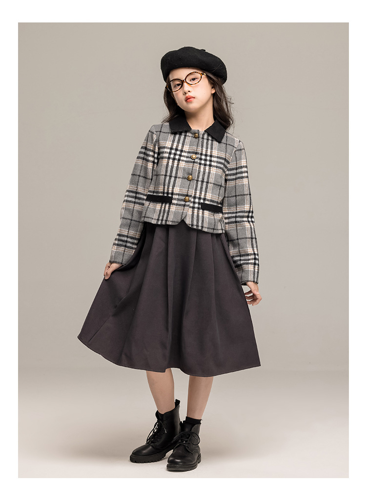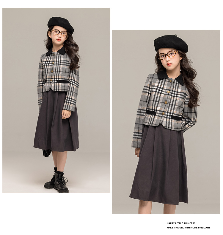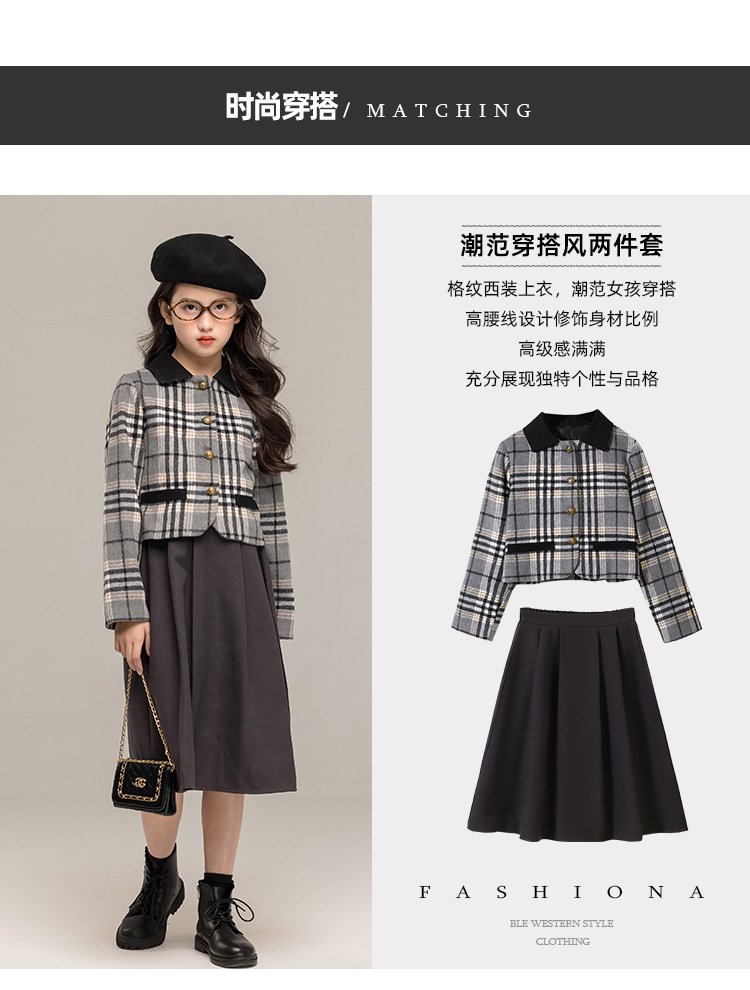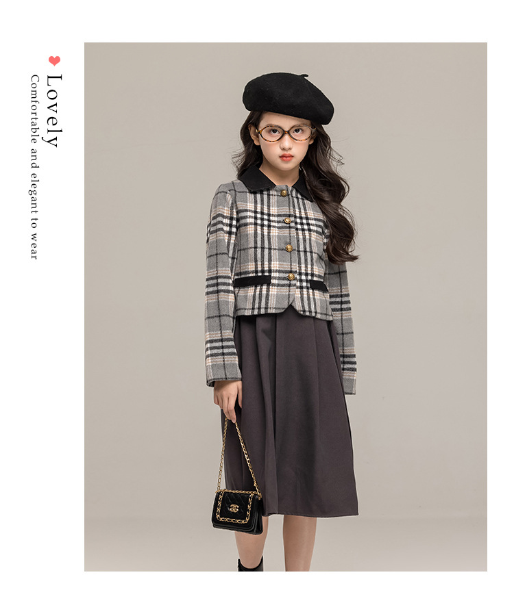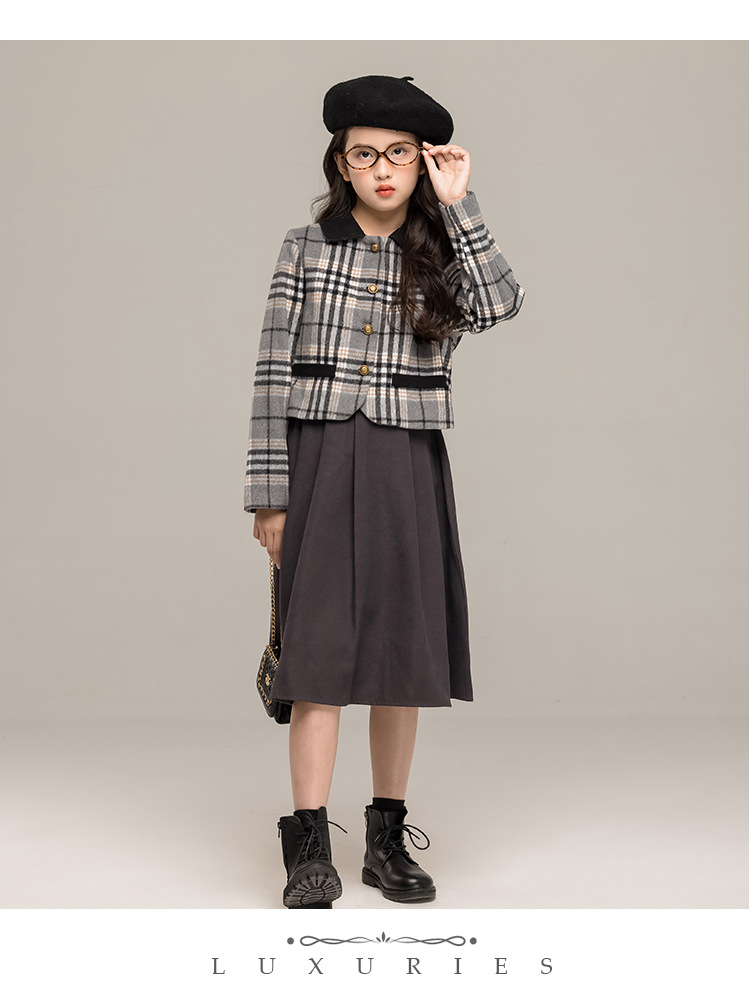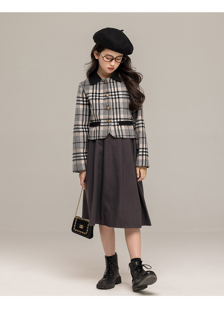 24 가을 겨울 새로운 소녀 패션 투피스 세트 두꺼운 모직 코트 높은 허리 주름 치마 작은 샤넬 스타일 세트