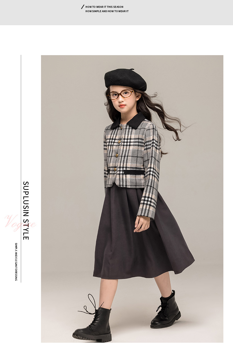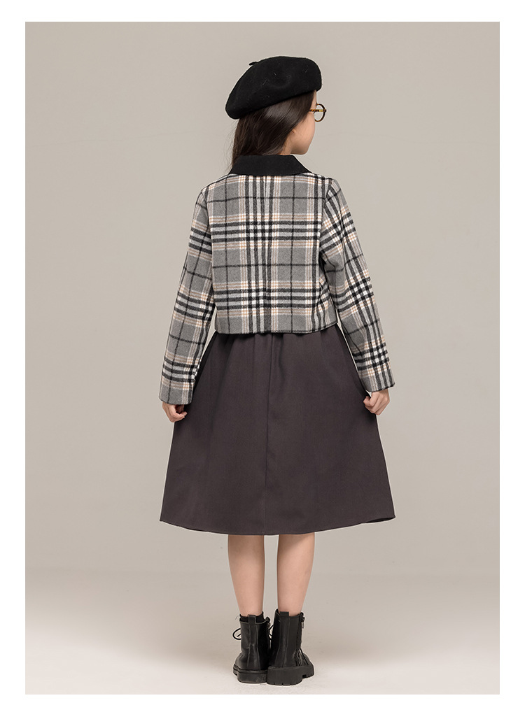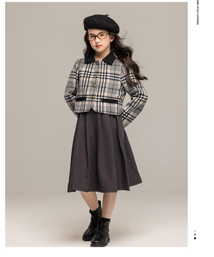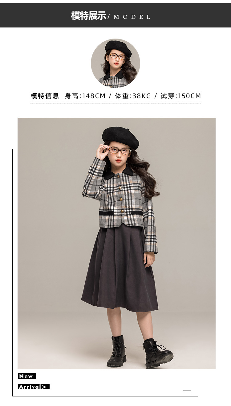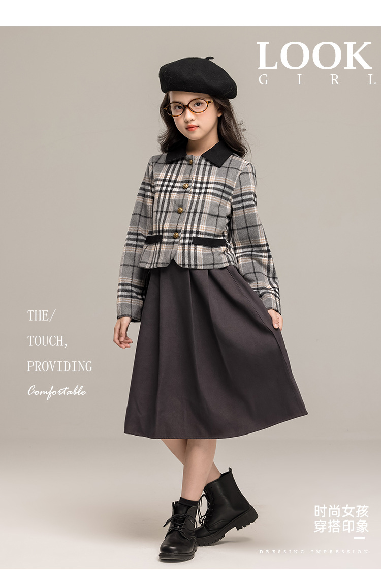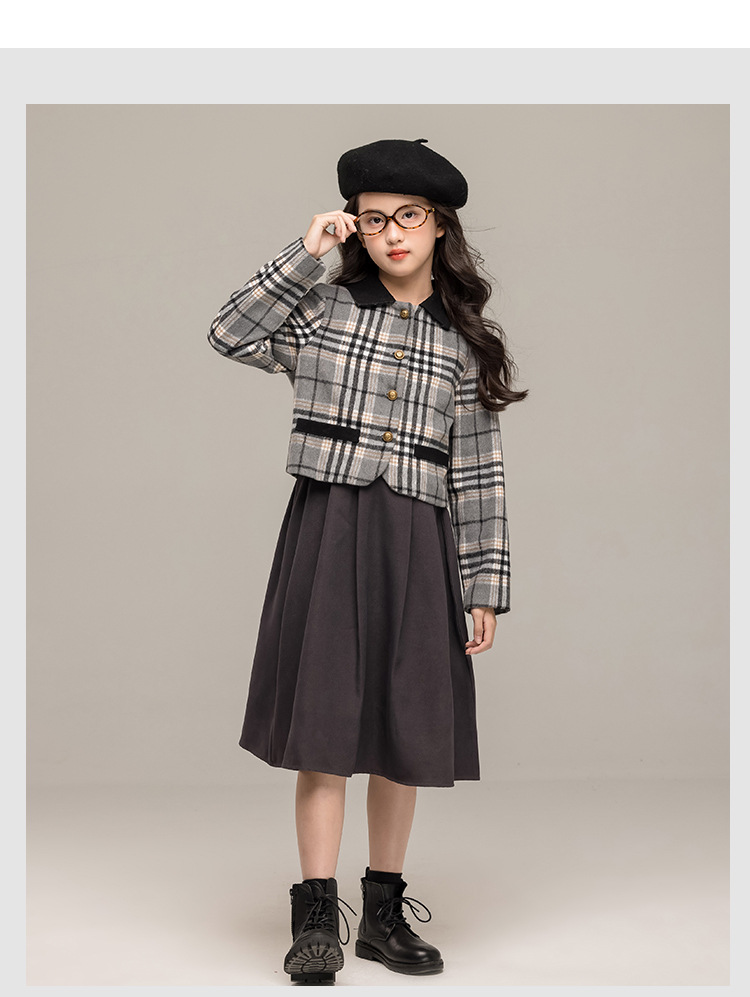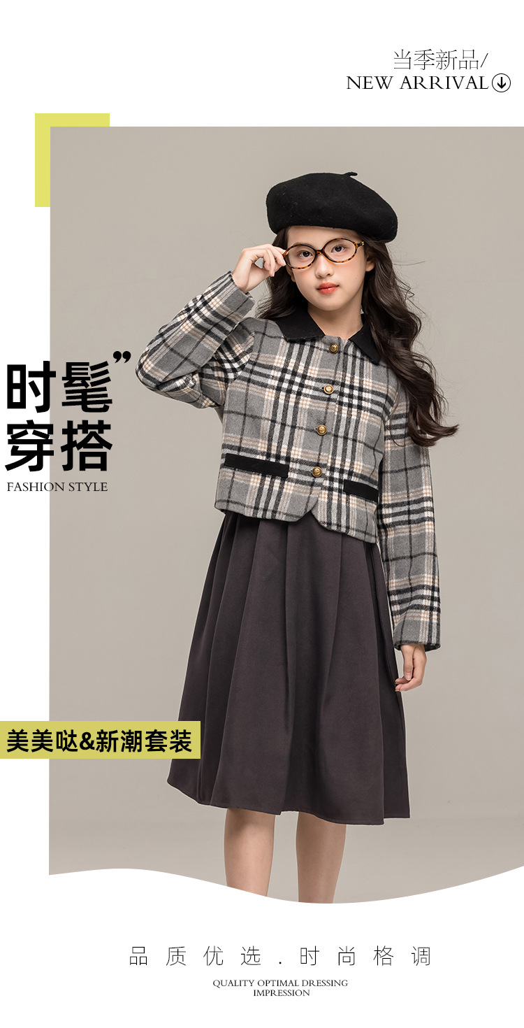 24 가을 겨울 새로운 소녀 패션 투피스 세트 두꺼운 모직 코트 높은 허리 주름 치마 작은 샤넬 스타일 세트