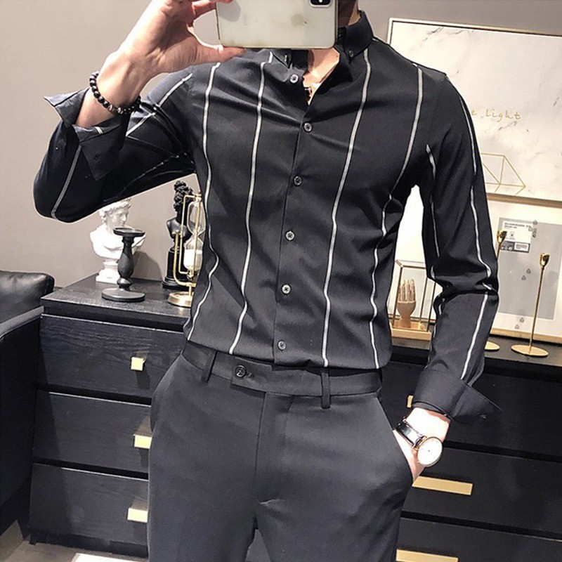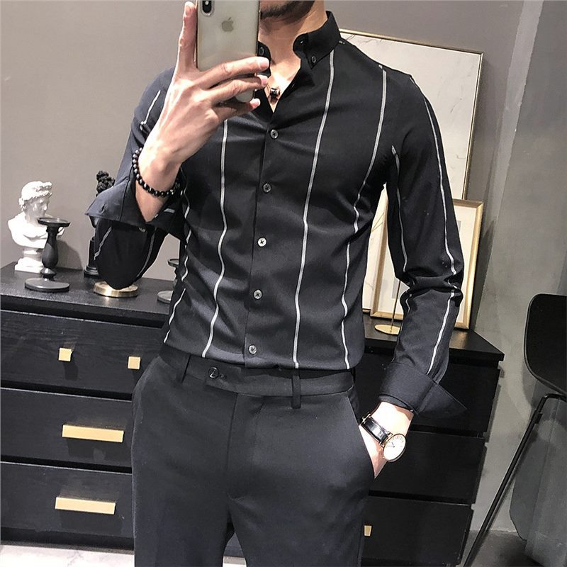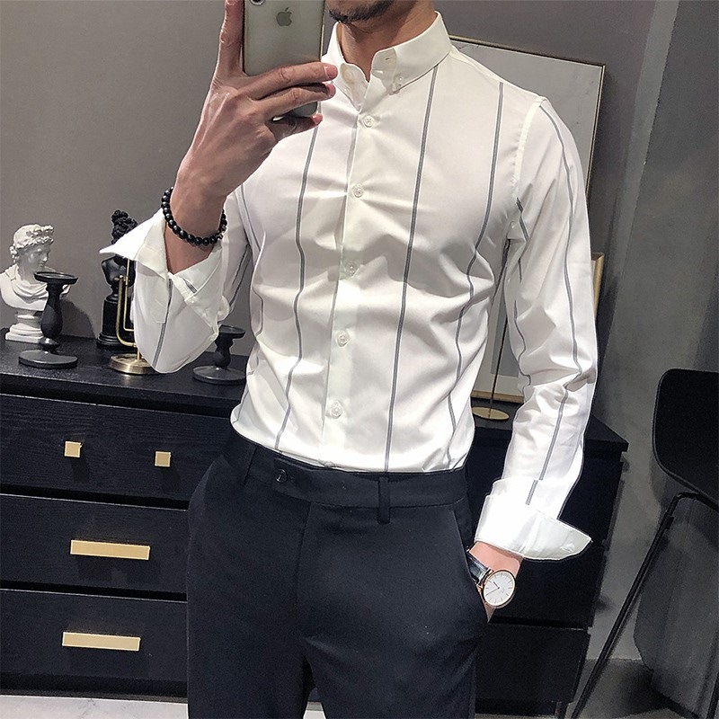 봄과 가을 슬림 핏 셔츠 남성용 하이 엔드 긴팔 줄무늬 흰색 셔츠 유행 비 다림질 셔츠 비즈니스 남성