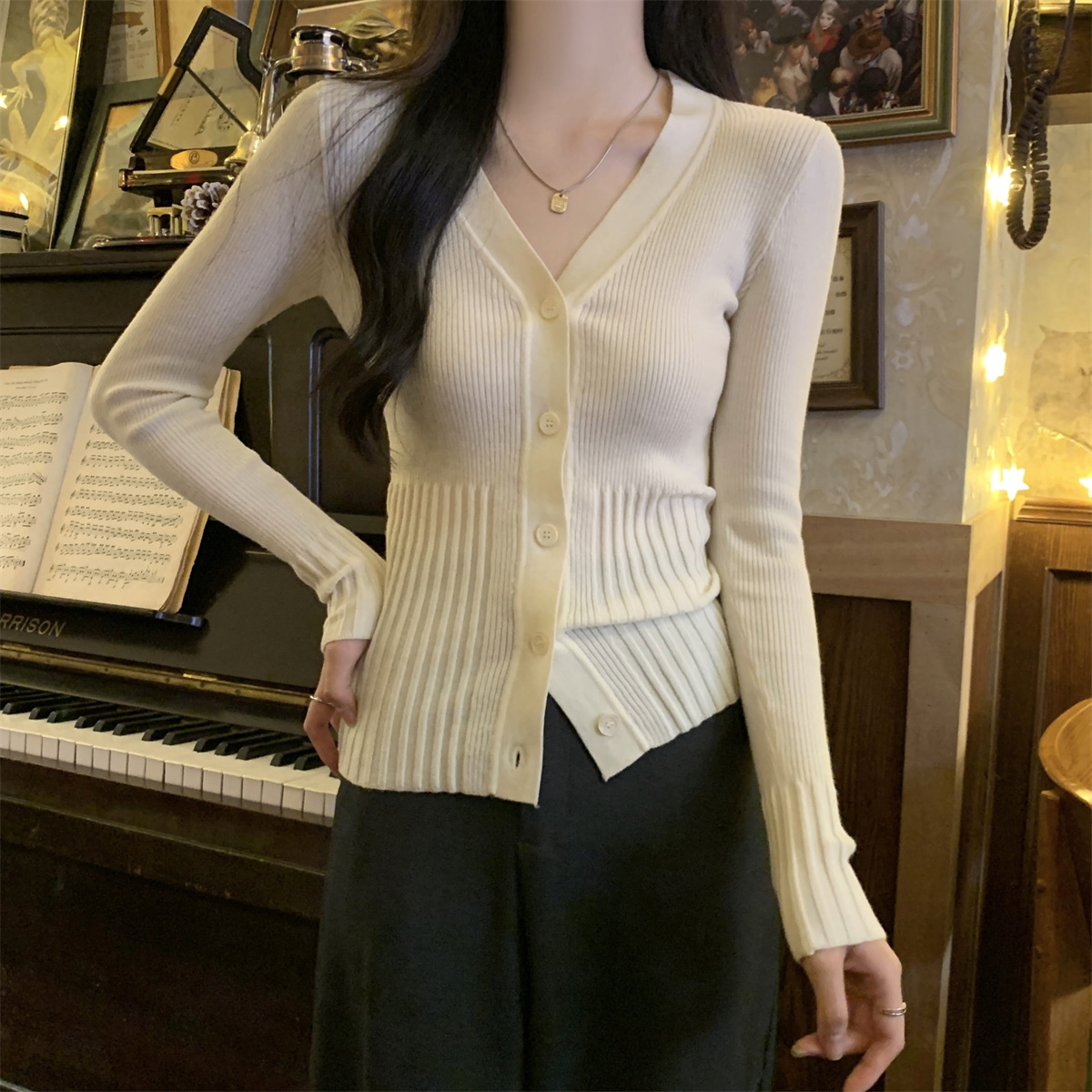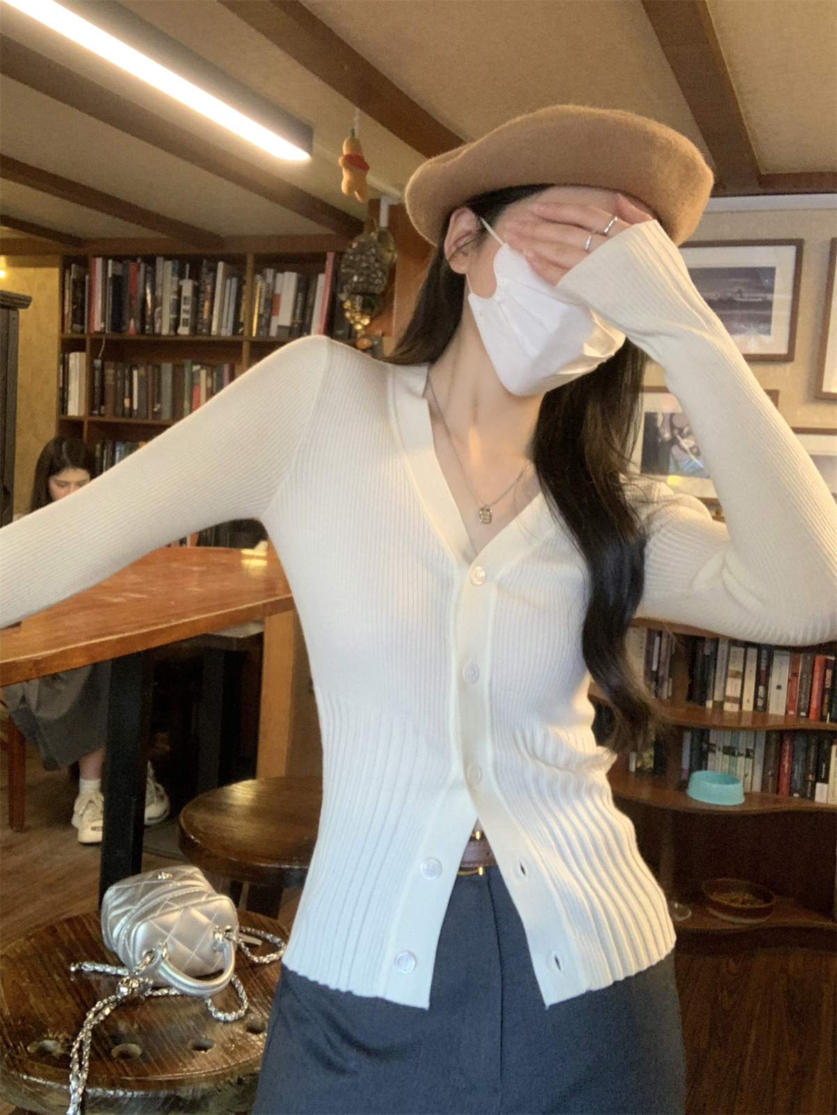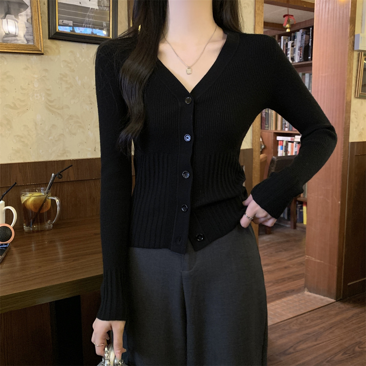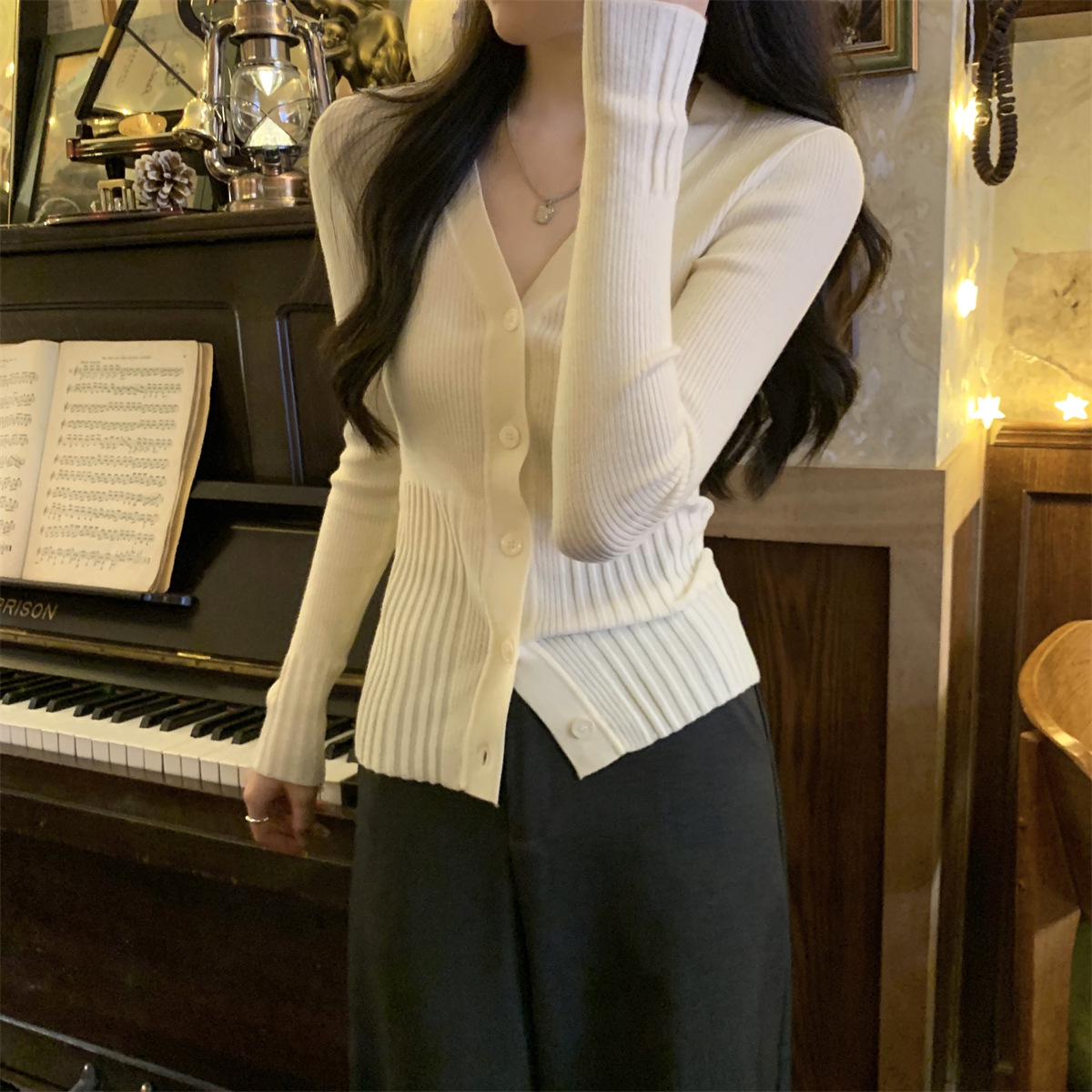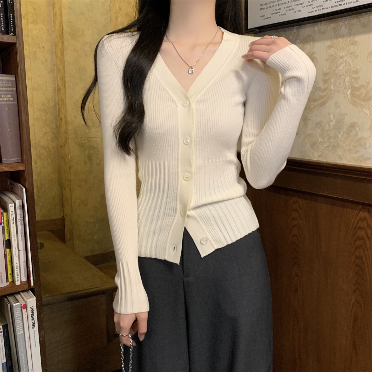 가을 V 넥 우아한 디자인 니트 내부 카디건 여성의 슬림 핏 얇은 기본 셔츠 이른 가을 탑스토어 가기