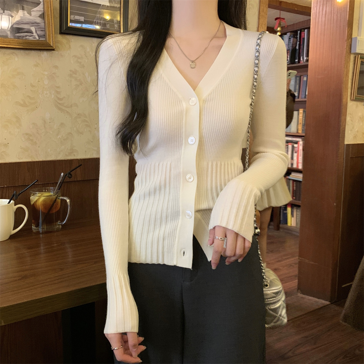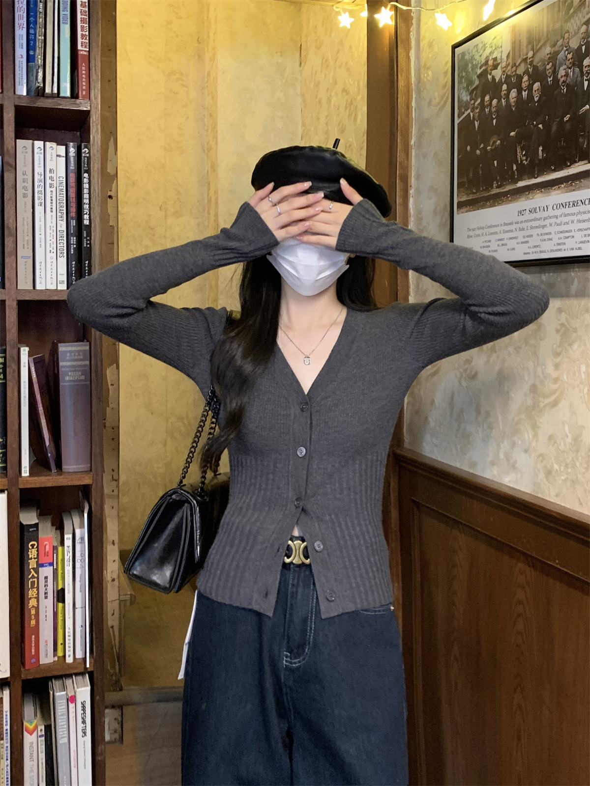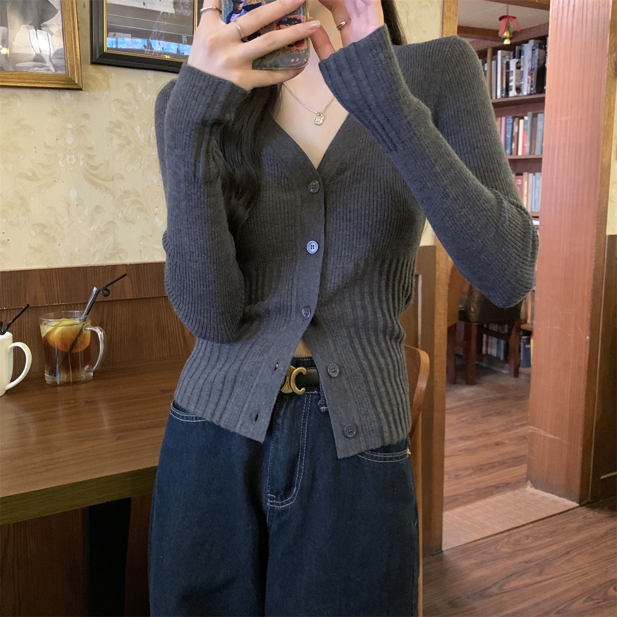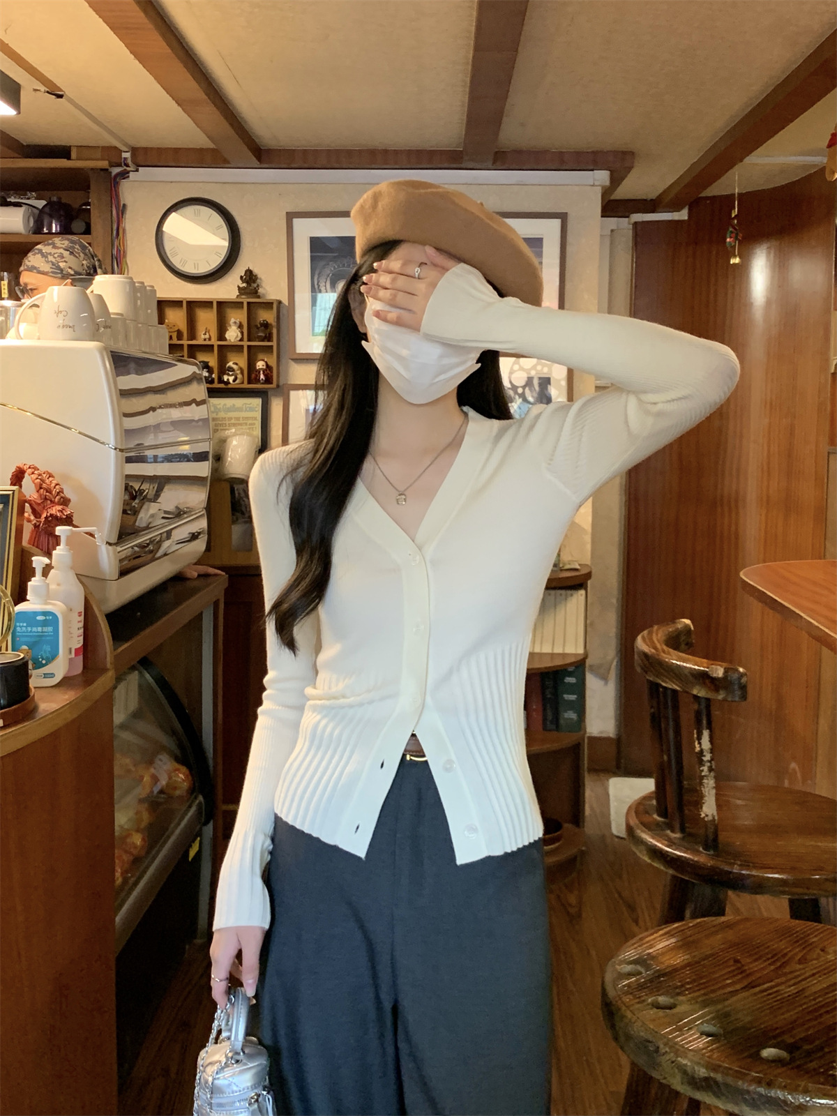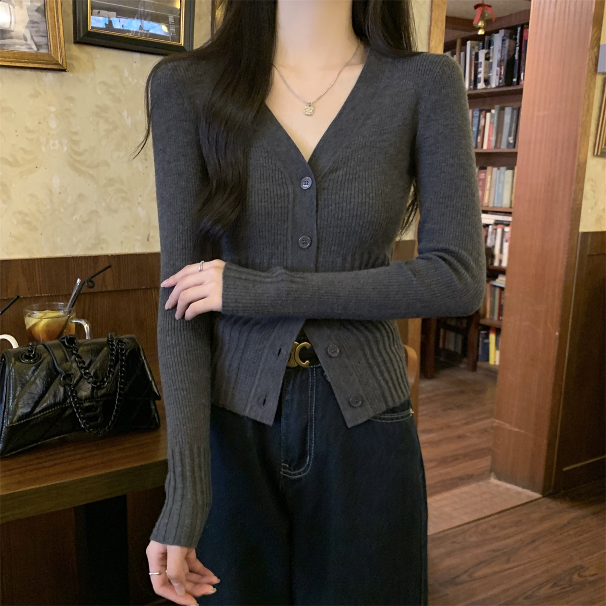 가을 V 넥 우아한 디자인 니트 내부 카디건 여성의 슬림 핏 얇은 기본 셔츠 이른 가을 탑스토어 가기