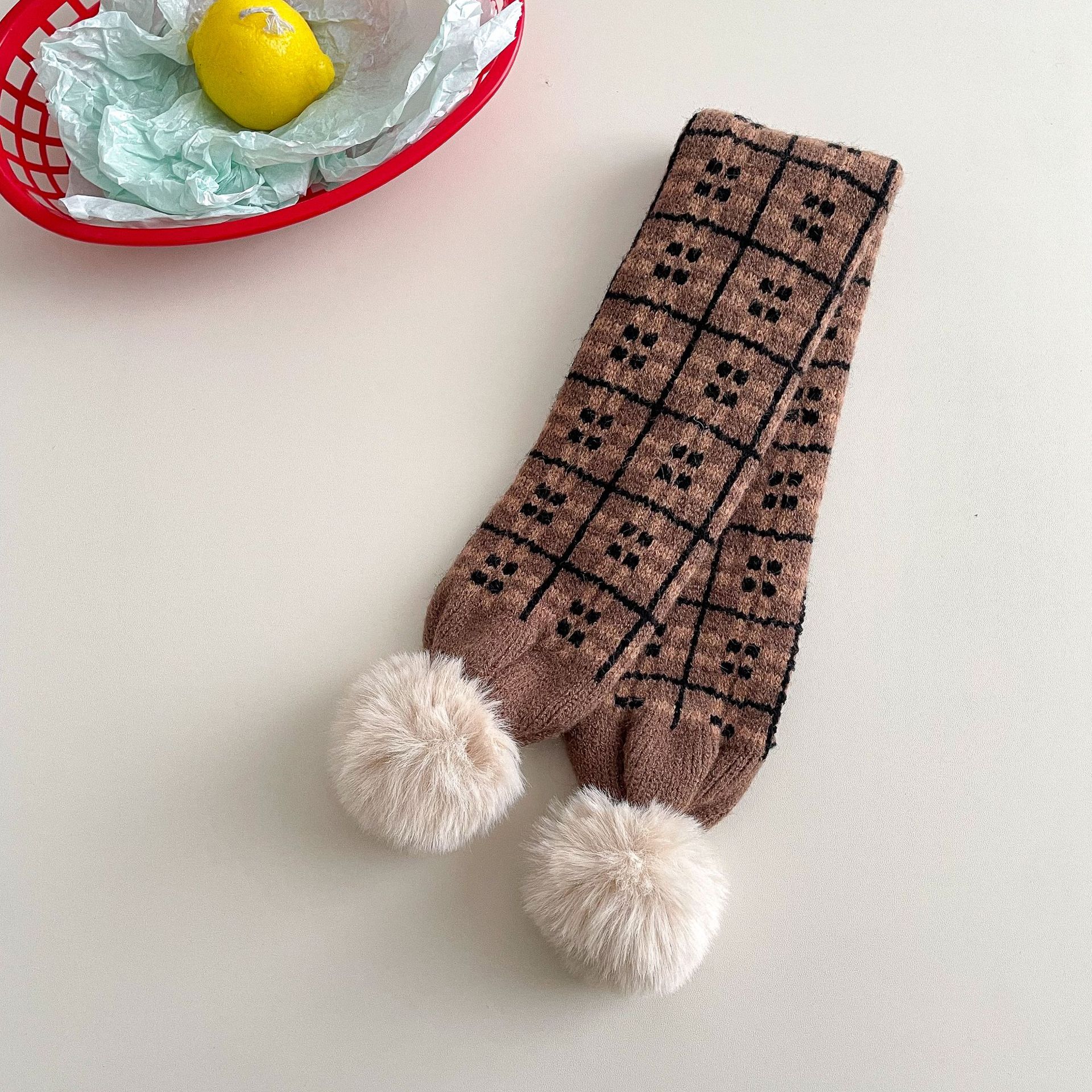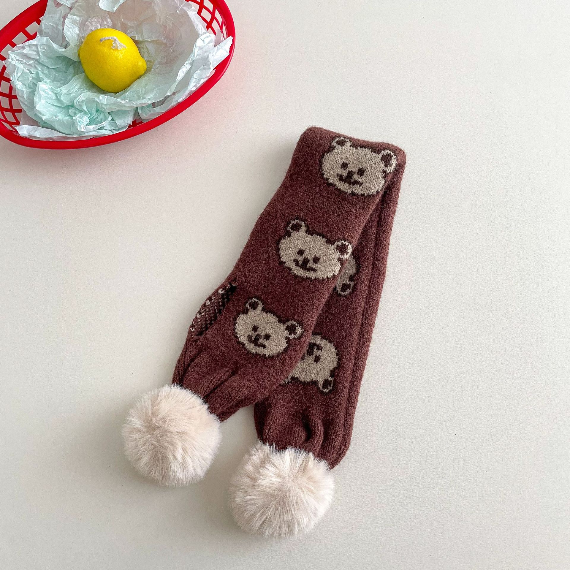 • 어린이 모피 볼 니트 스카프 - 갈색 곰 머리
