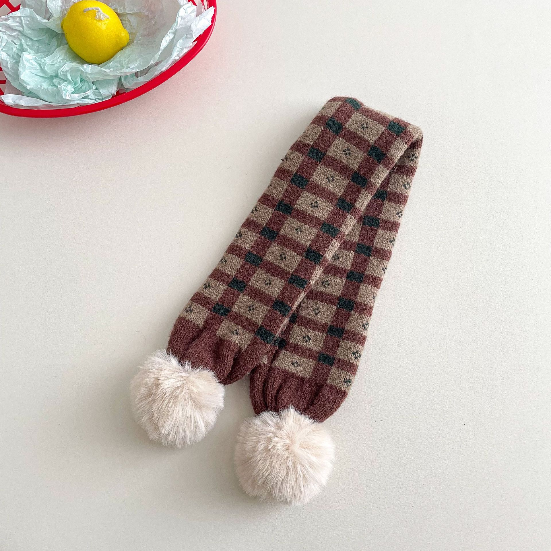 • 아동용 퍼볼 니트 스카프 - 카헤이 체크무늬